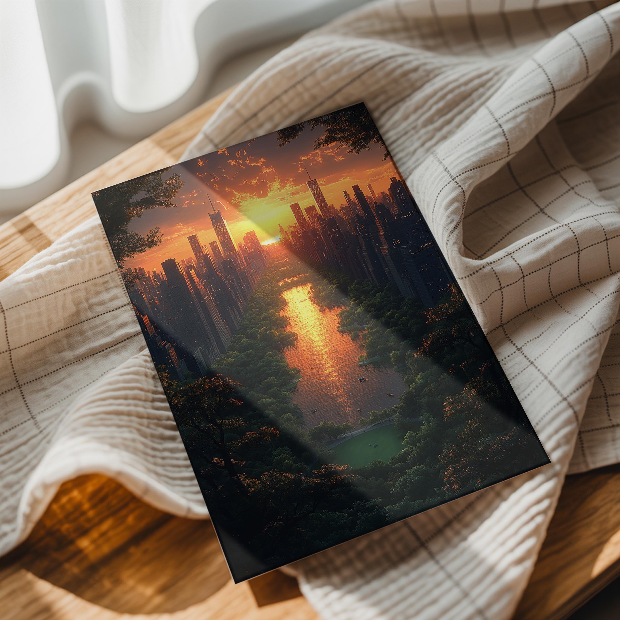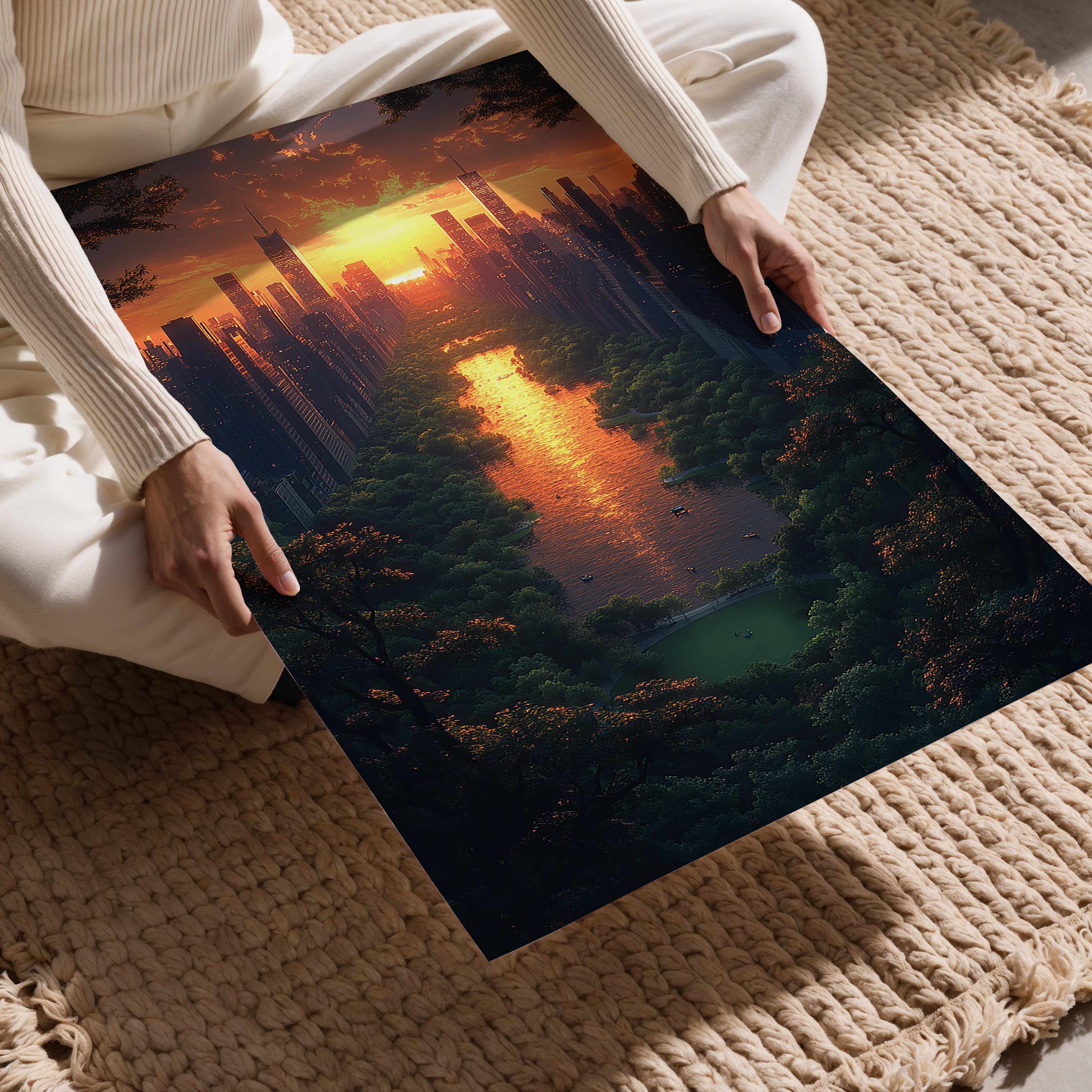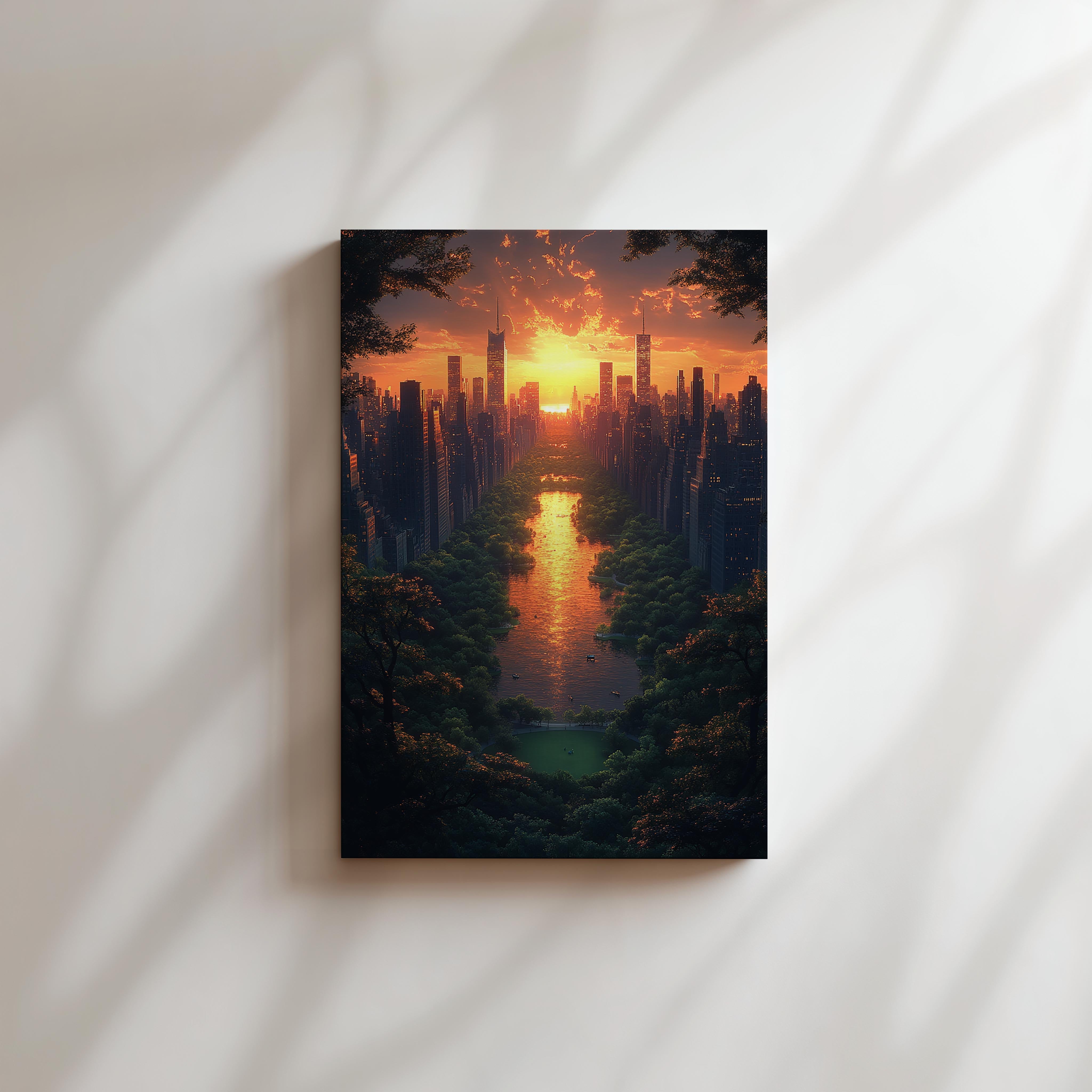 A mesmerizing sunset view of Central Park with golden hues casting a glow on the winding waterway, flanked by lush greenery and skyscrapers. The blend of nature and urban architecture creates a sophisticated atmosphere. This art piece is ideal for modern living spaces, art enthusiasts, or anyone captivated by urban landscapes with a touch of tranquility.