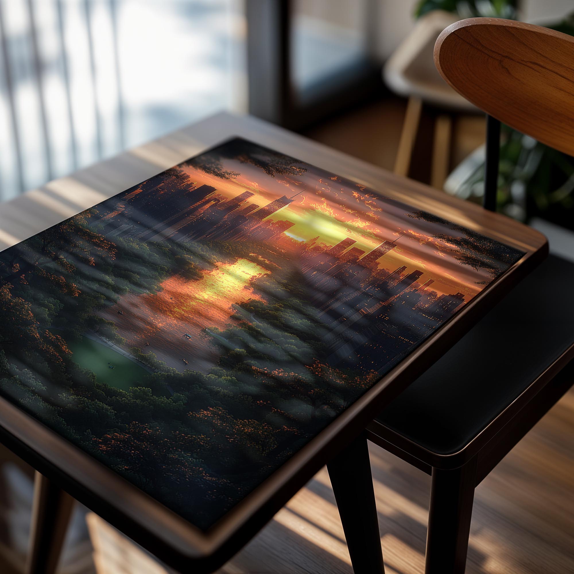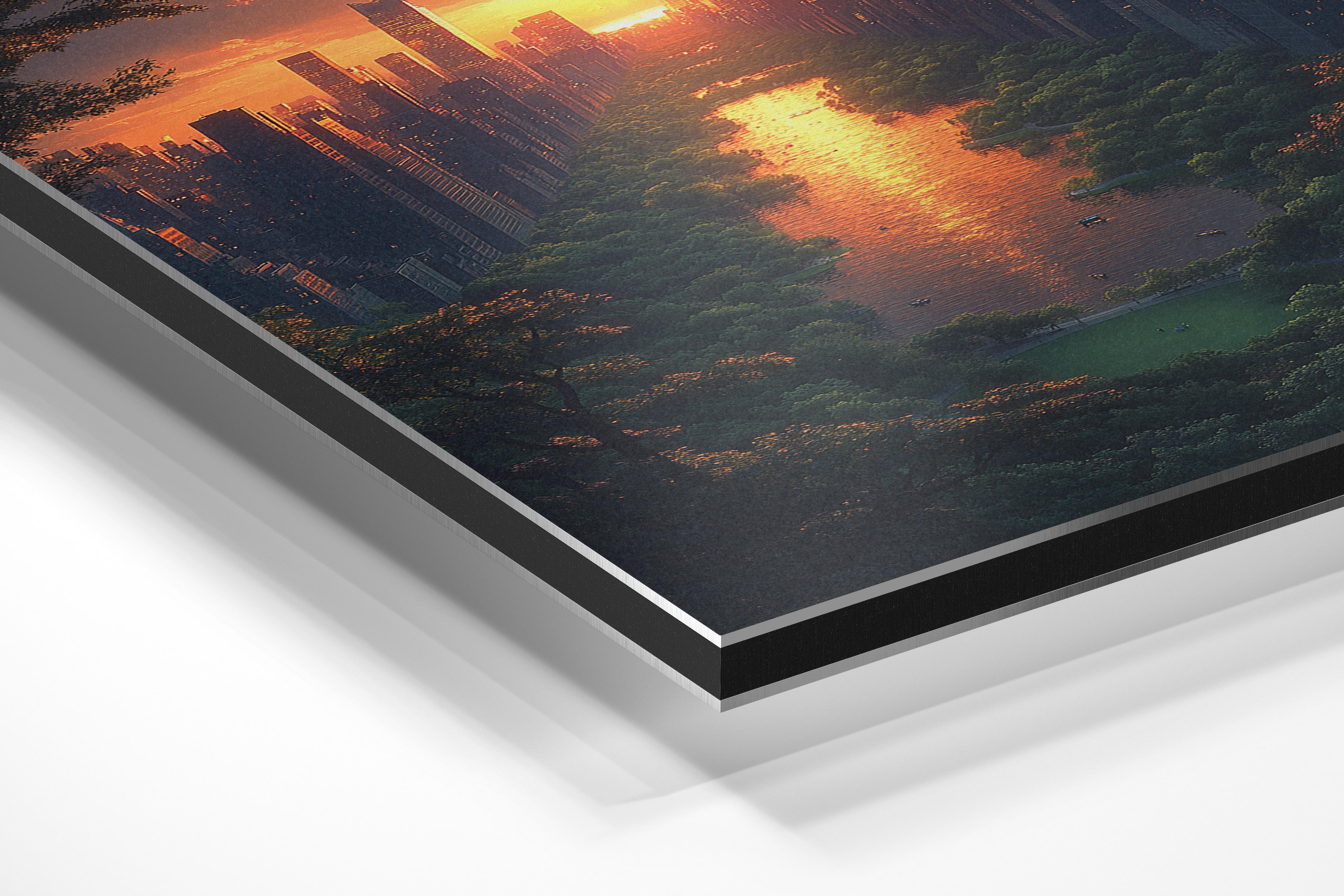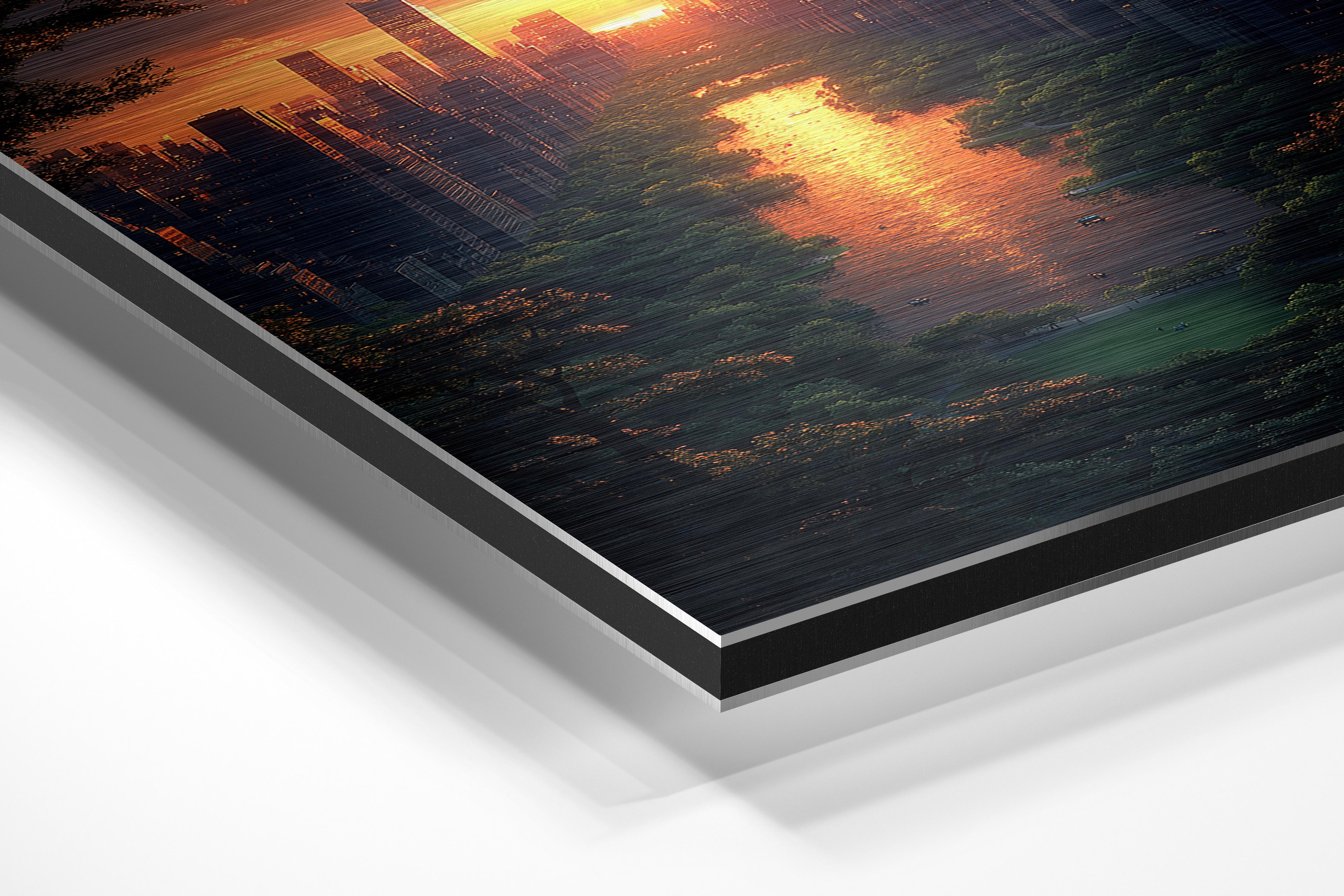 A mesmerizing sunset view of Central Park with golden hues casting a glow on the winding waterway, flanked by lush greenery and skyscrapers. The blend of nature and urban architecture creates a sophisticated atmosphere. This art piece is ideal for modern living spaces, art enthusiasts, or anyone captivated by urban landscapes with a touch of tranquility.