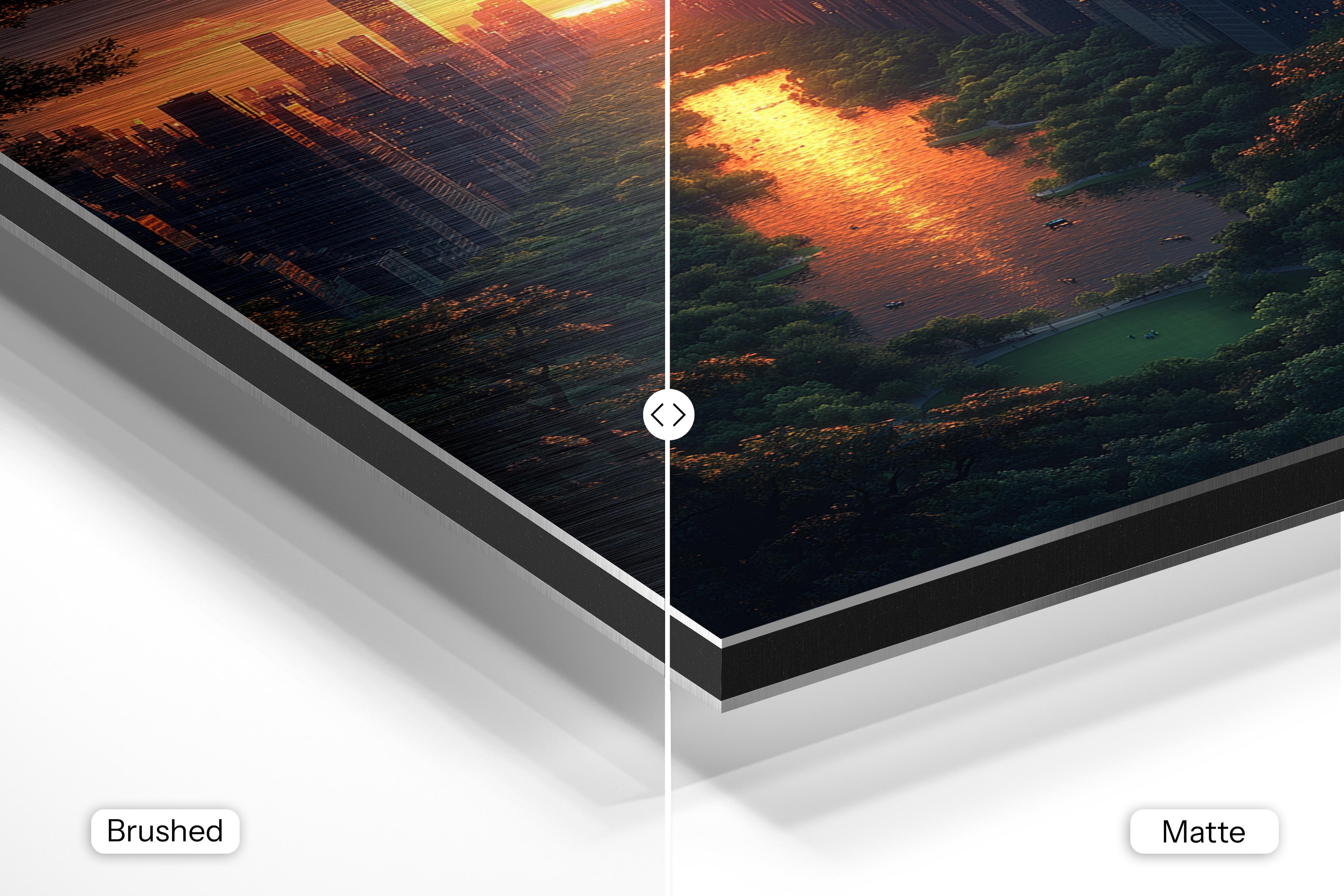 - Matte Aluminum offers a smooth, bright white surface that delivers crisp details and vibrant, true-to-life colors. With its non-reflective finish and subtle silky sheen, it’s perfect for photography, portraits, and colorful artwork—bringing a clean, polished look to any interior.