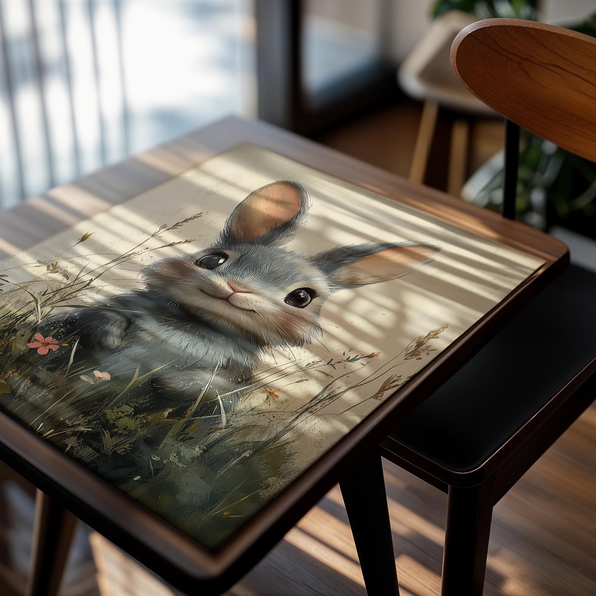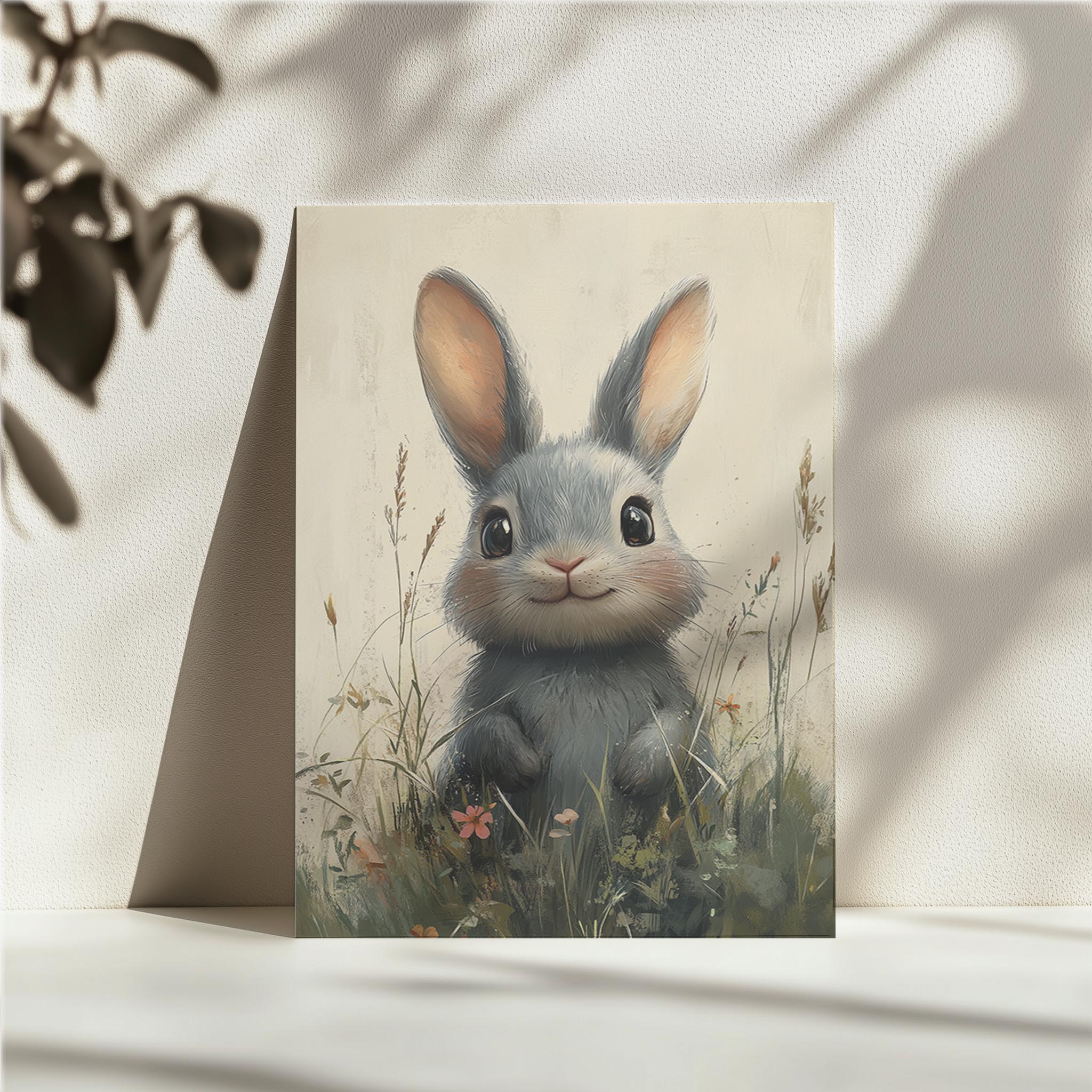 This delightful image captures an adorable rabbit nestled within a field of wild grasses and flowers. The soft lighting and subtle color palette lend a dreamy and storybook-like quality to the piece. The rabbit's expressive eyes and delicate fur details make it a heartwarming addition to any space. Whether displayed in a child’s bedroom, a cozy reading nook, or a nature-inspired decor setting, this artwork brings warmth, innocence, and charm to any environment.
