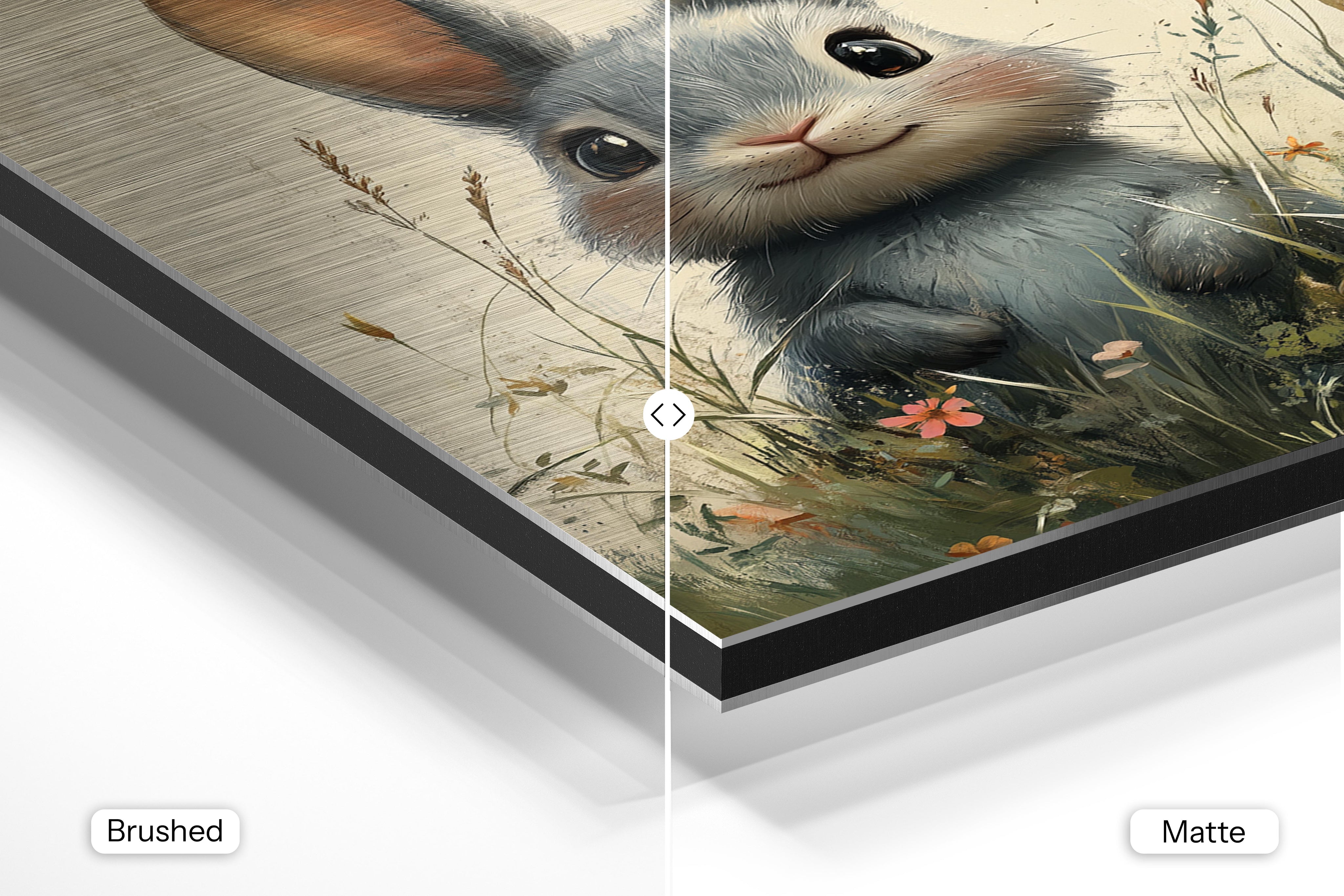 - Matte Aluminum offers a smooth, bright white surface that delivers crisp details and vibrant, true-to-life colors. With its non-reflective finish and subtle silky sheen, it’s perfect for photography, portraits, and colorful artwork—bringing a clean, polished look to any interior.