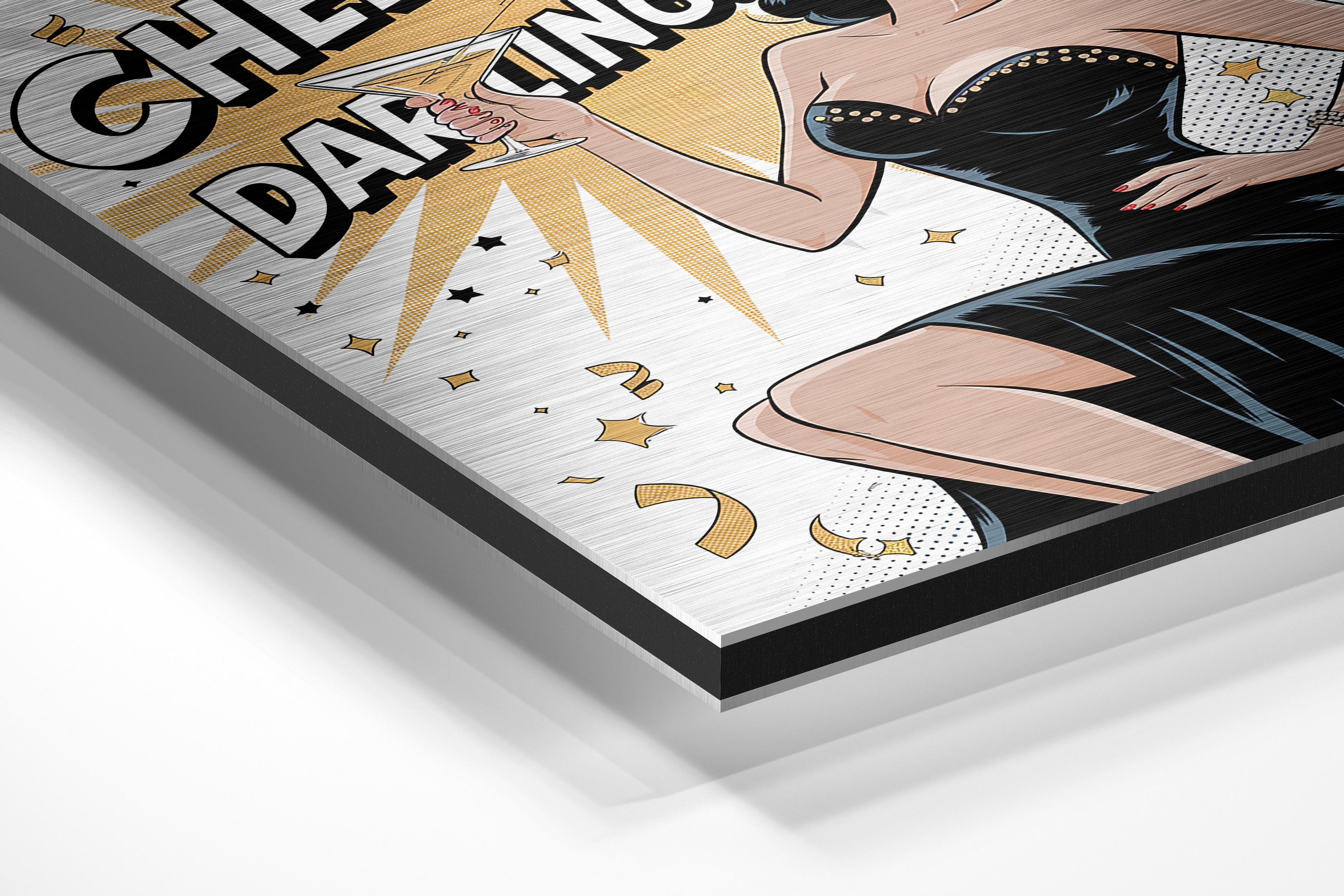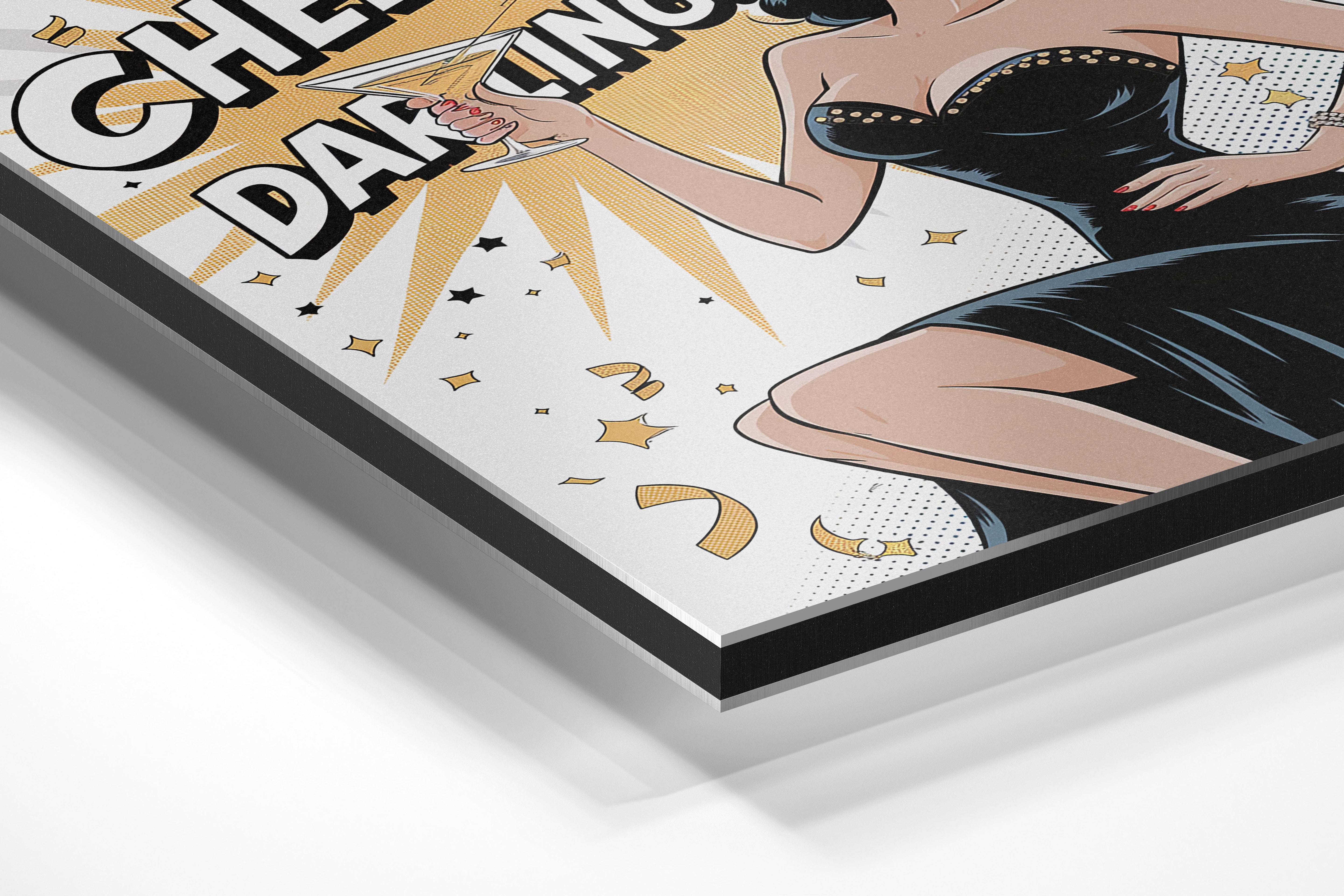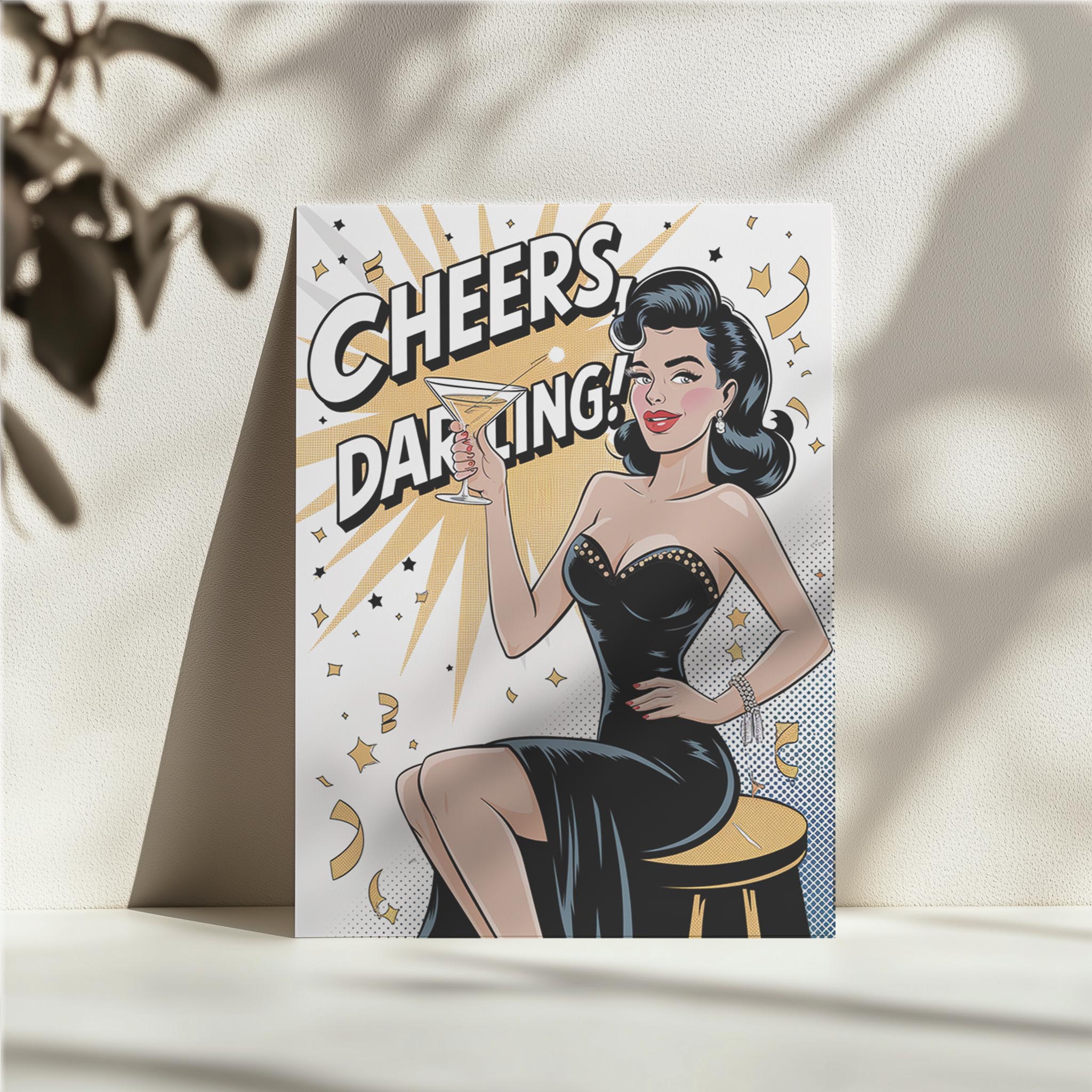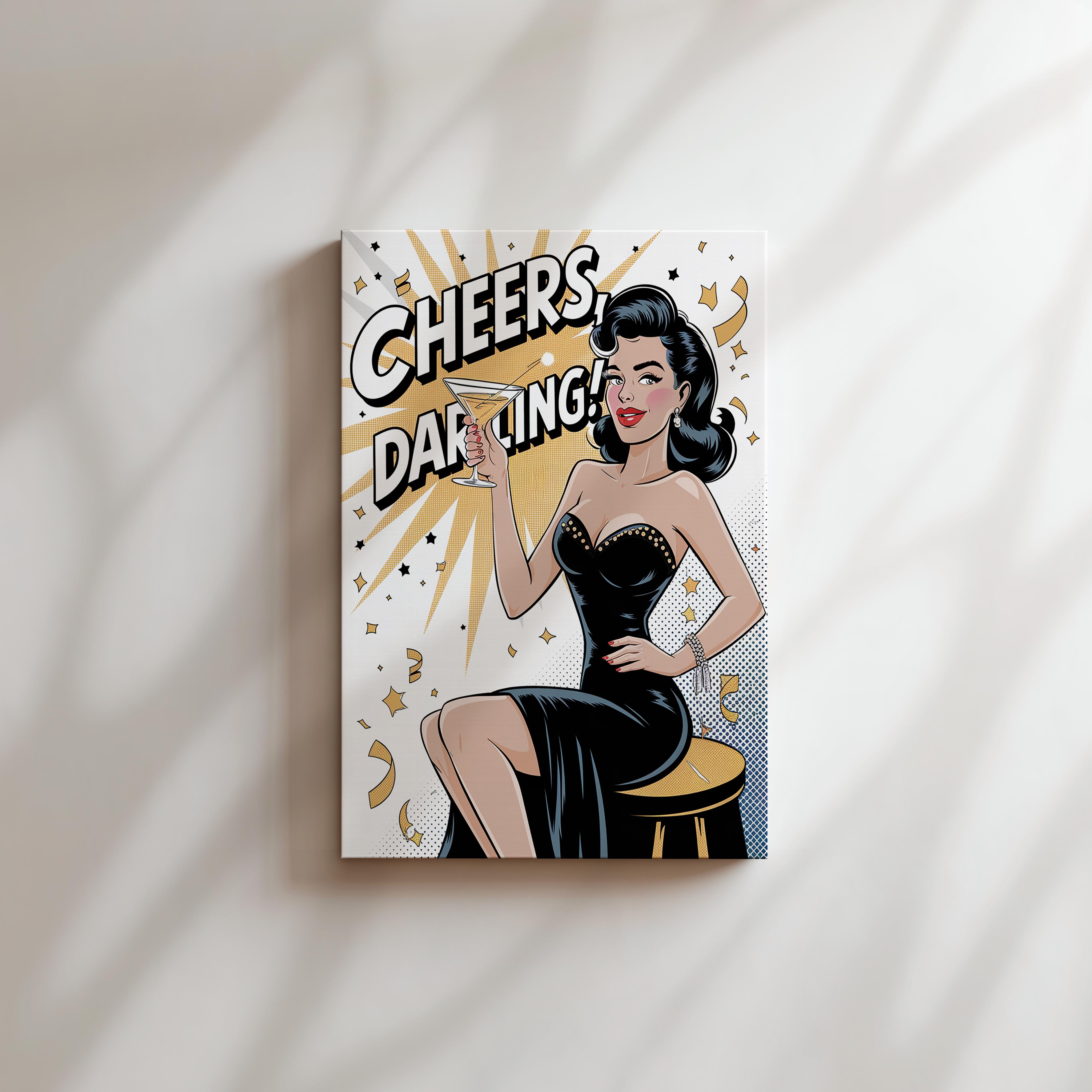 A stylish pinup woman toasting with glamour in this pop art piece, ideal for bars or vanity rooms. It evokes vintage charm with modern sass and celebration energy.