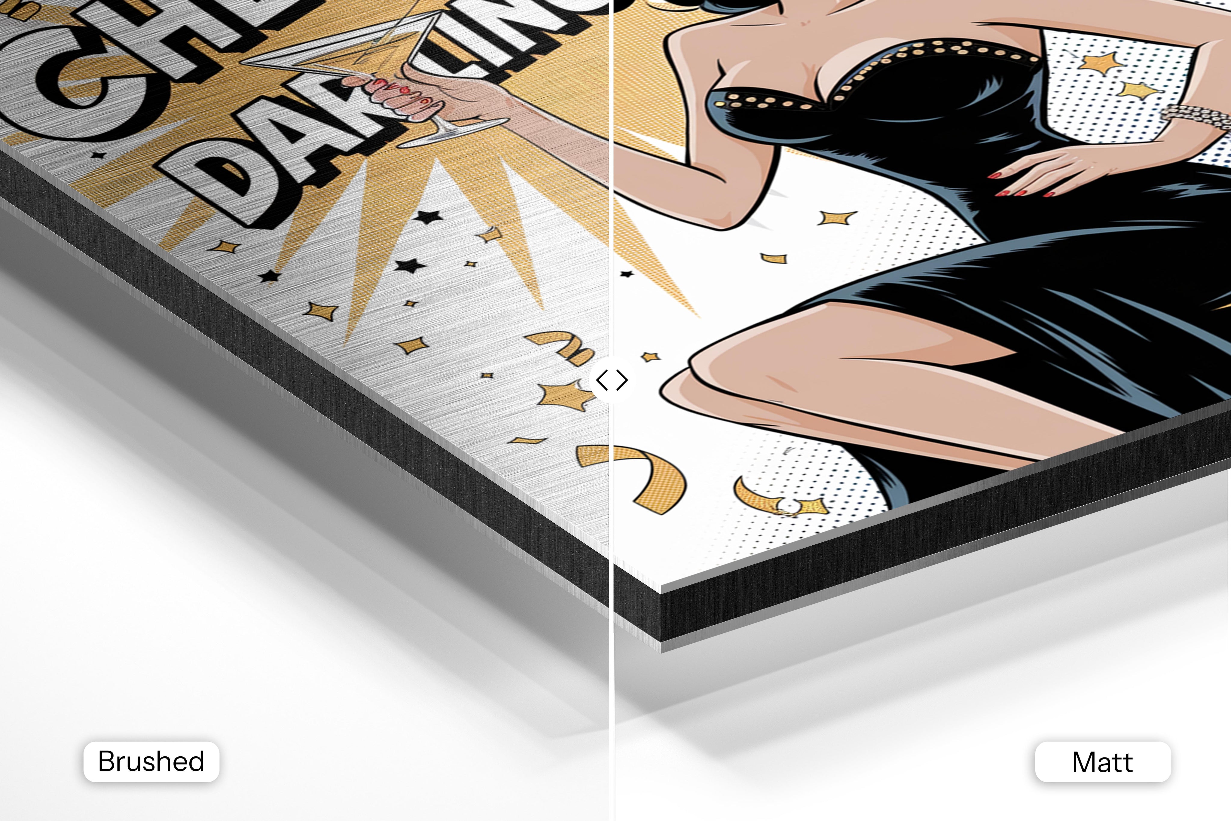 - Brushed Aluminum, on the other hand, features a raw metallic texture with visible brush strokes. Whites and highlights in your image let the silver surface show through, adding a dramatic, shimmering effect. Ideal for black-and-white images, minimalist designs, or abstract art, it creates a bold, industrial vibe with a modern edge.