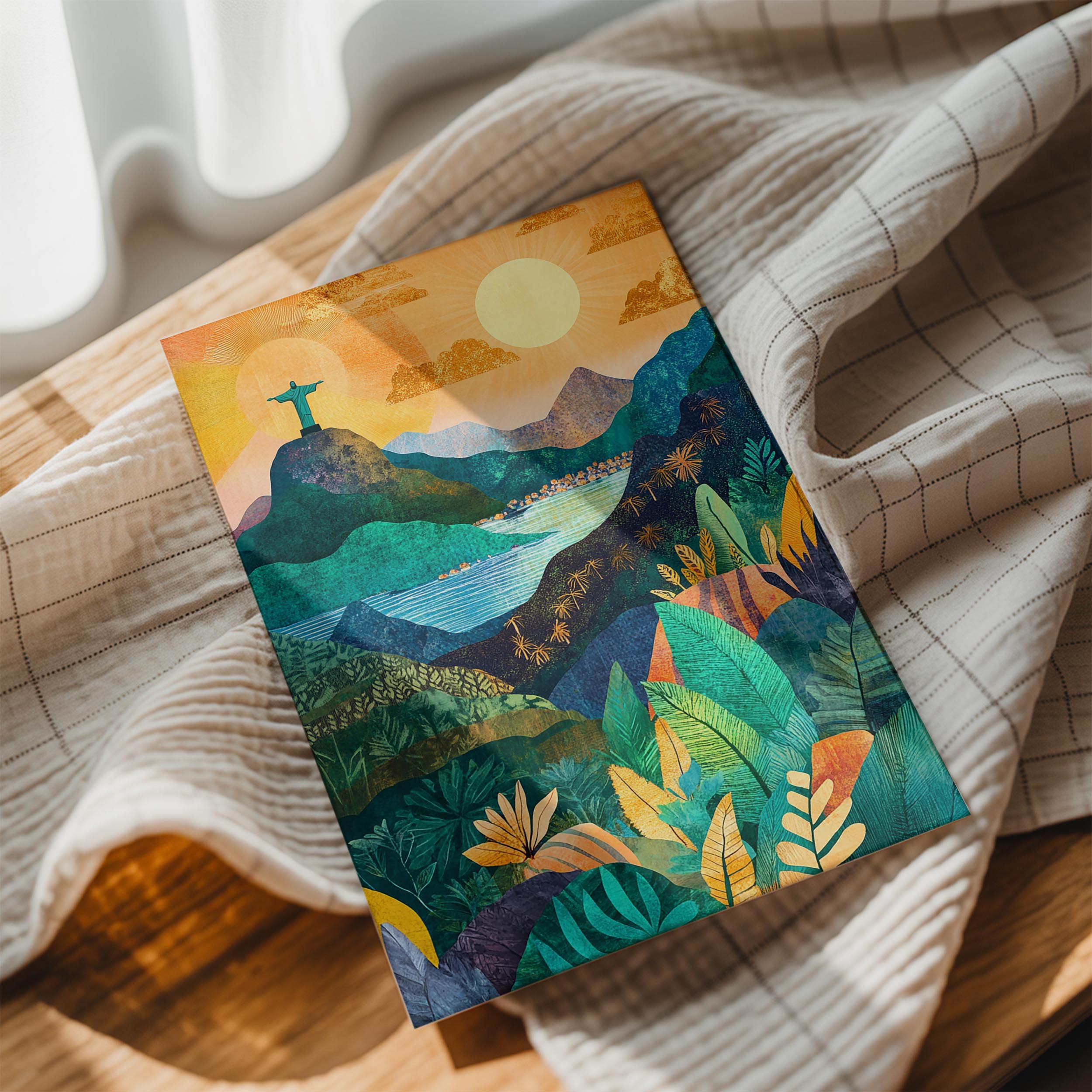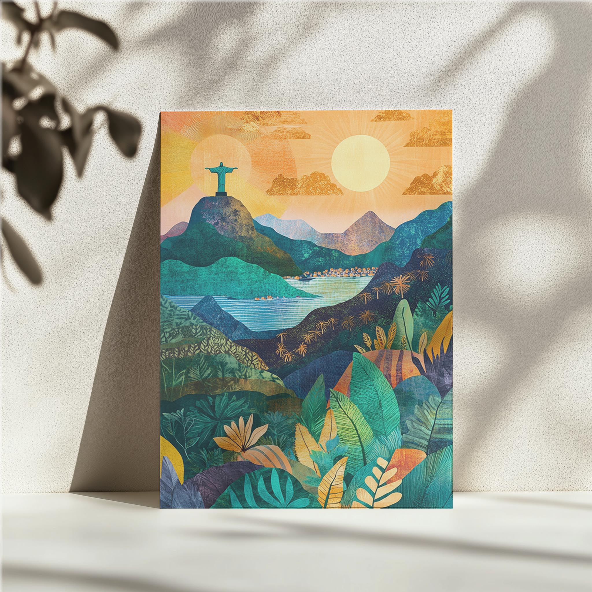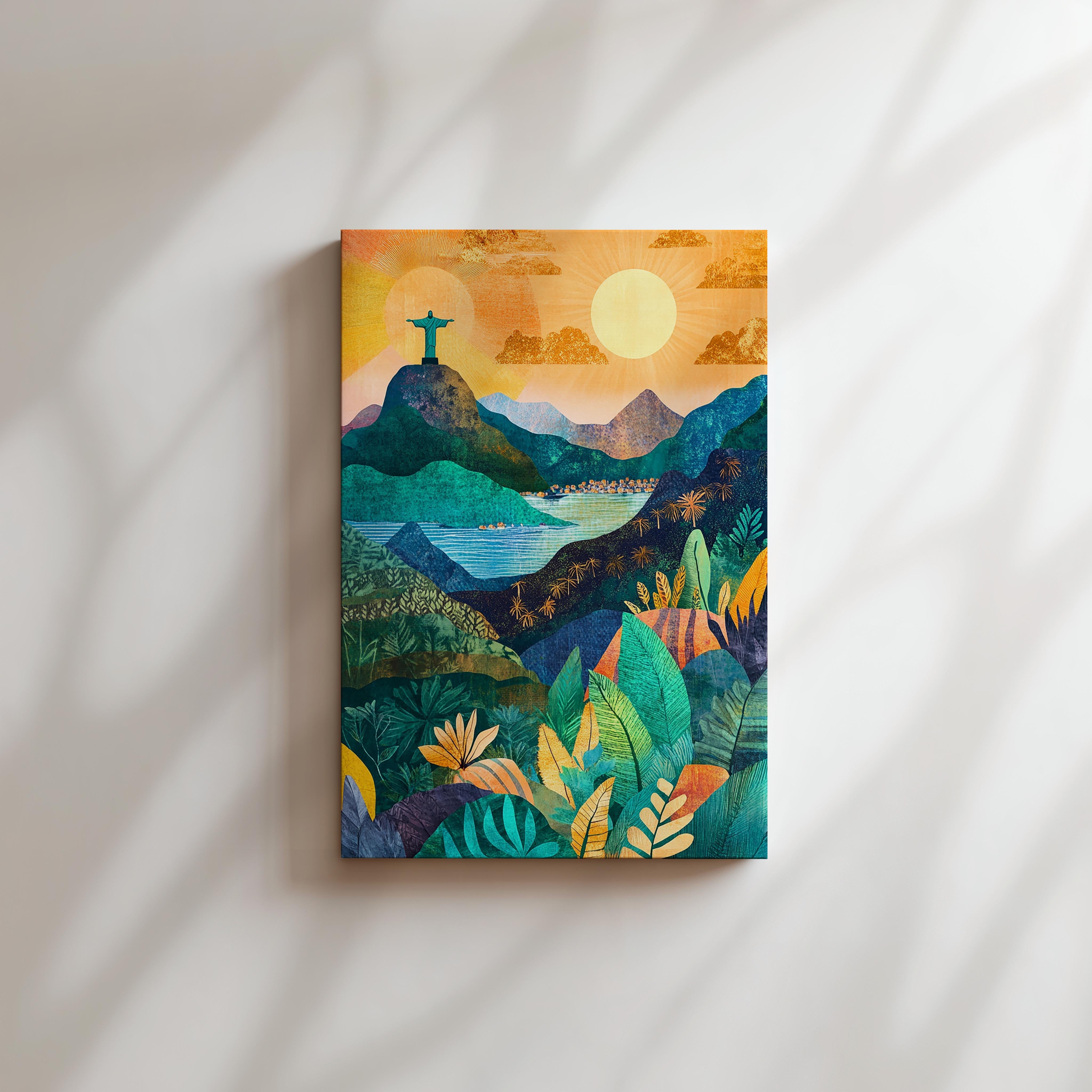 An enchanting artwork capturing the Christ the Redeemer statue in Rio de Janeiro bathed in the golden glow of sunrise. The vibrant palette of orange, yellow, and green hues highlights the natural beauty of Brazil's lush landscapes. This piece radiates serenity and inspiration, making it perfect for cultural spaces or homes celebrating travel and faith. The detailed depiction of mountains and foliage adds depth and a harmonious connection to nature.