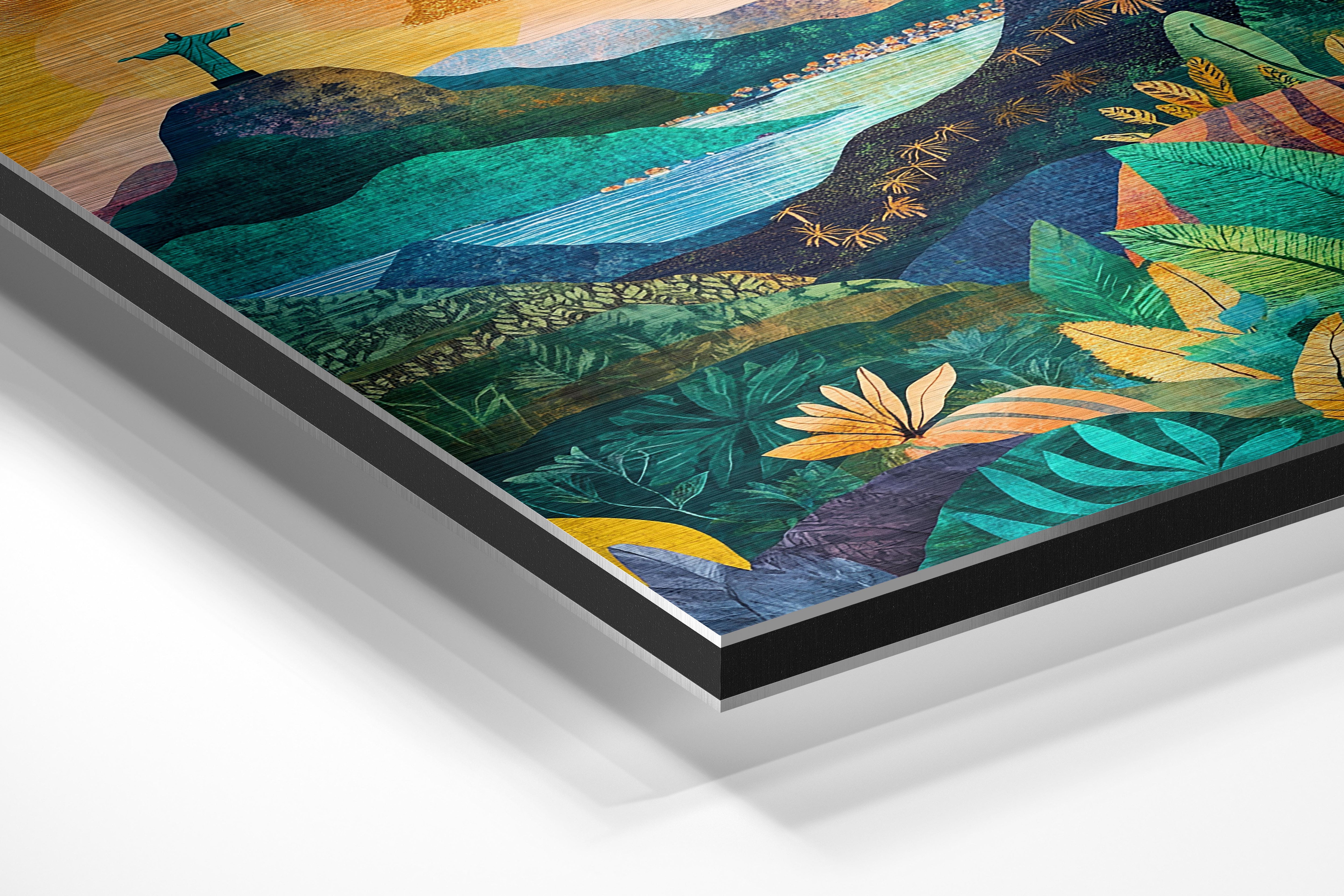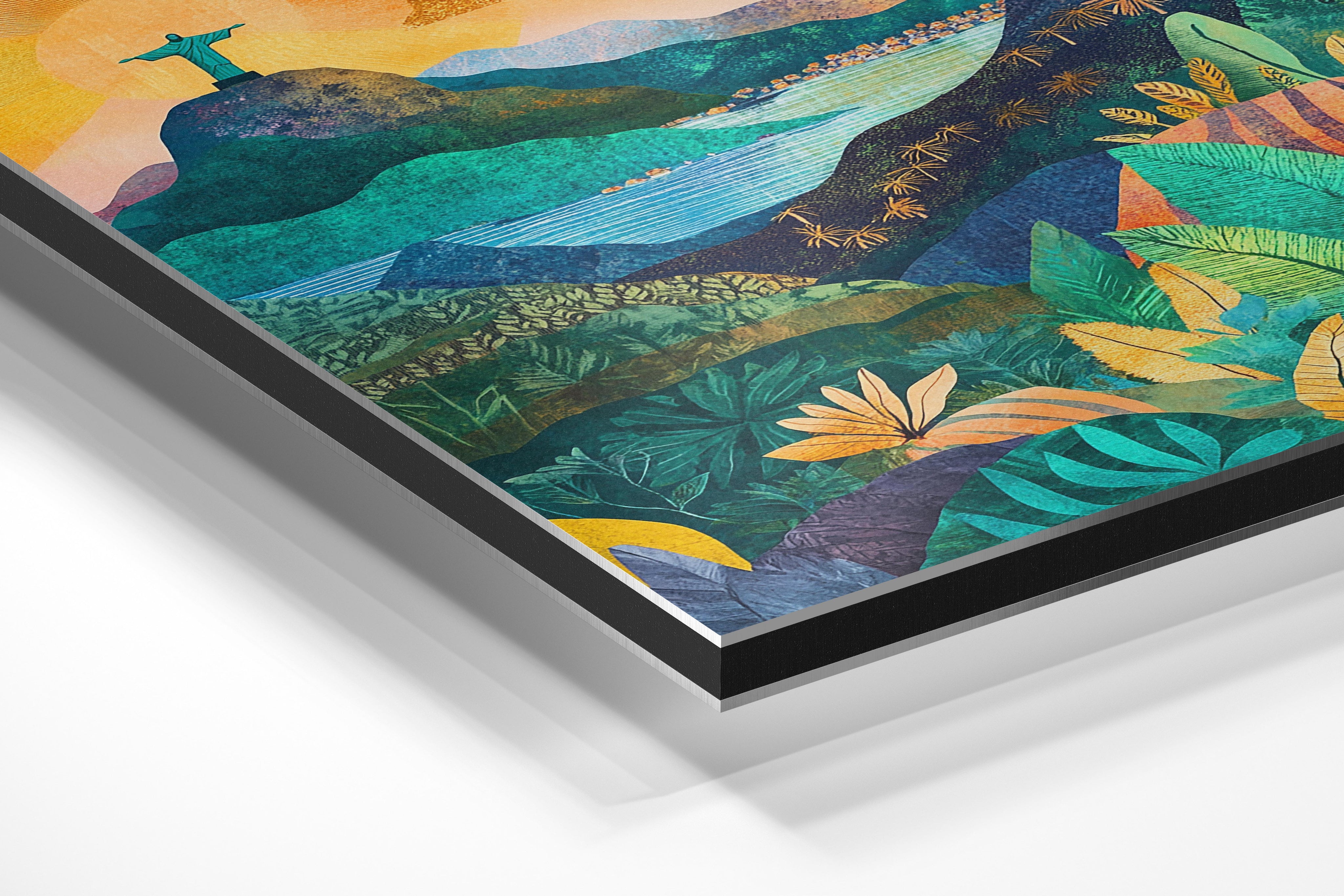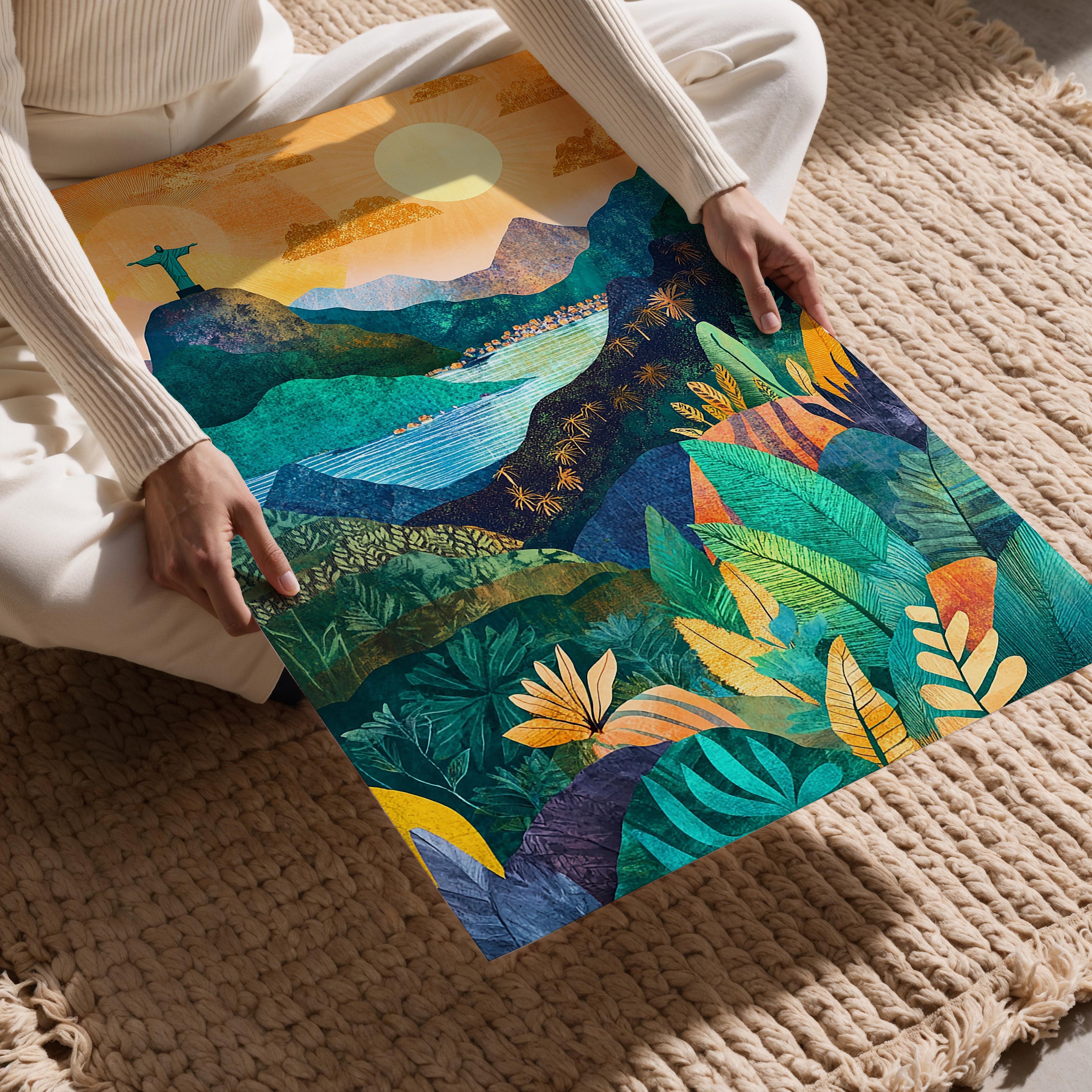 An enchanting artwork capturing the Christ the Redeemer statue in Rio de Janeiro bathed in the golden glow of sunrise. The vibrant palette of orange, yellow, and green hues highlights the natural beauty of Brazil's lush landscapes. This piece radiates serenity and inspiration, making it perfect for cultural spaces or homes celebrating travel and faith. The detailed depiction of mountains and foliage adds depth and a harmonious connection to nature.