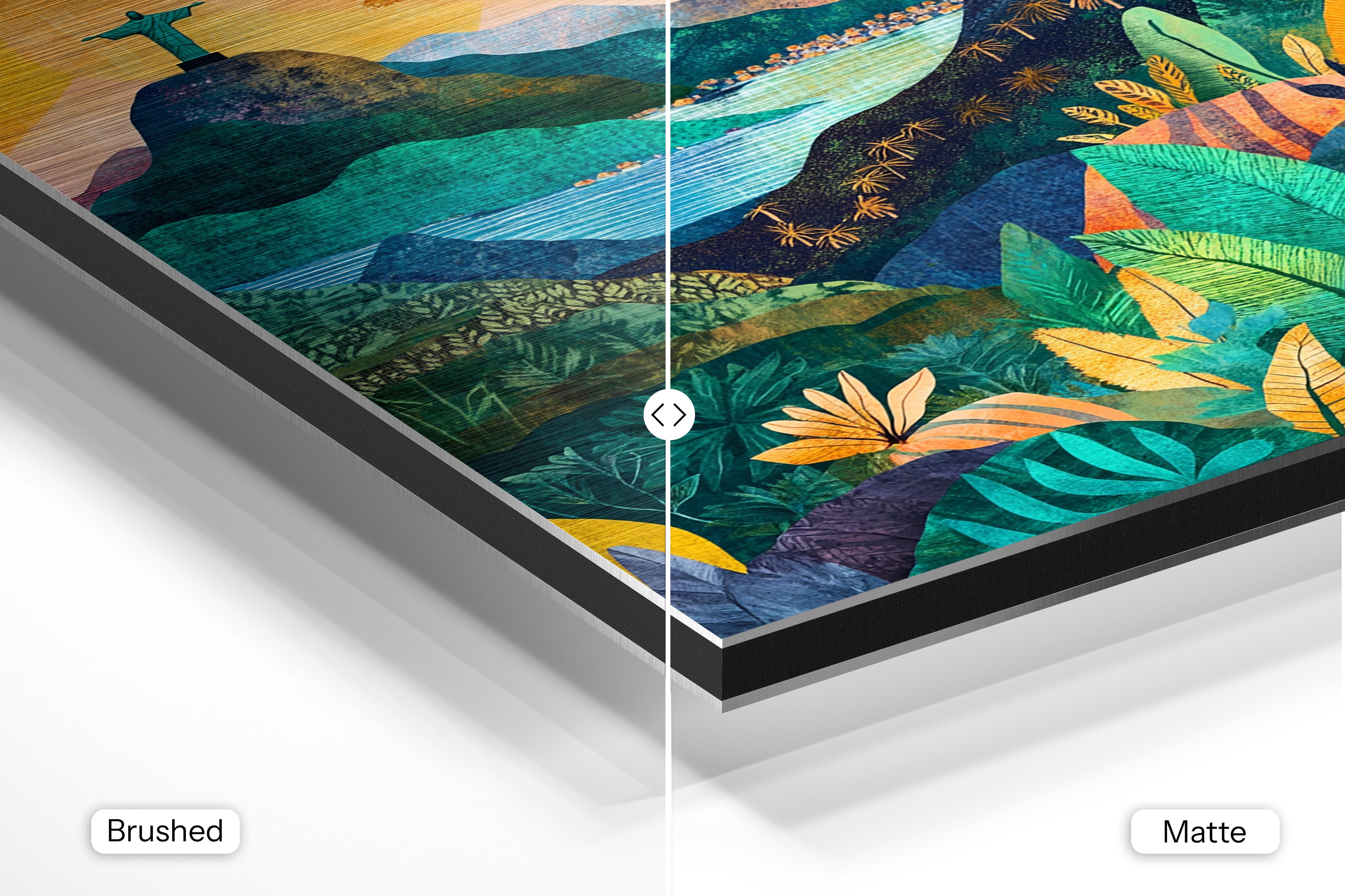 - Brushed Aluminum, on the other hand, features a raw metallic texture with visible brush strokes. Whites and highlights in your image let the silver surface show through, adding a dramatic, shimmering effect. Ideal for black-and-white images, minimalist designs, or abstract art, it creates a bold, industrial vibe with a modern edge.