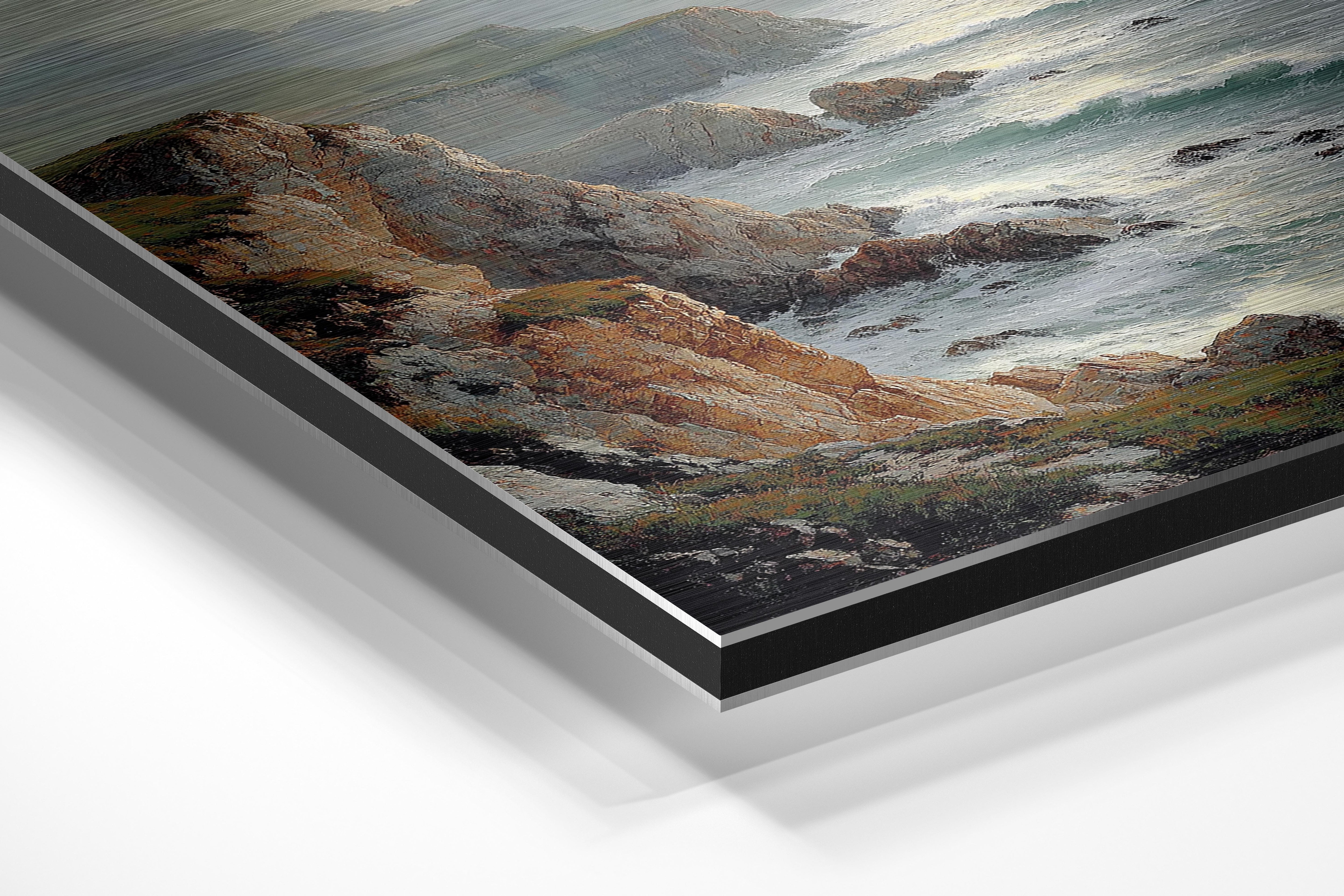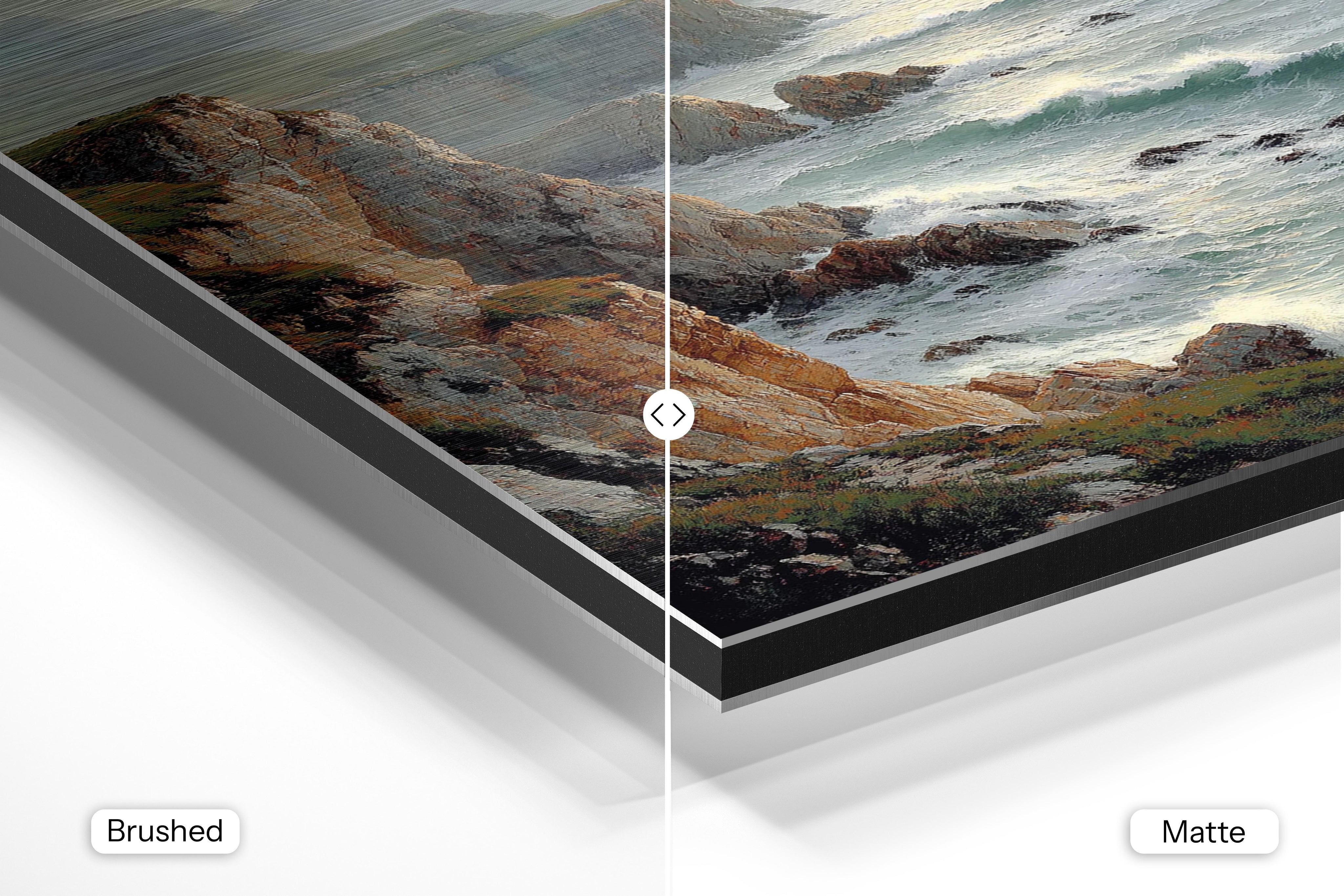 - Brushed Aluminum, on the other hand, features a raw metallic texture with visible brush strokes. Whites and highlights in your image let the silver surface show through, adding a dramatic, shimmering effect. Ideal for black-and-white images, minimalist designs, or abstract art, it creates a bold, industrial vibe with a modern edge.
