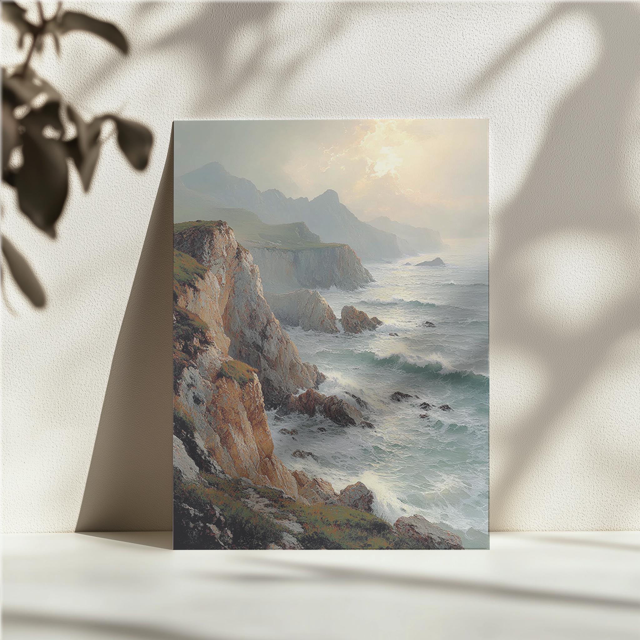Soaring cliffs overlook the serene ocean waves in this breathtaking coastal view. The tranquil waters and rugged cliff faces create a harmonious balance, ideal for evoking a sense of peace and wonder in nature lovers.