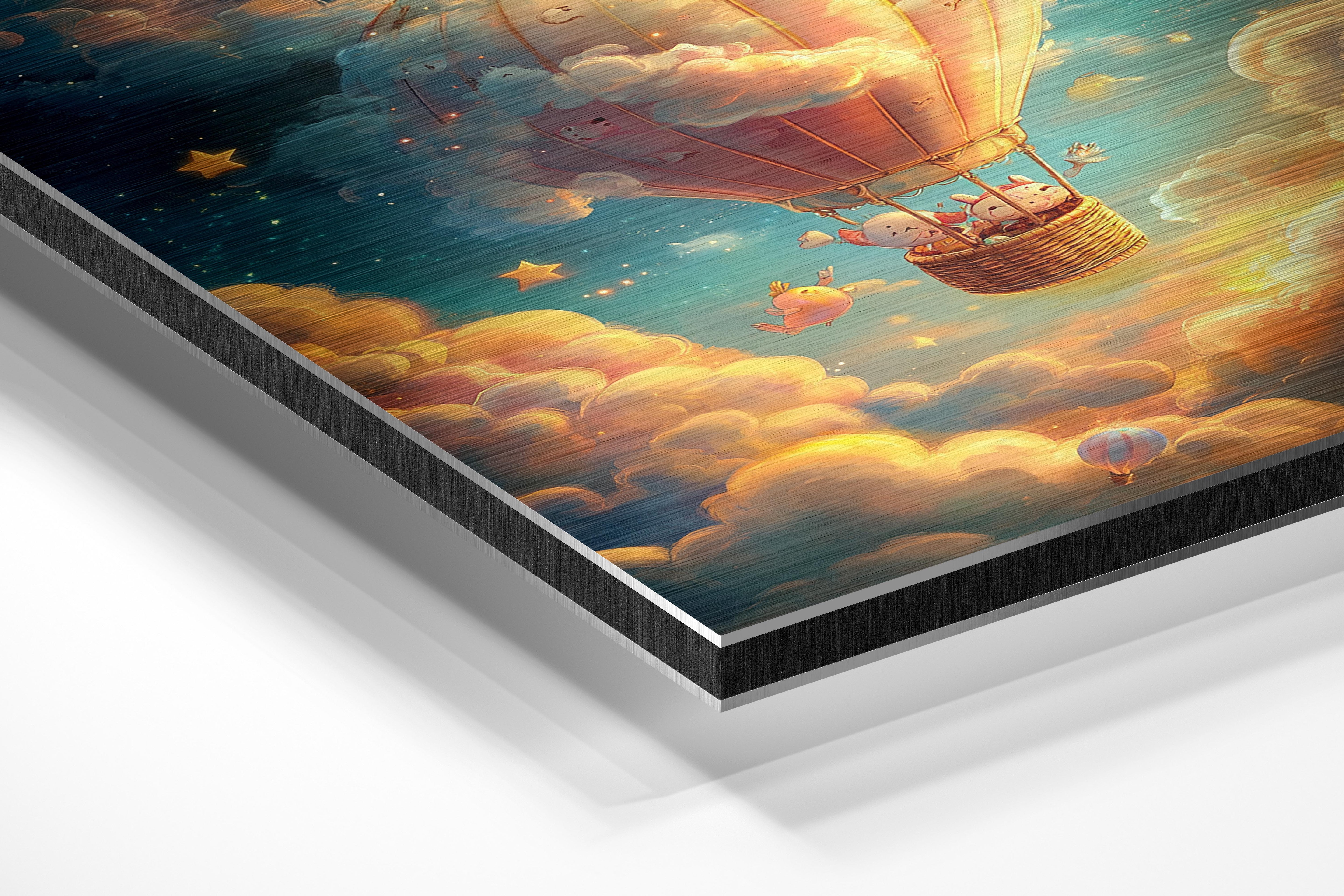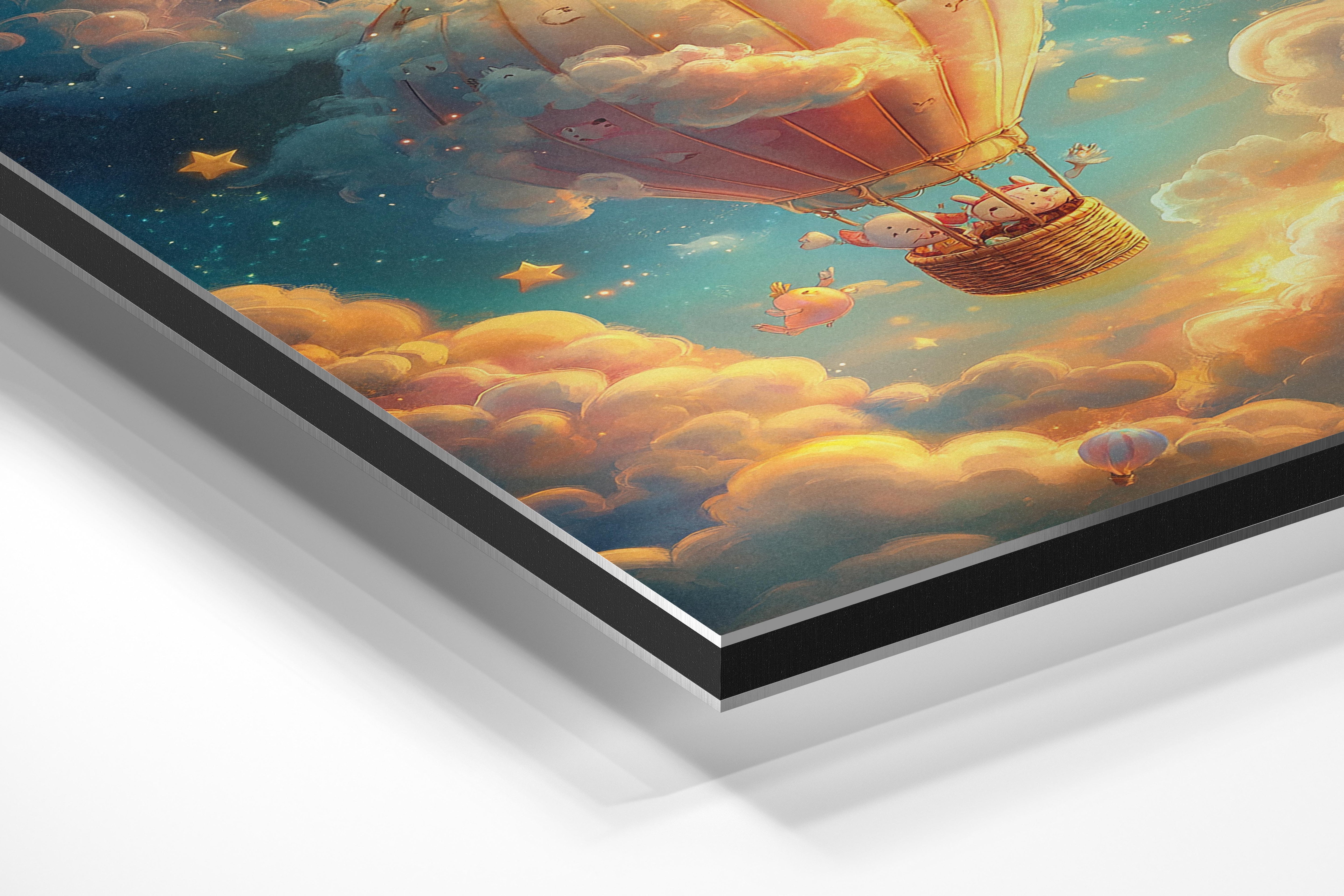 A magical scene of a hot air balloon floating amidst golden clouds, surrounded by stars and whimsical creatures. This dreamy artwork invites viewers to imagine adventures high above the earth, making it perfect for nurseries, children’s rooms, or spaces designed to inspire creativity. The warm lighting and pastel tones create a serene and imaginative atmosphere that captures the essence of childlike wonder.