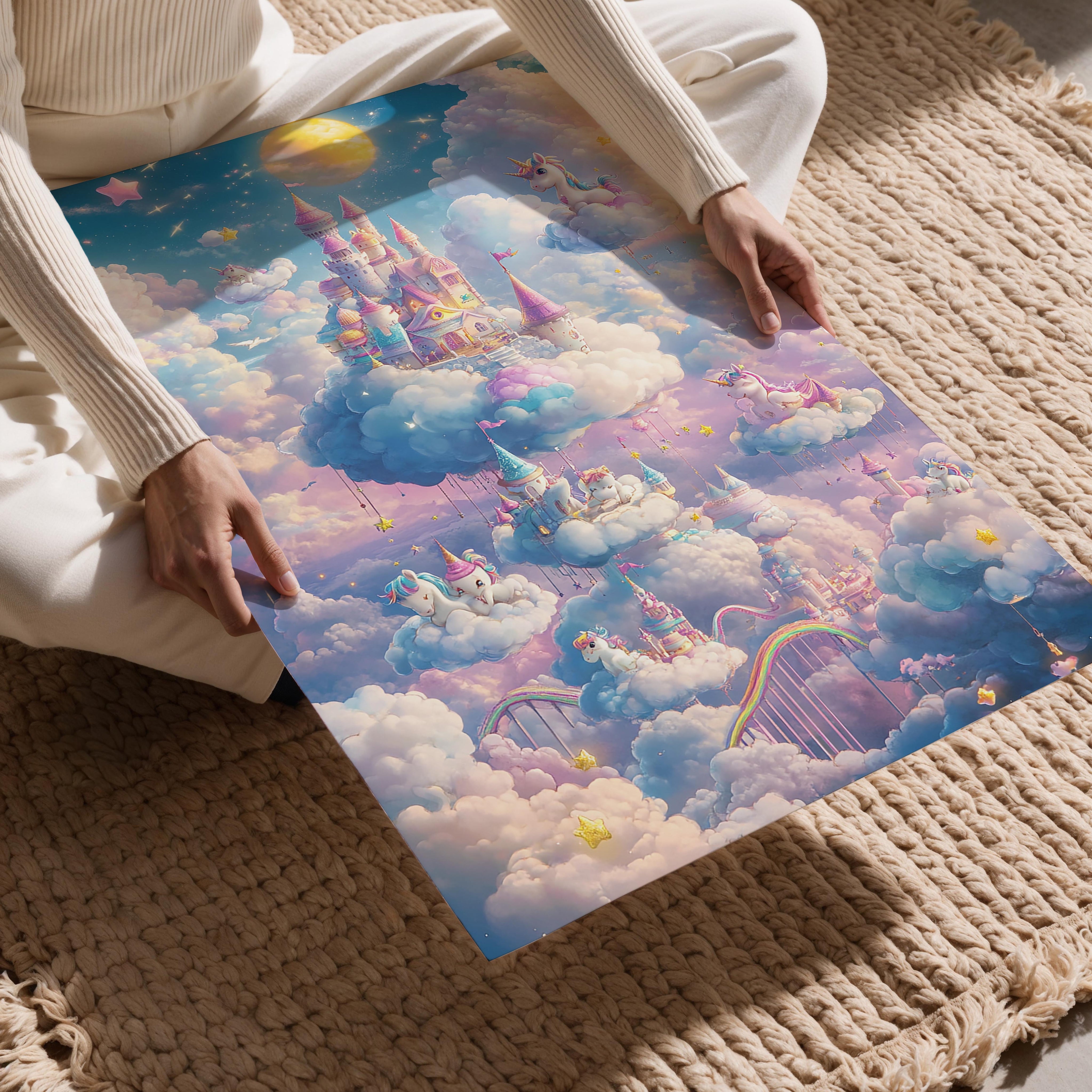 A breathtaking illustration of a floating castle amidst fluffy clouds, where unicorns play in a sky filled with twinkling stars. The pastel color palette and dreamy architecture make this artwork perfect for a fairy tale-themed space. Ideal for children's bedrooms, nurseries, or fantasy lovers' collections, this piece creates an atmosphere of wonder and imagination. The bridge of rainbows and tiny glowing stars complete the whimsical charm of this enchanted kingdom.