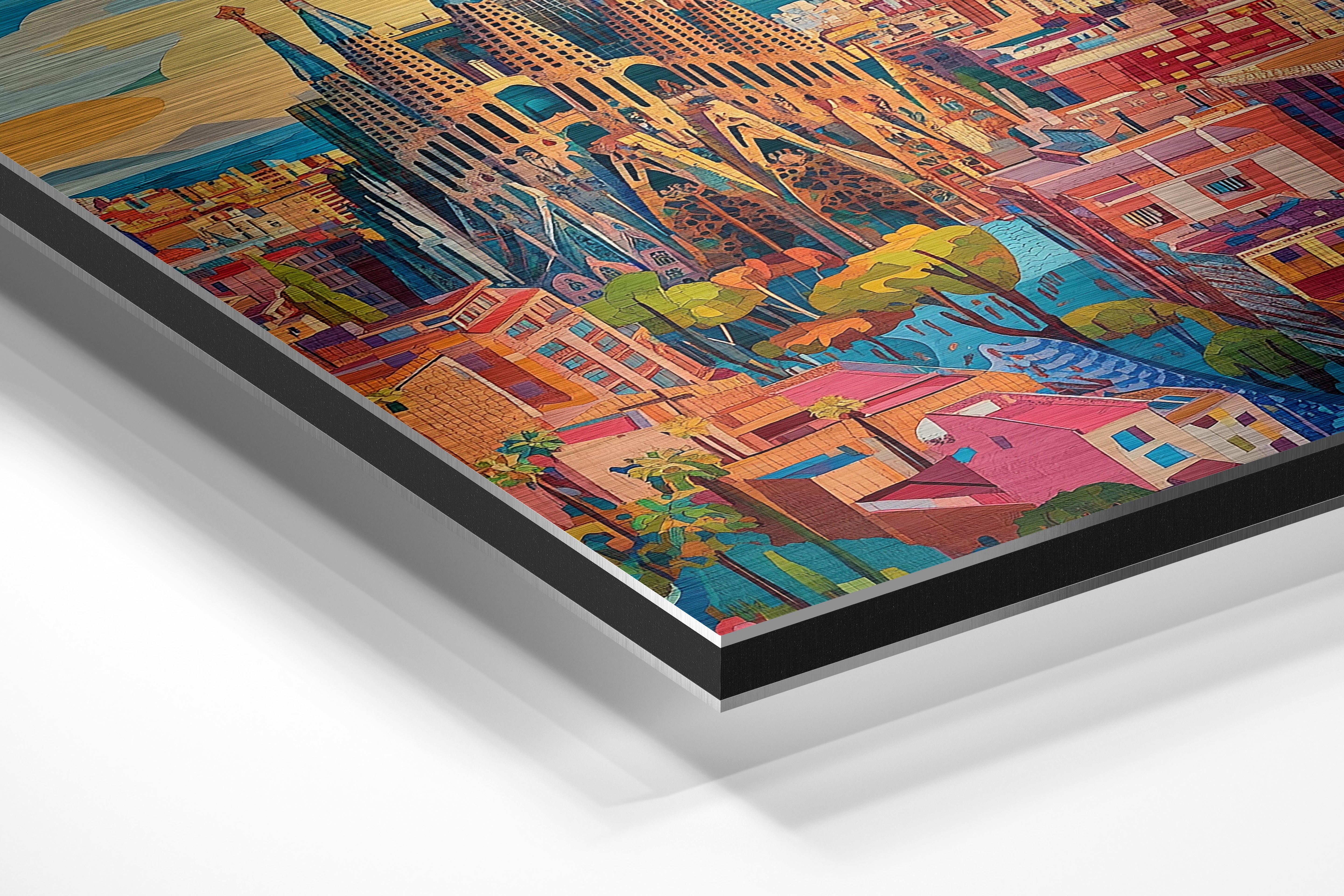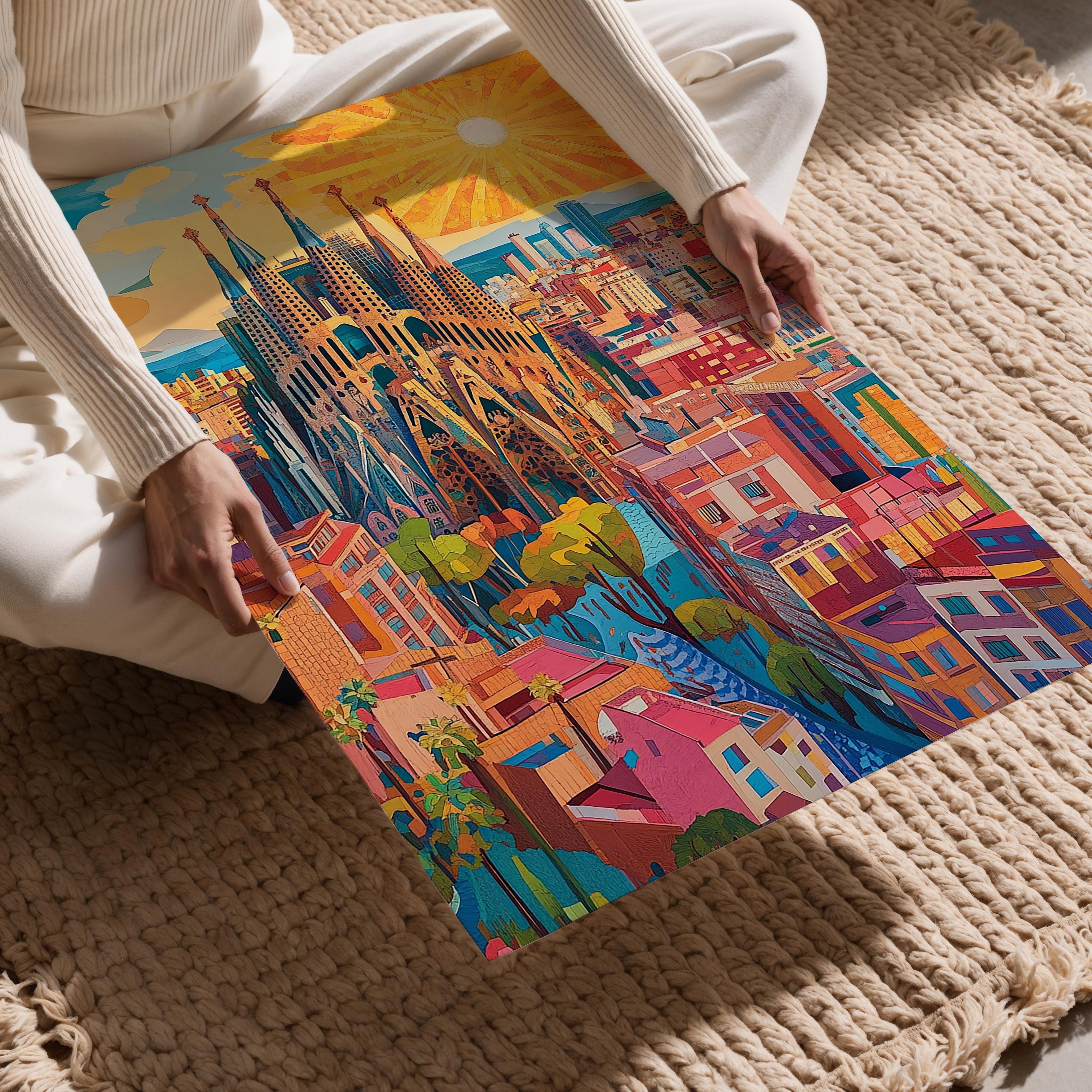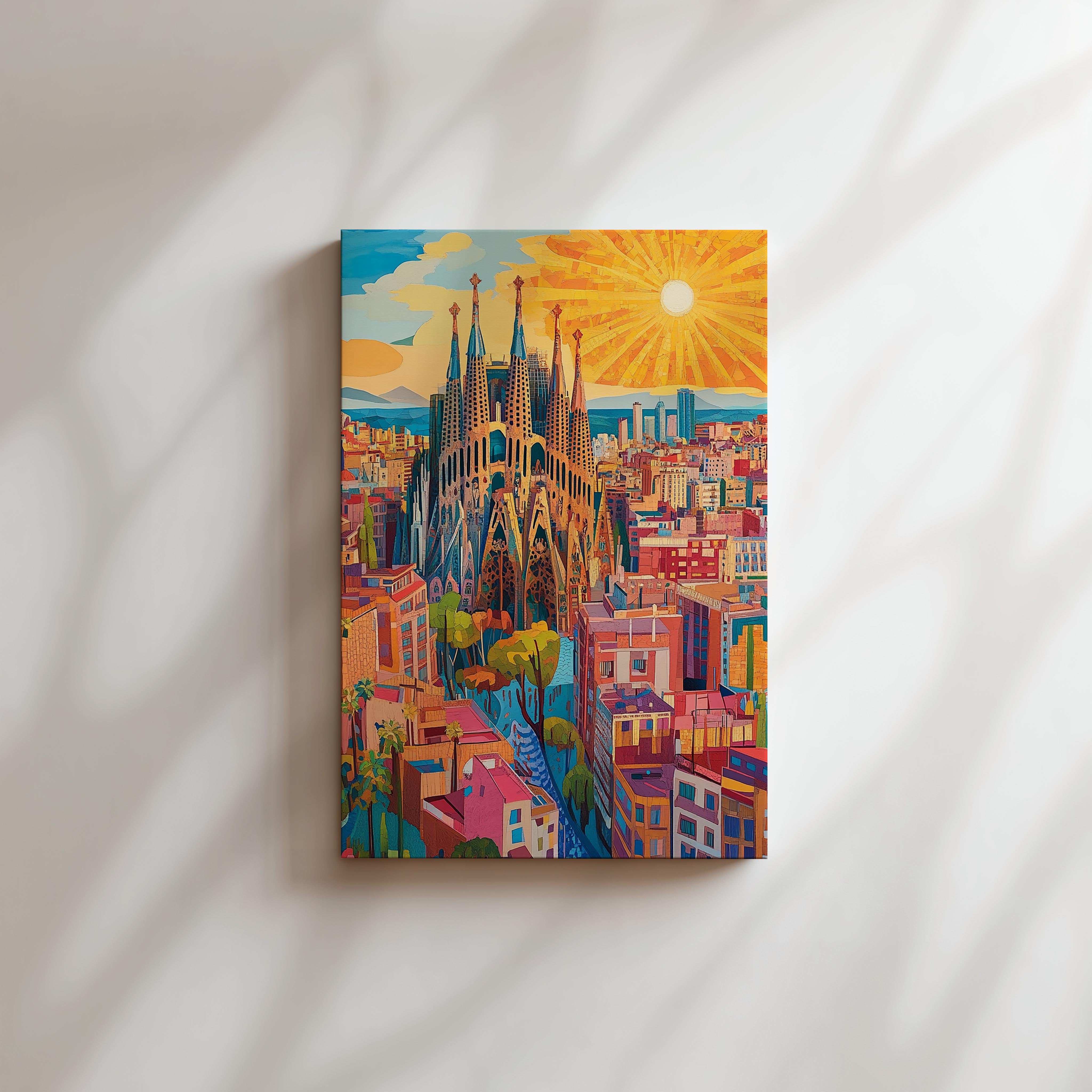 A lively view of Barcelona with colorful buildings and the iconic Sagrada Familia under a radiant sun. The vivid hues bring energy and joy, while the composition draws focus to the harmonious blend of urban design and natural elements. This vibrant artwork is an excellent choice for modern spaces, creative studios, or any setting that seeks to inspire with its dynamic and cheerful aesthetic.