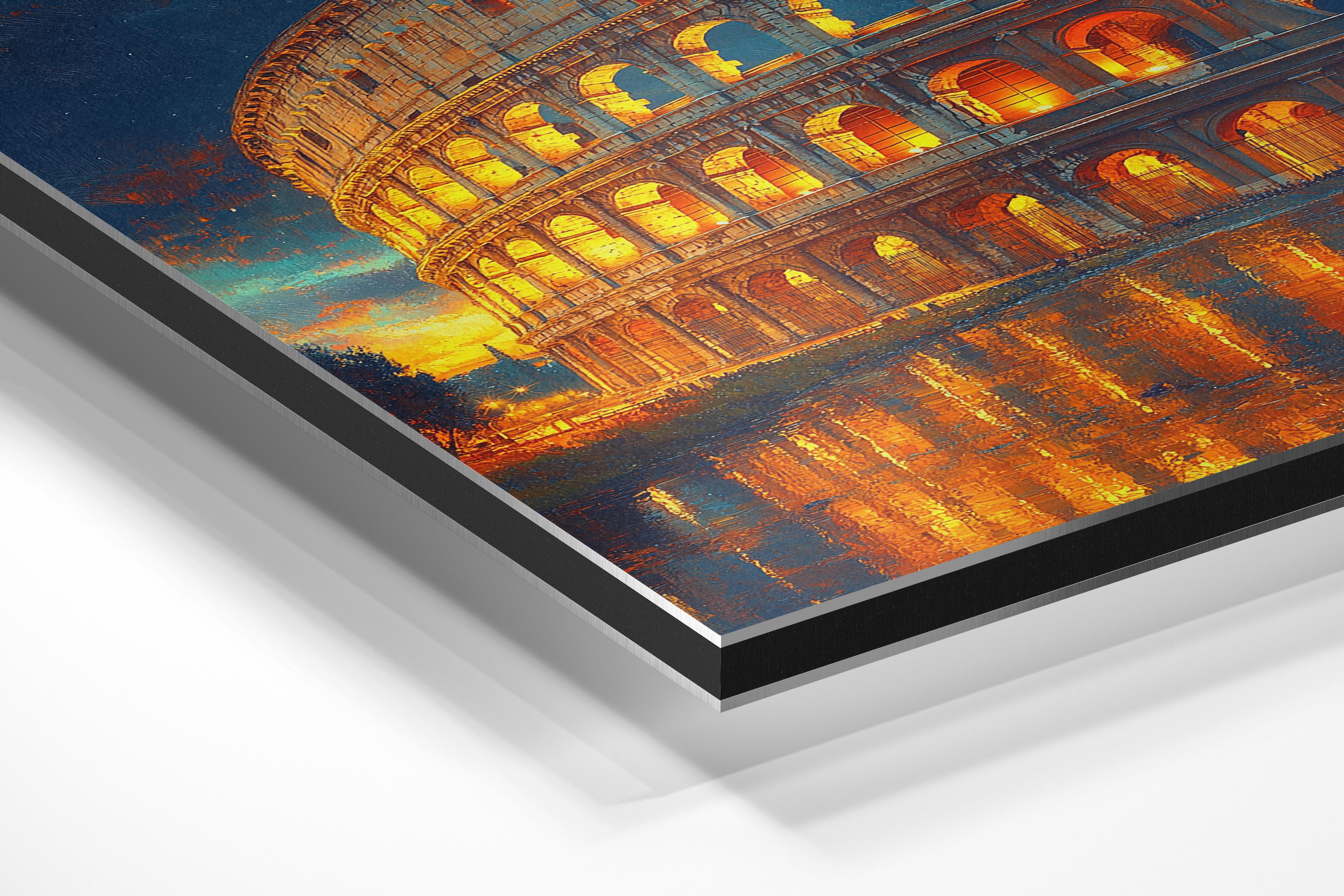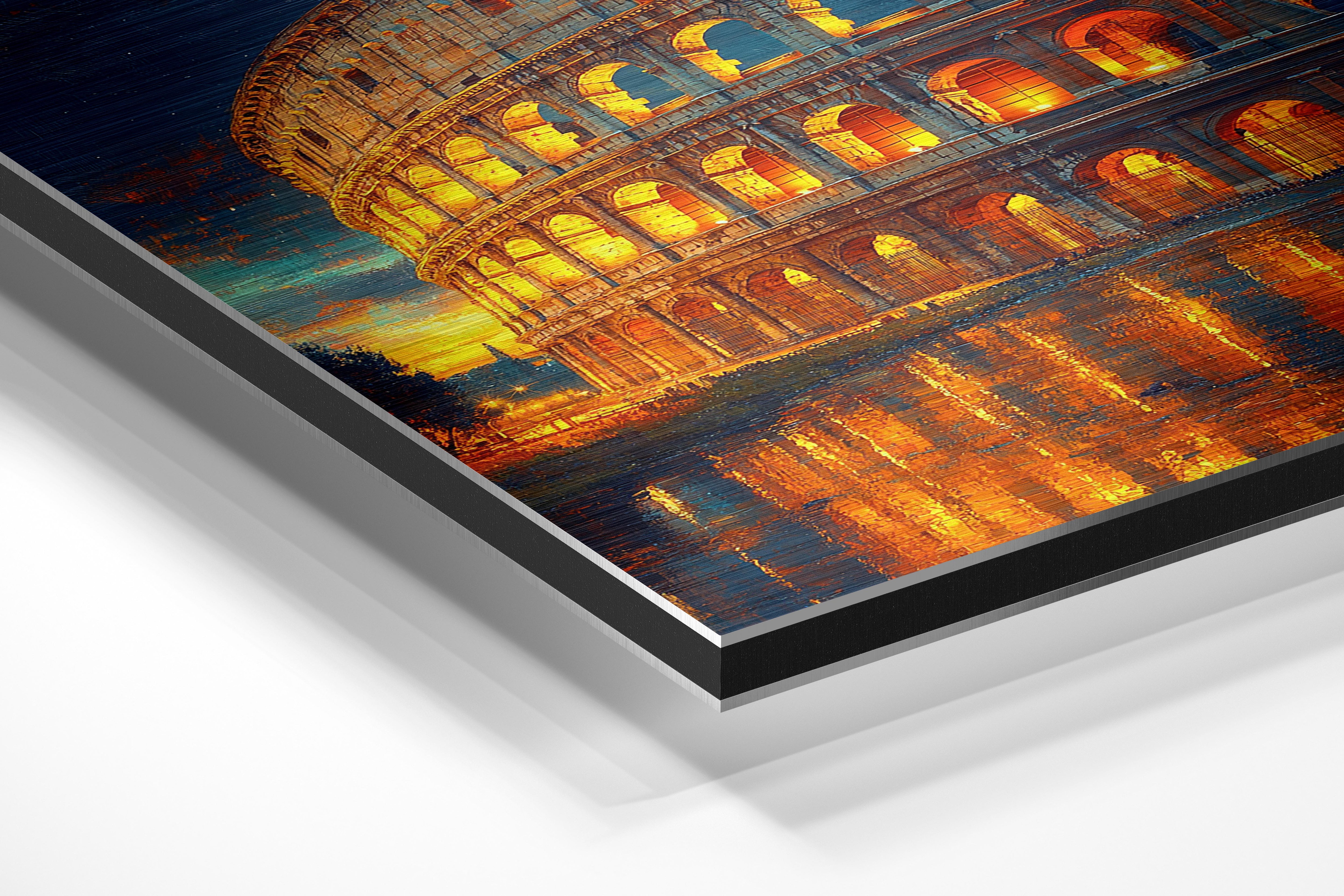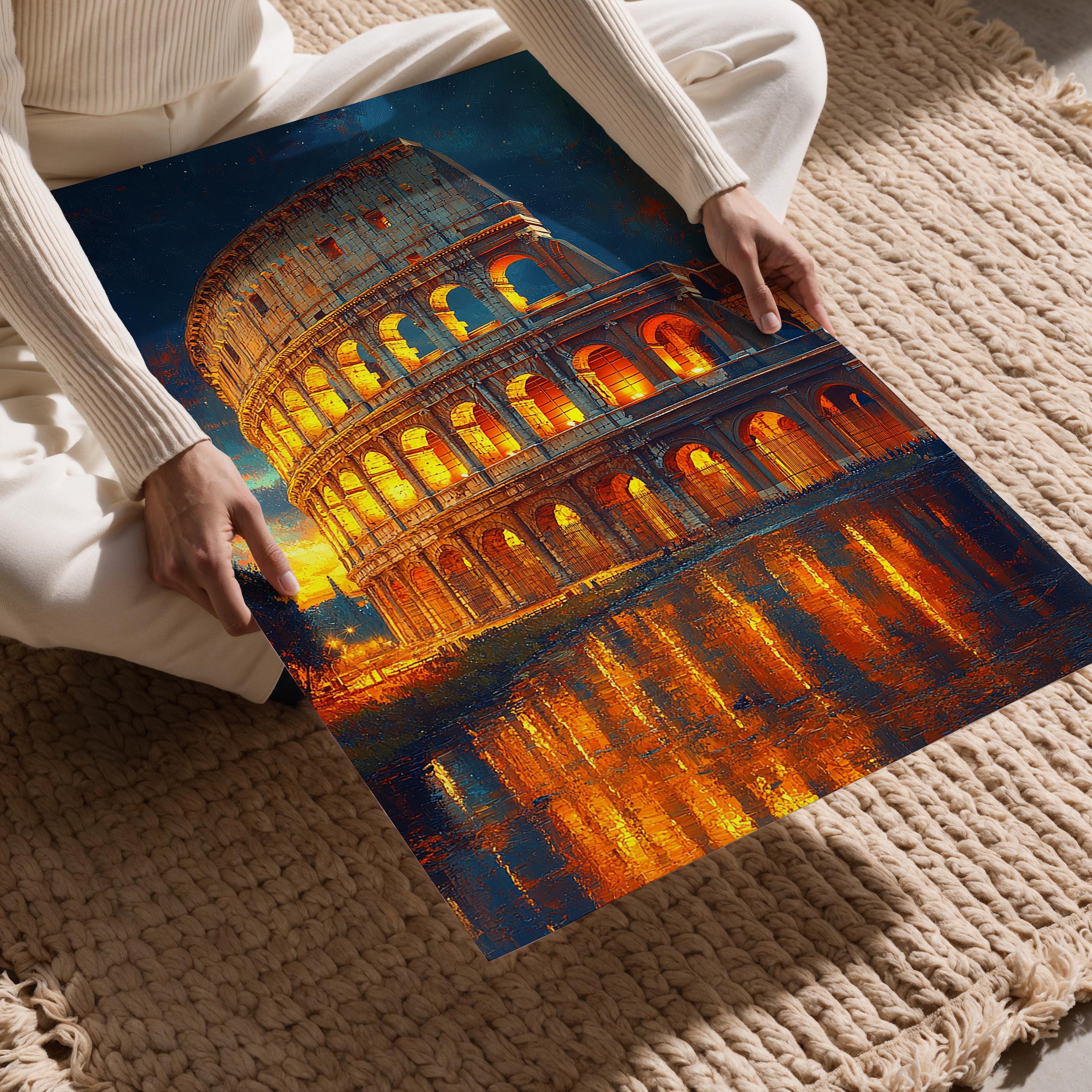 This stunning depiction of the Colosseum captures the historical monument at dusk, with warm, golden lighting reflecting in a calm pool of water. The starry sky and glowing arches create a magical ambiance, making this piece ideal for anyone fascinated by Roman history or grand architecture. It adds an element of wonder and sophistication to living rooms or offices. The fiery hues contrast beautifully with the serene blue sky, making it a versatile addition to both modern and classic interiors. A must-have for art and history enthusiasts.