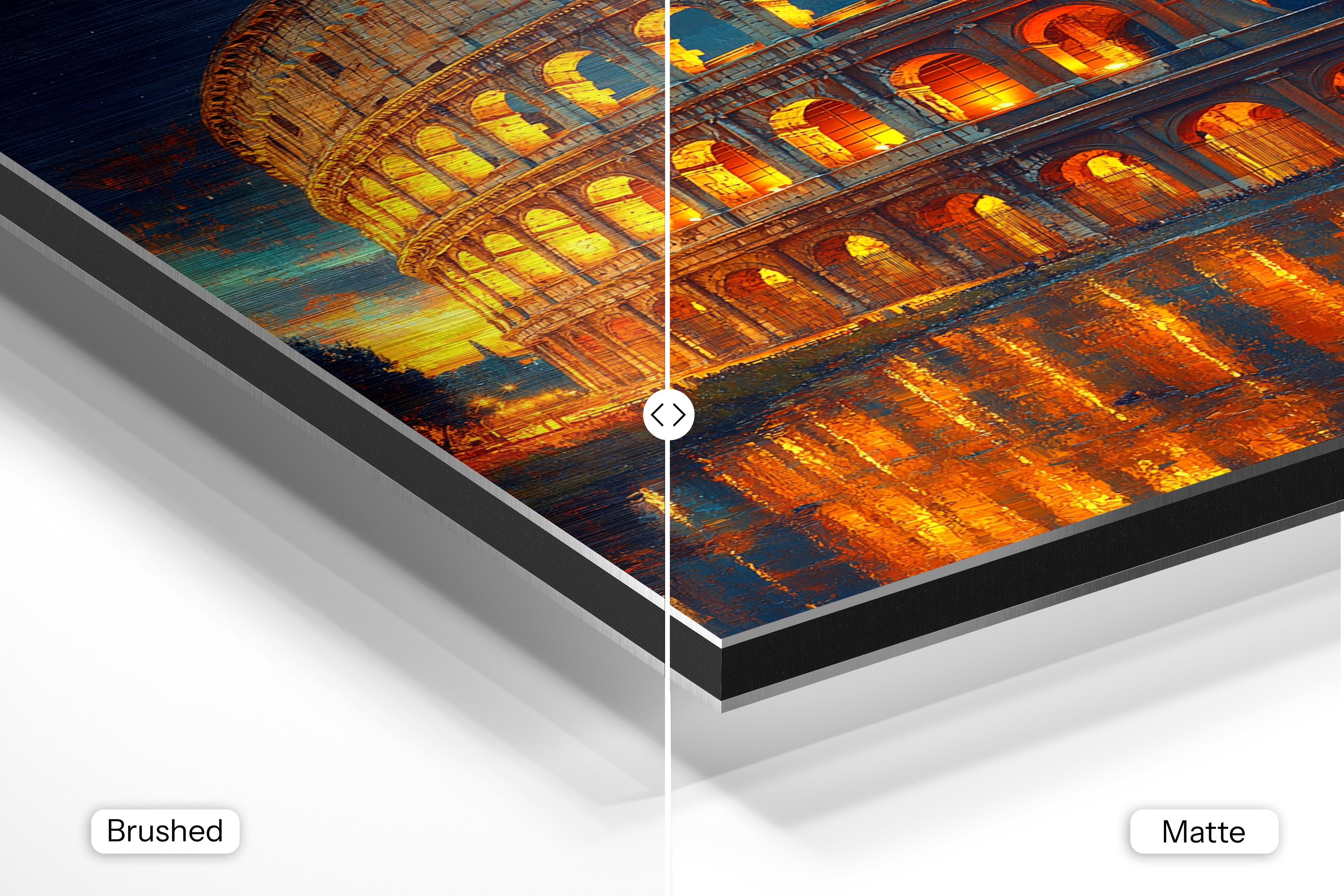 - Brushed Aluminum, on the other hand, features a raw metallic texture with visible brush strokes. Whites and highlights in your image let the silver surface show through, adding a dramatic, shimmering effect. Ideal for black-and-white images, minimalist designs, or abstract art, it creates a bold, industrial vibe with a modern edge.