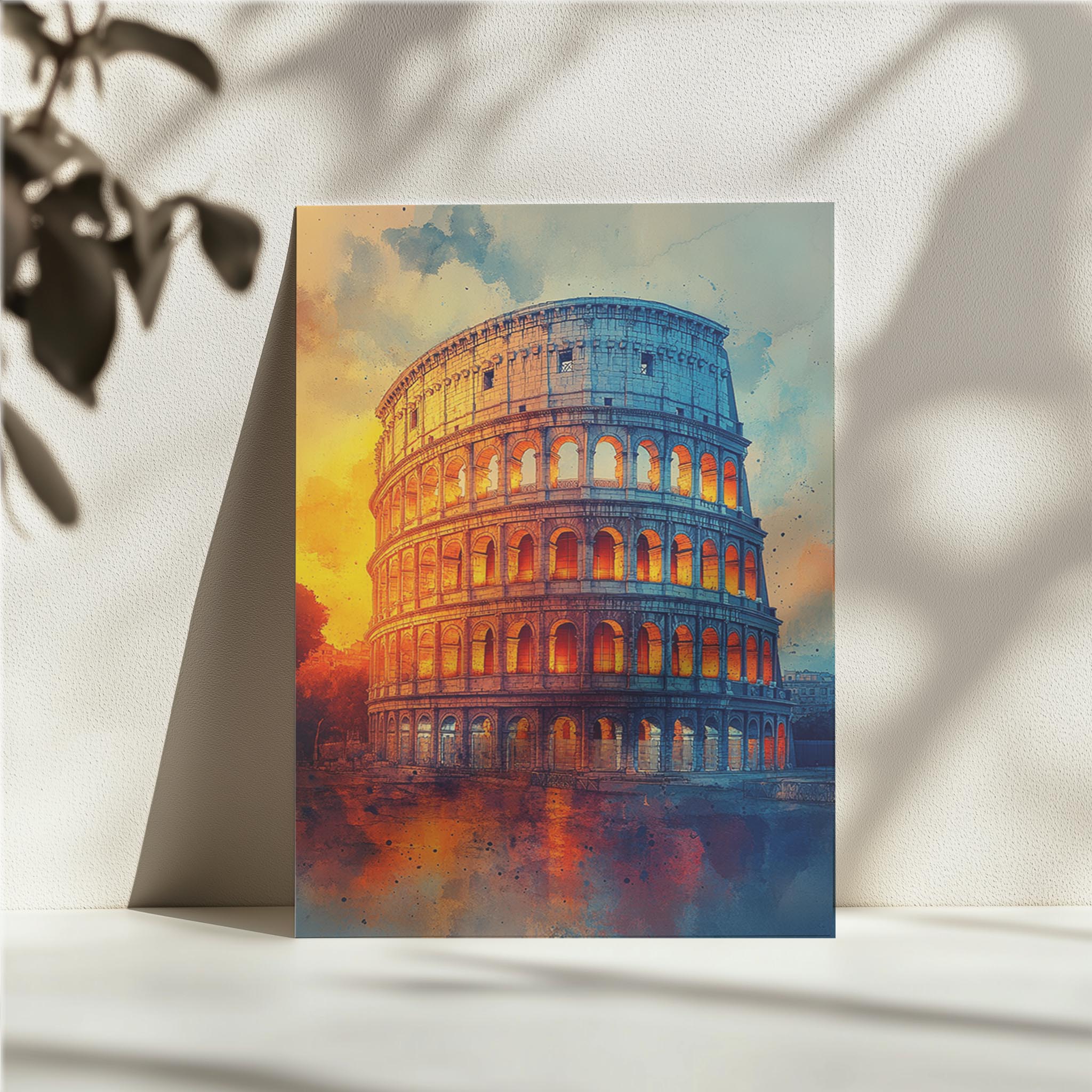 This stunning image showcases the Colosseum bathed in the golden hues of sunset. The vibrant interplay of light and shadow enhances its majestic architecture, while the surrounding warm tones create an inviting atmosphere. Perfect for spaces celebrating cultural heritage, this artwork brings a sense of timeless beauty and history to any room.