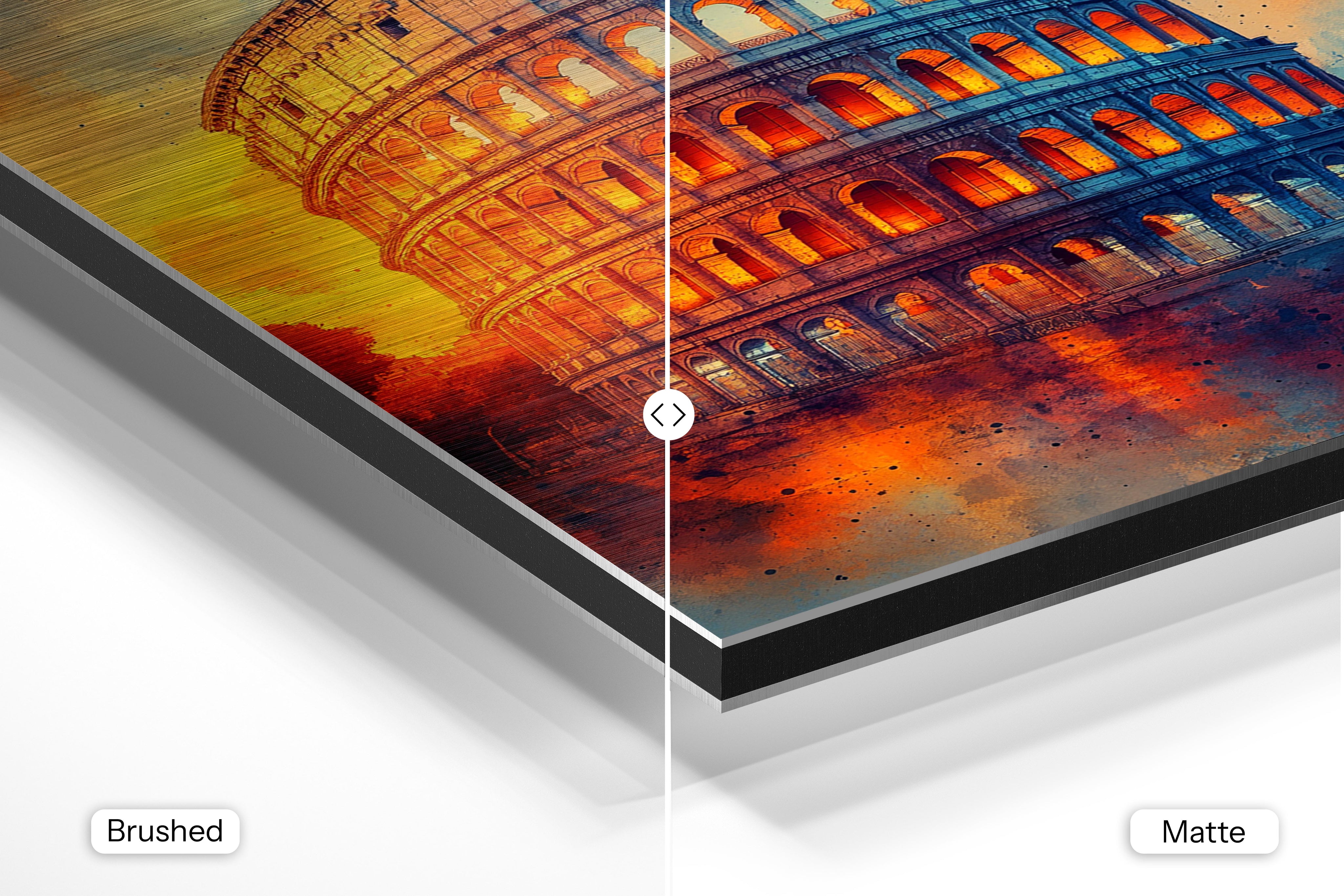 - Brushed Aluminum, on the other hand, features a raw metallic texture with visible brush strokes. Whites and highlights in your image let the silver surface show through, adding a dramatic, shimmering effect. Ideal for black-and-white images, minimalist designs, or abstract art, it creates a bold, industrial vibe with a modern edge.