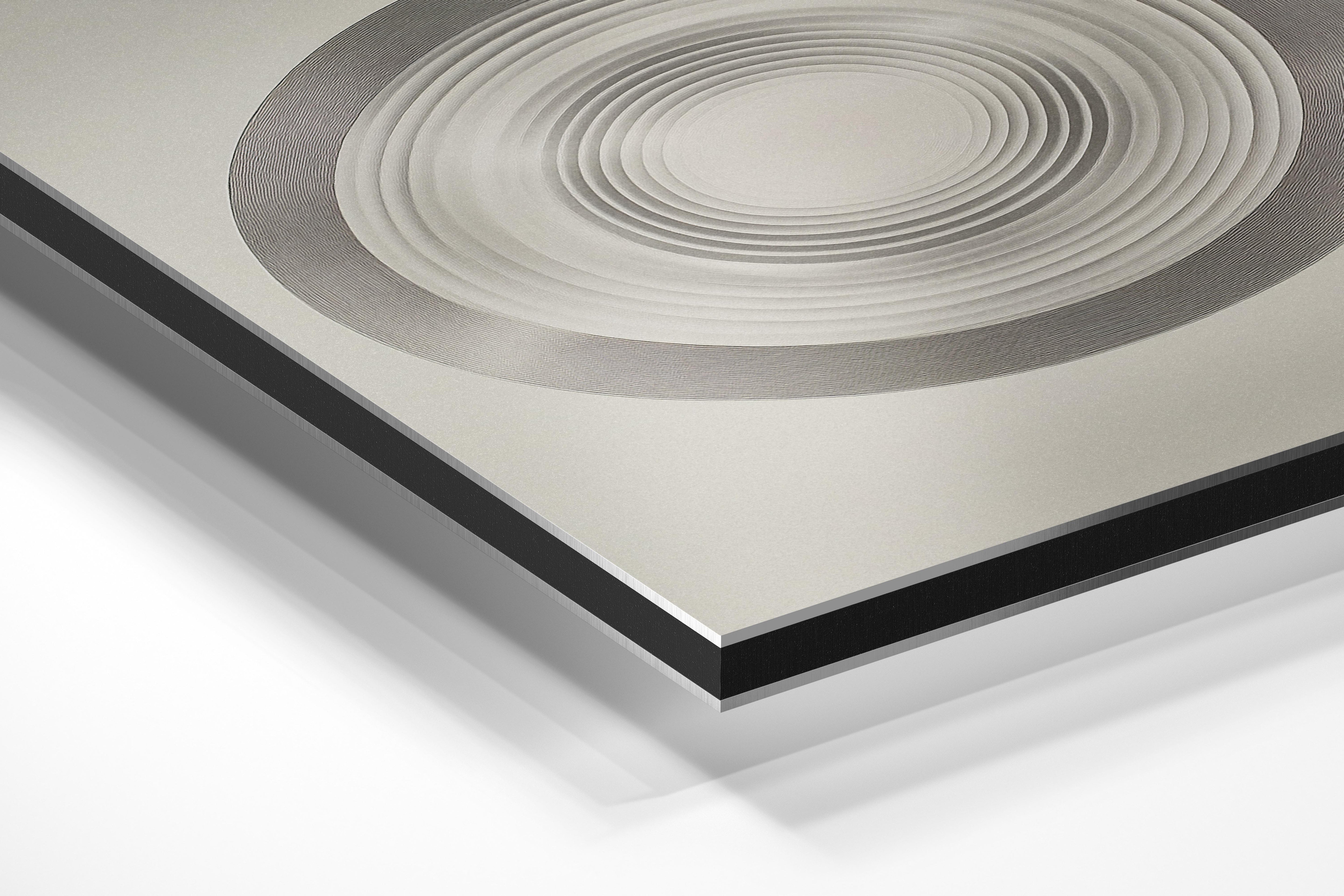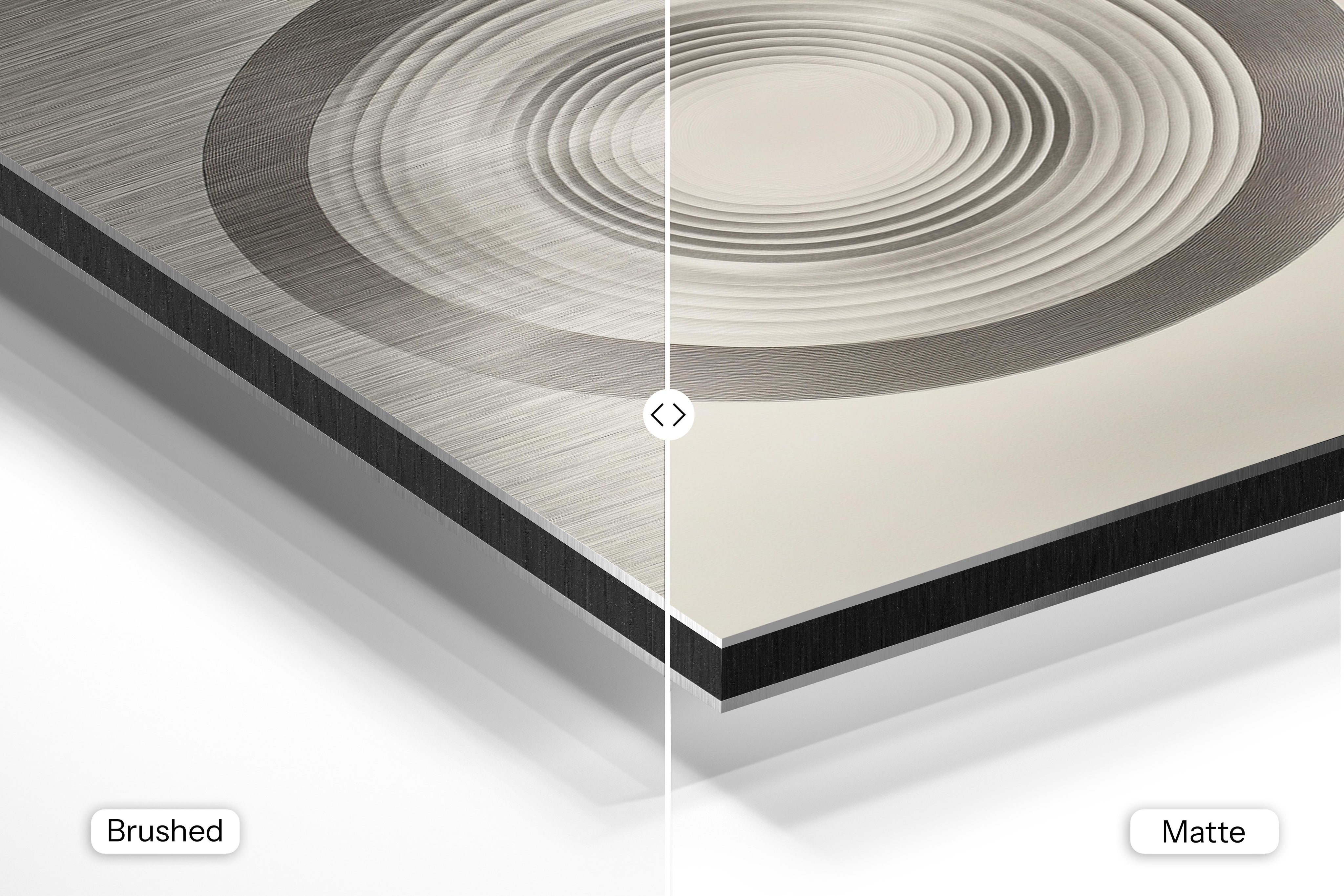 - Brushed Aluminum, on the other hand, features a raw metallic texture with visible brush strokes. Whites and highlights in your image let the silver surface show through, adding a dramatic, shimmering effect. Ideal for black-and-white images, minimalist designs, or abstract art, it creates a bold, industrial vibe with a modern edge.