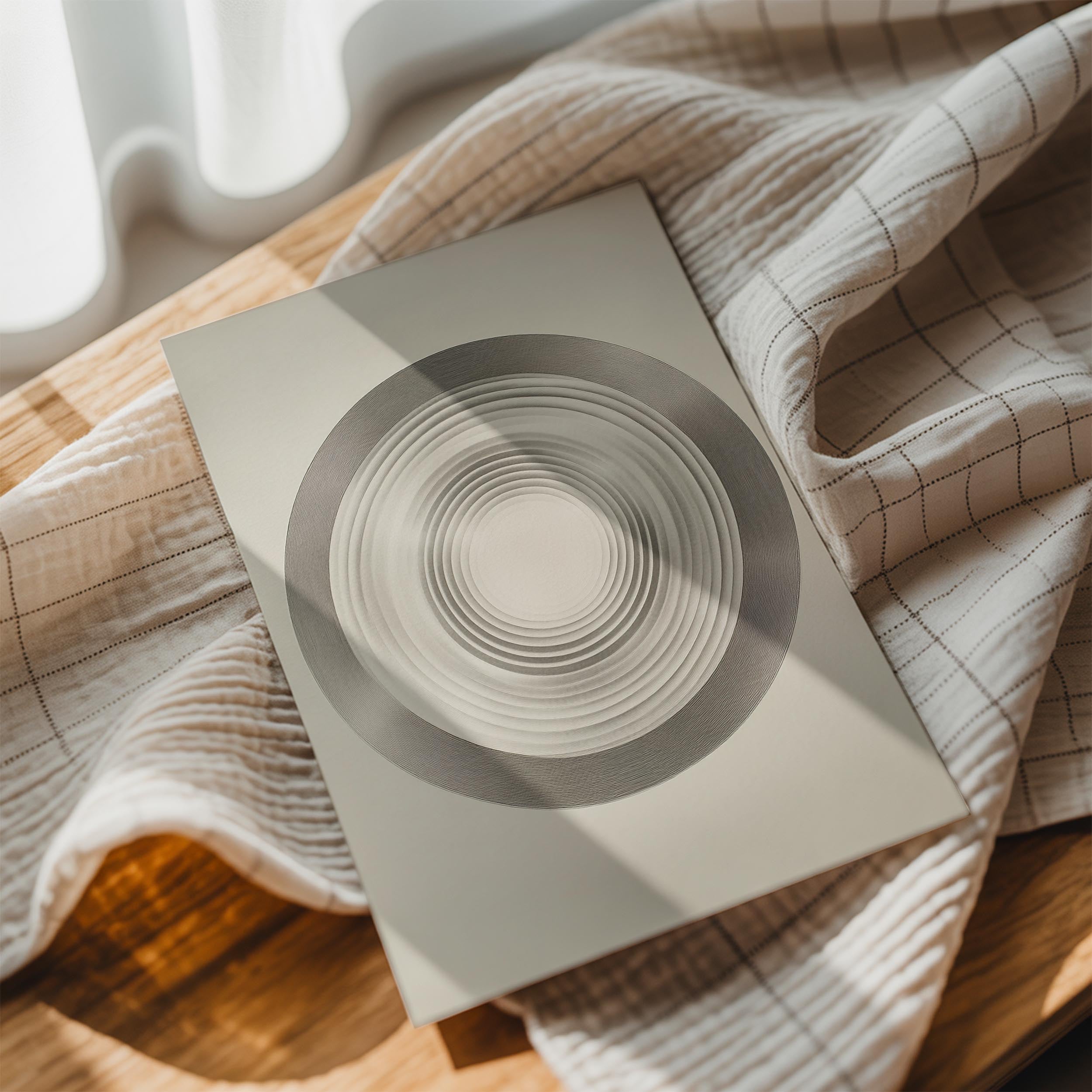 A minimalist depiction of concentric circles radiating outward in soft grayscale tones. The repetitive pattern creates a soothing and meditative visual effect, ideal for modern interiors or workspaces. This piece complements clean, minimalist decor, fostering an atmosphere of focus and calm.