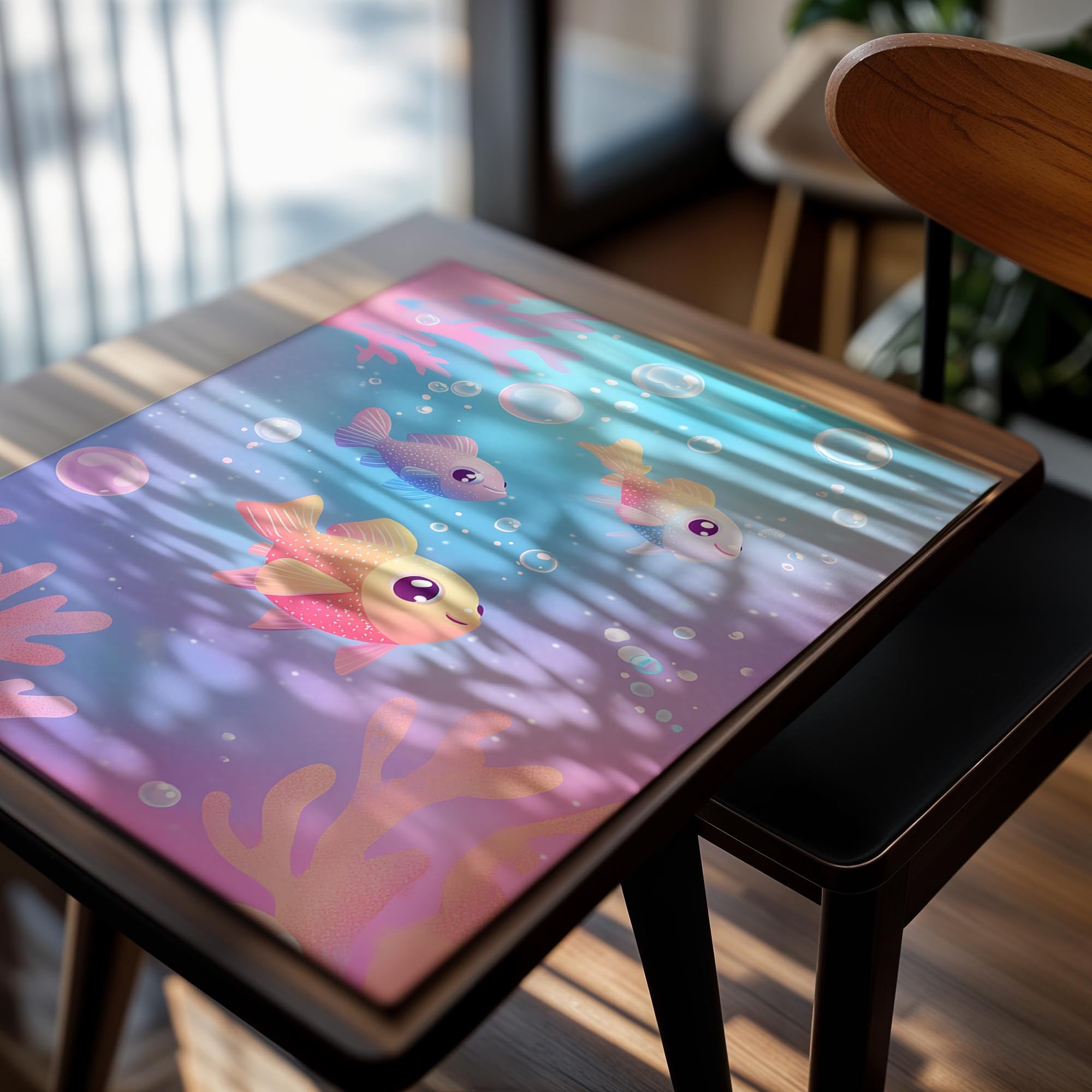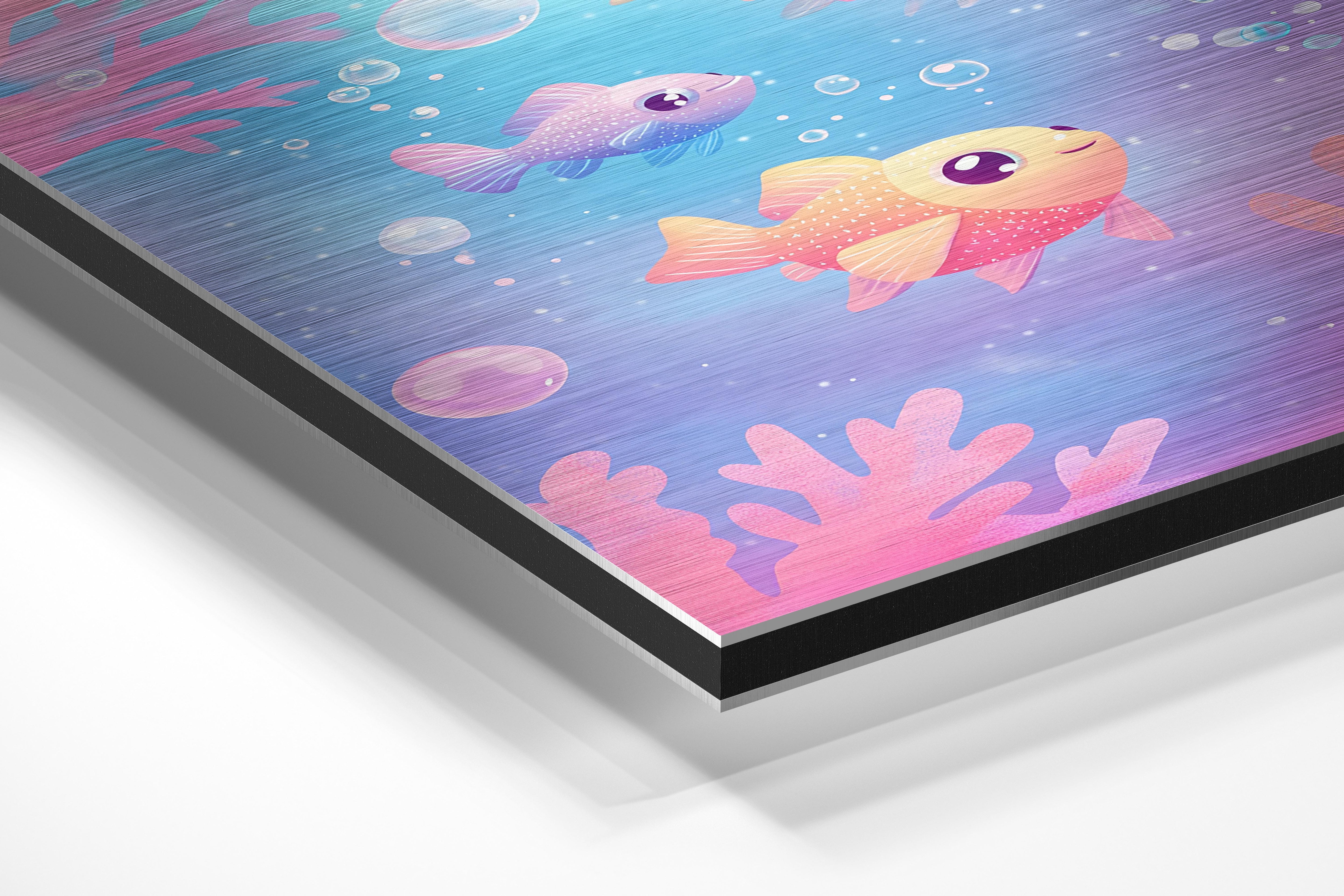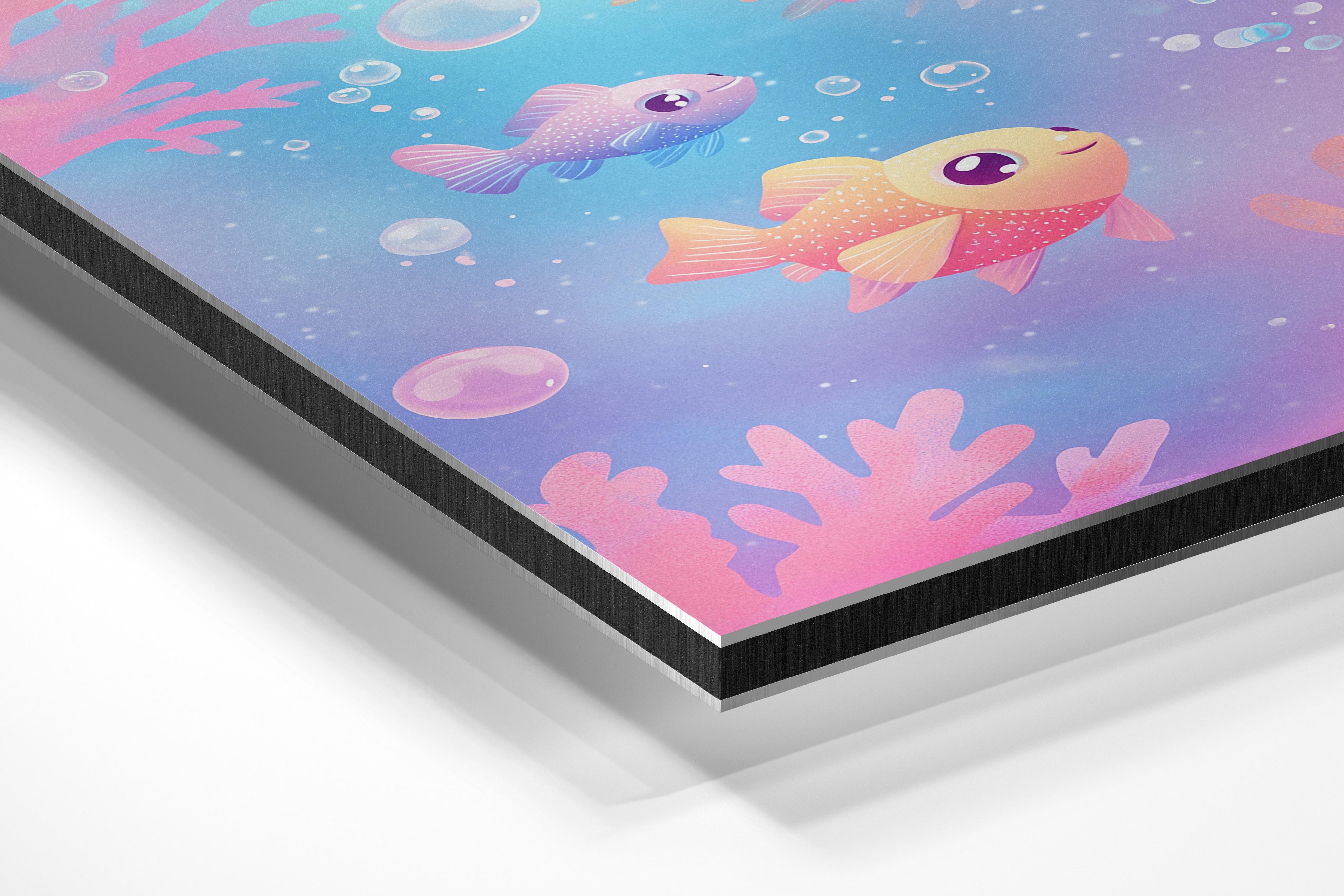 A colorful underwater scene showcasing three adorable fish swimming amidst coral and bubbles. The gradient background of blue and pink creates a dreamy aquatic world, while the fish’s cheerful expressions add personality to the image. Perfect for ocean-themed decor or children’s rooms, this artwork inspires a sense of wonder and appreciation for marine life. The detailed corals and soft light effects evoke the tranquility and beauty of the sea, making it a versatile piece for various settings.