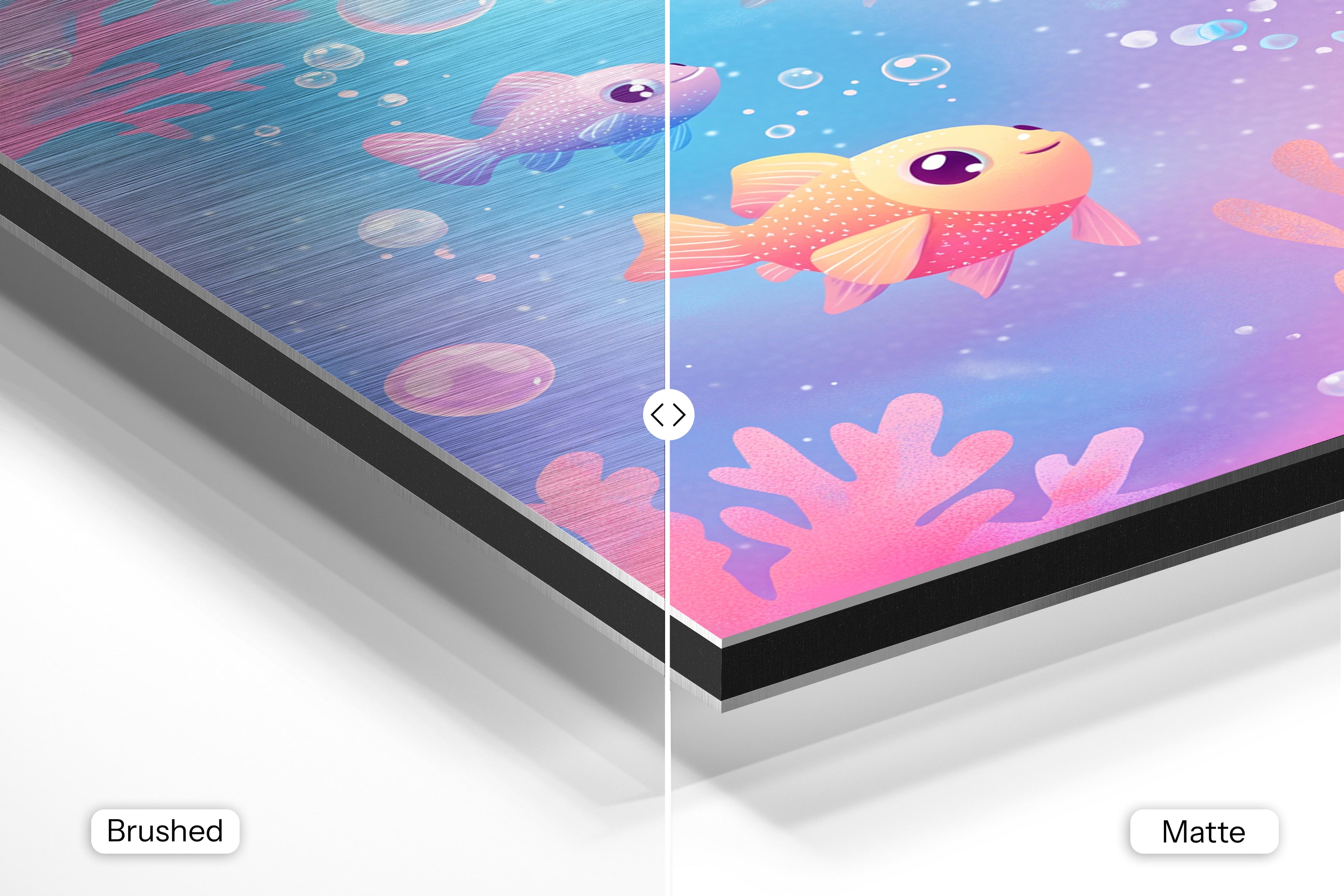 - Matte Aluminum offers a smooth, bright white surface that delivers crisp details and vibrant, true-to-life colors. With its non-reflective finish and subtle silky sheen, it’s perfect for photography, portraits, and colorful artwork—bringing a clean, polished look to any interior.