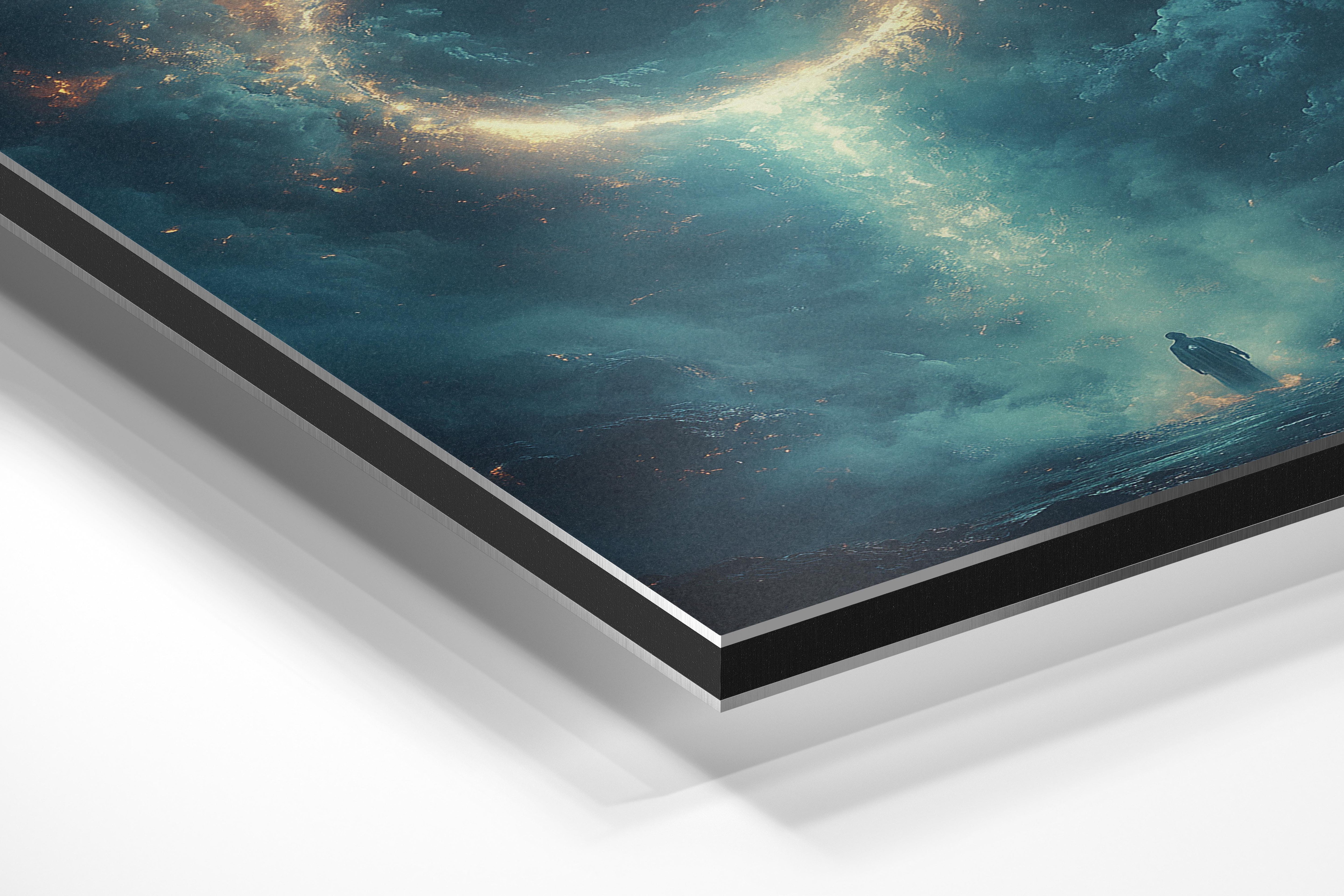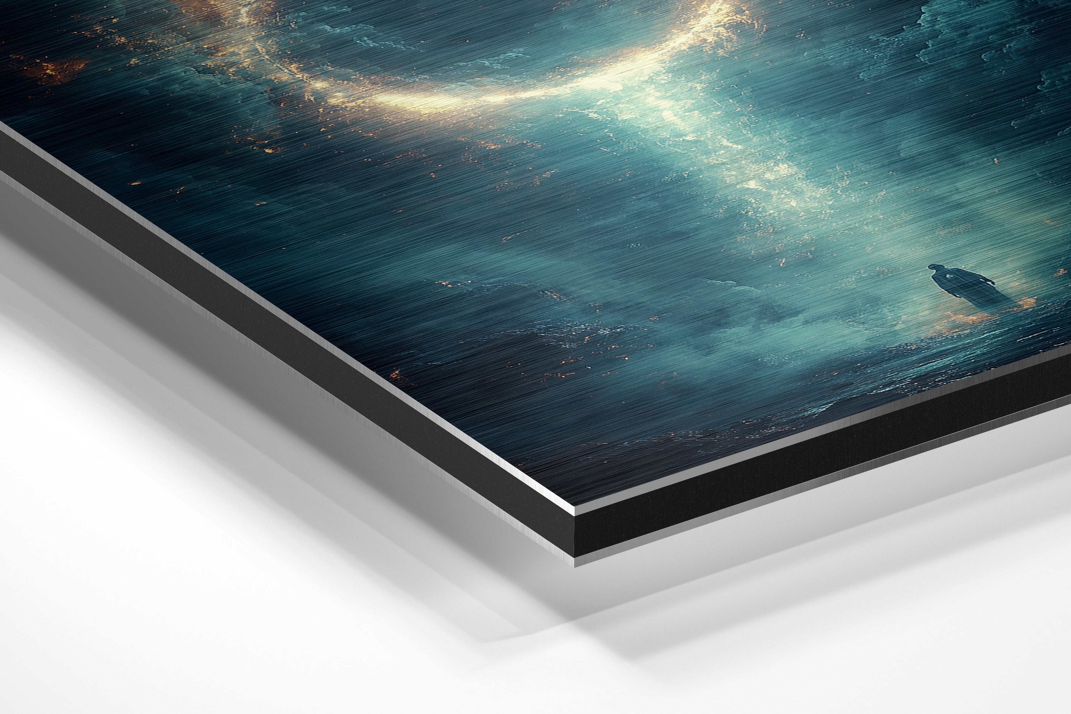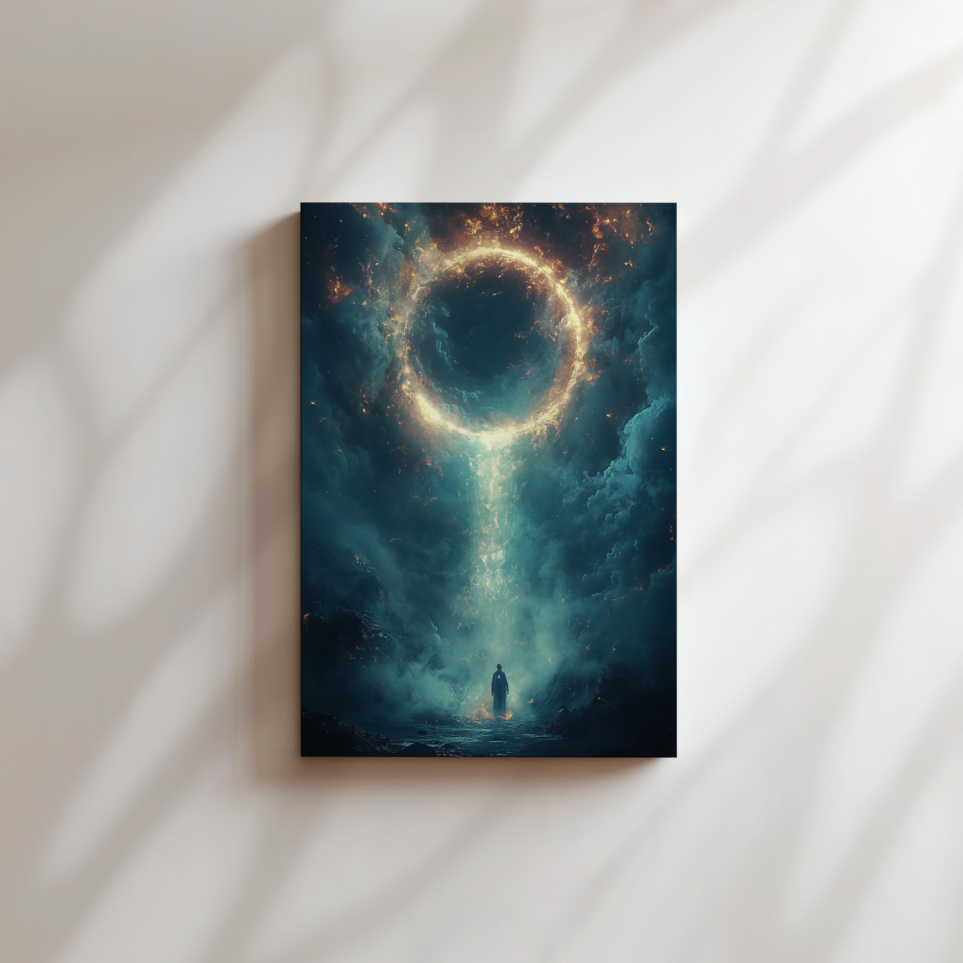 A surreal vision of a lone figure standing before a celestial ring of fire, a gateway to the unknown. The radiant glow of the portal illuminates the swirling cosmic clouds, creating a mesmerizing balance between mystery and transcendence. The visual depth and intense lighting effects make this piece a captivating addition to a sci-fi or fantasy-themed interior. Whether displayed in a creative workspace, a meditation room, or a futuristic home setting, it serves as a powerful symbol of exploration, transformation, and the limitless possibilities of the cosmos.