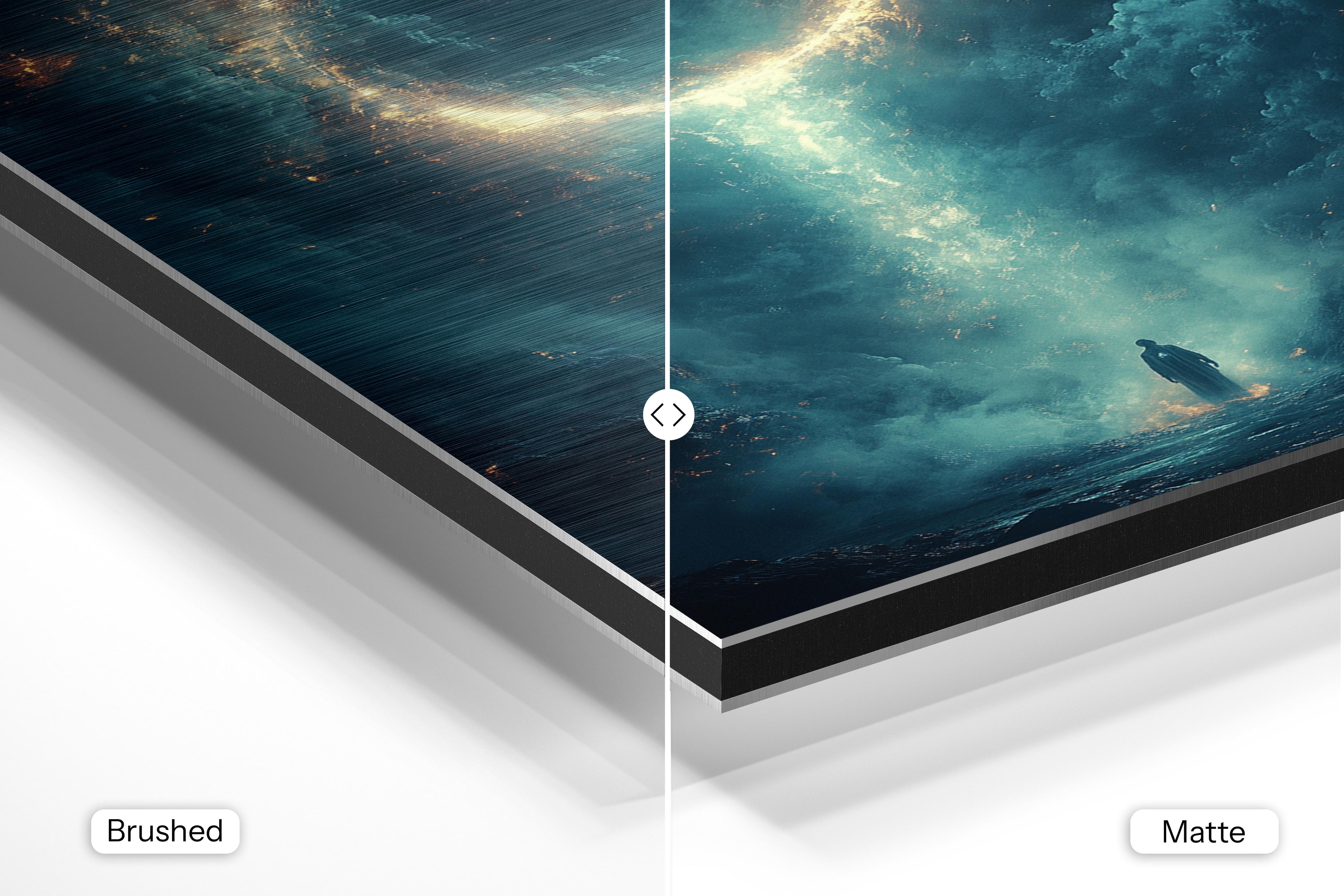 - Brushed Aluminum, on the other hand, features a raw metallic texture with visible brush strokes. Whites and highlights in your image let the silver surface show through, adding a dramatic, shimmering effect. Ideal for black-and-white images, minimalist designs, or abstract art, it creates a bold, industrial vibe with a modern edge.