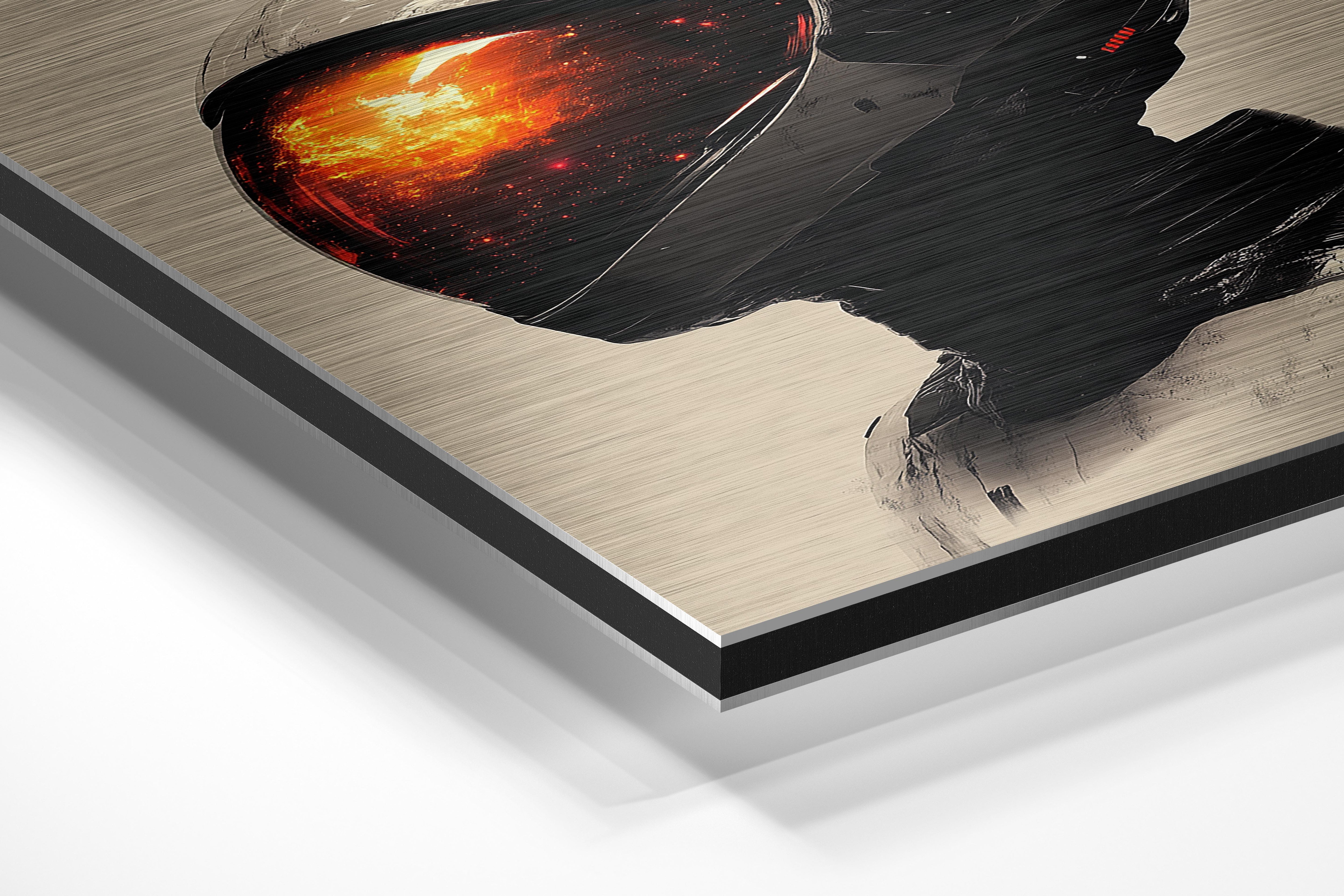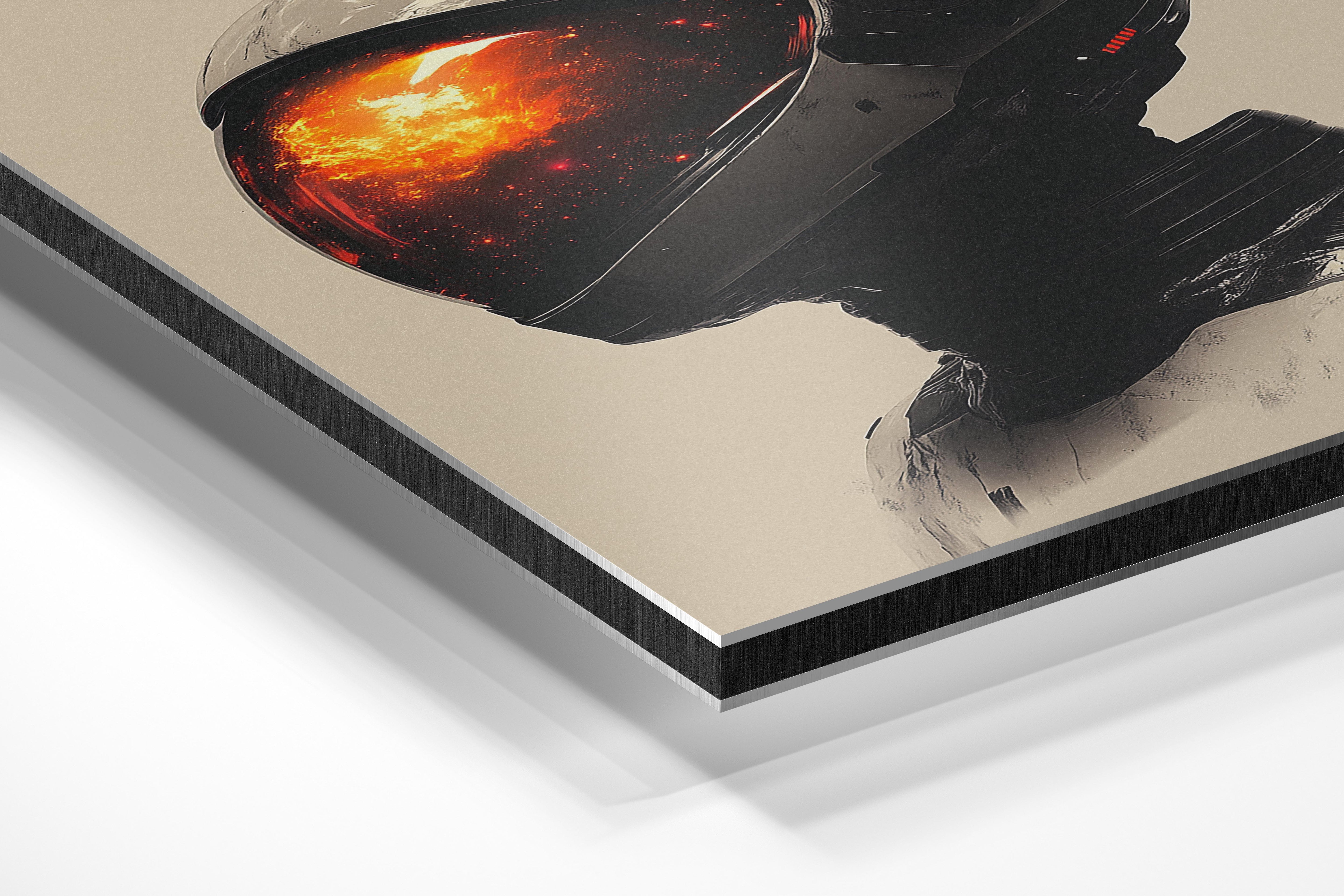 A bold and imaginative portrayal of an astronaut's helmet reflecting a cosmic explosion. The combination of fiery orange tones and the helmet’s sleek design gives it a striking and cinematic feel. This artwork is ideal for creative spaces, gaming setups, or sci-fi-themed interiors. It sparks a sense of wonder and adventure, reminding viewers of humanity’s quest to explore the unknown. The intricate details and rich contrast make this a standout piece, guaranteed to captivate anyone with an appreciation for space exploration and futuristic aesthetics.