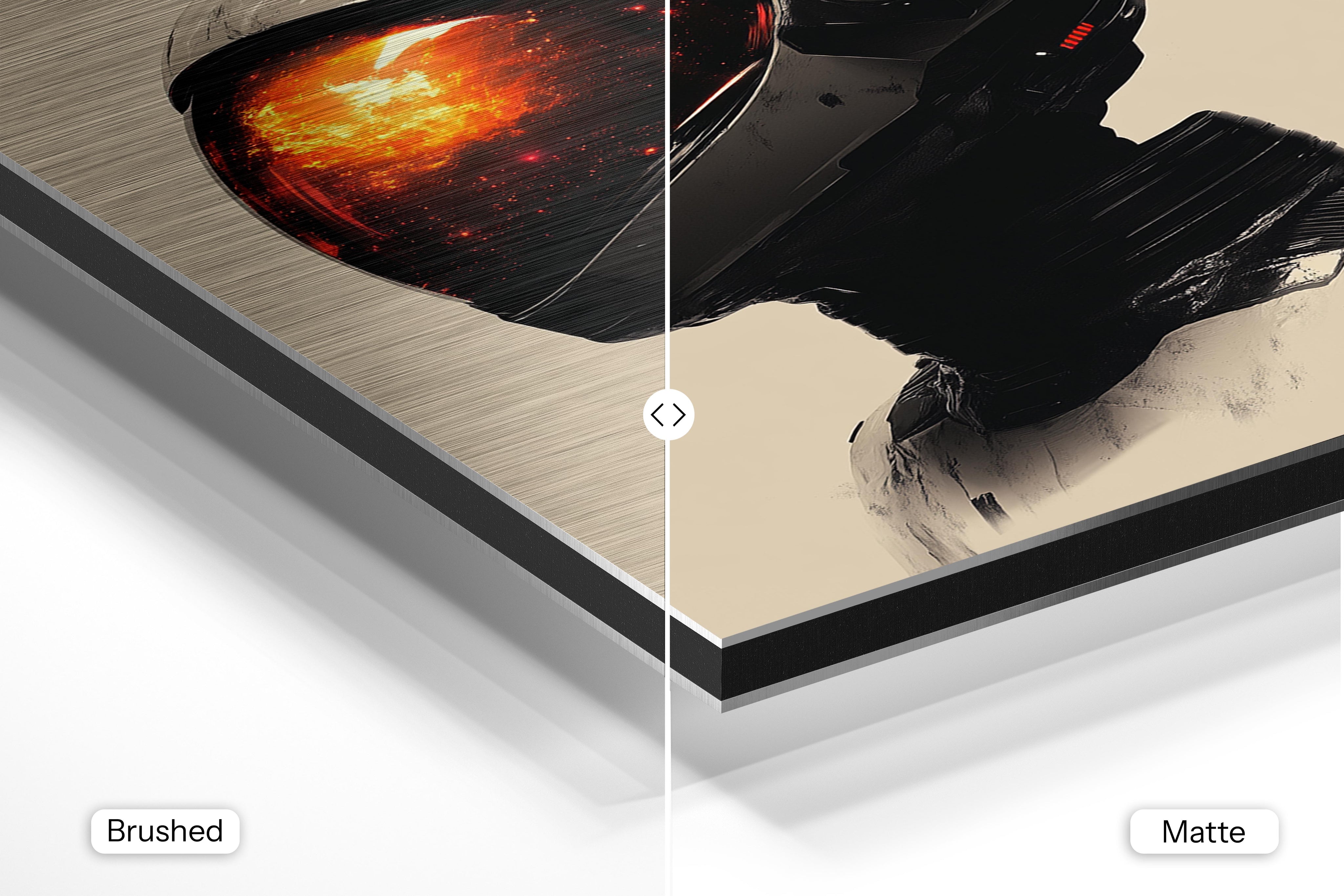 - Brushed Aluminum, on the other hand, features a raw metallic texture with visible brush strokes. Whites and highlights in your image let the silver surface show through, adding a dramatic, shimmering effect. Ideal for black-and-white images, minimalist designs, or abstract art, it creates a bold, industrial vibe with a modern edge.
