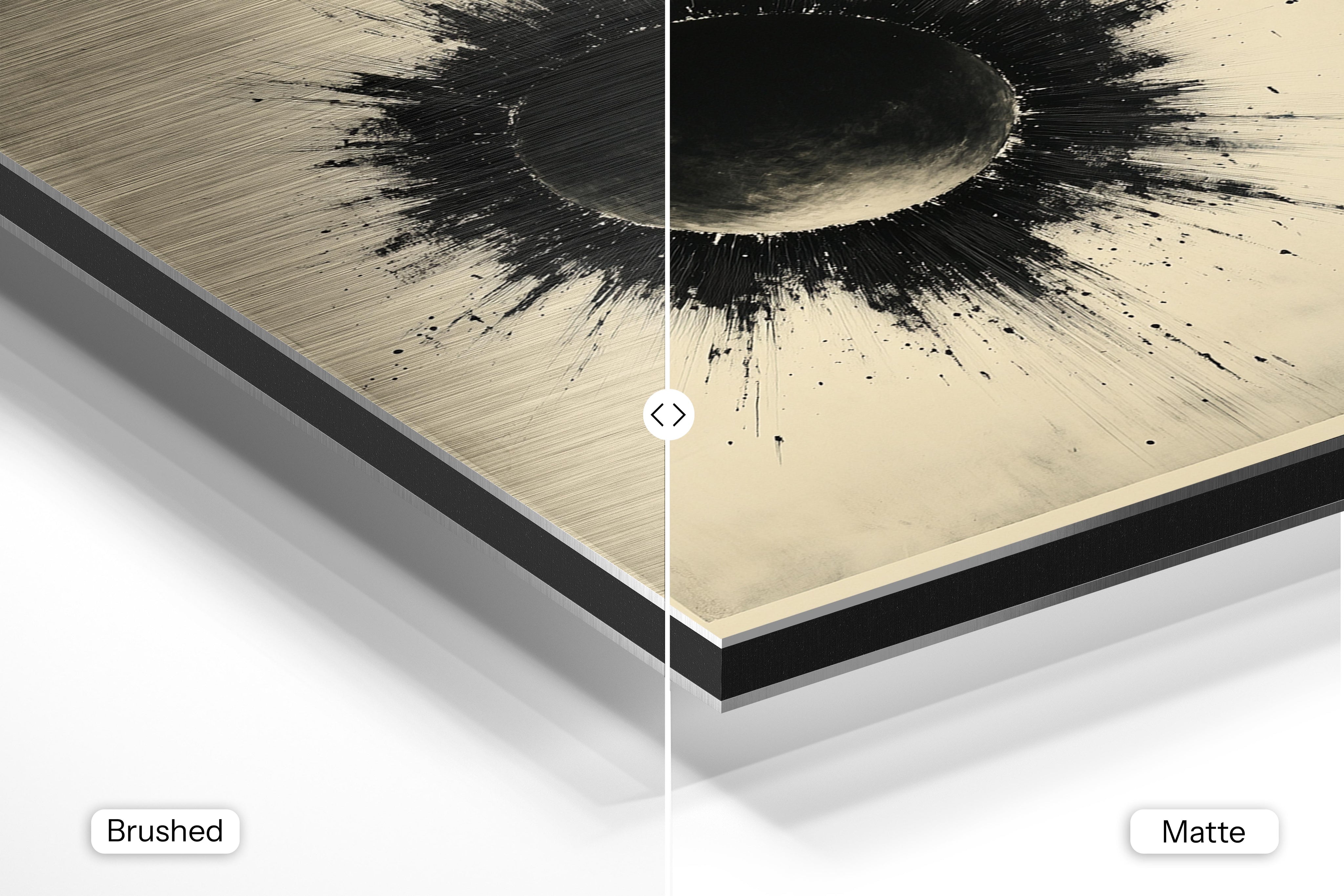 - Brushed Aluminum, on the other hand, features a raw metallic texture with visible brush strokes. Whites and highlights in your image let the silver surface show through, adding a dramatic, shimmering effect. Ideal for black-and-white images, minimalist designs, or abstract art, it creates a bold, industrial vibe with a modern edge.