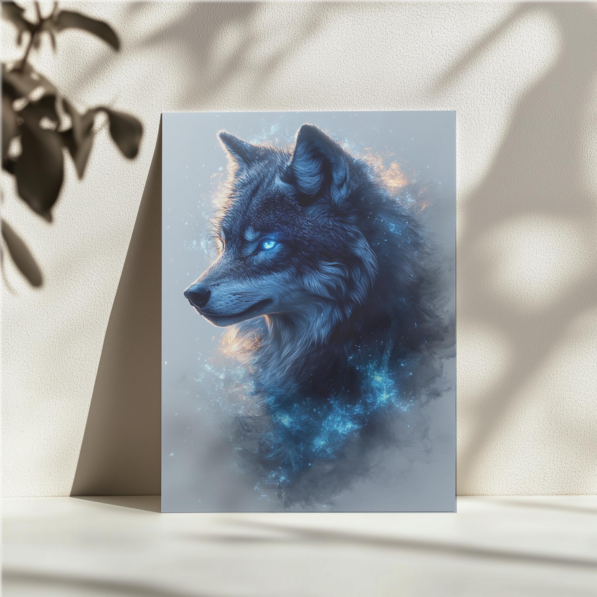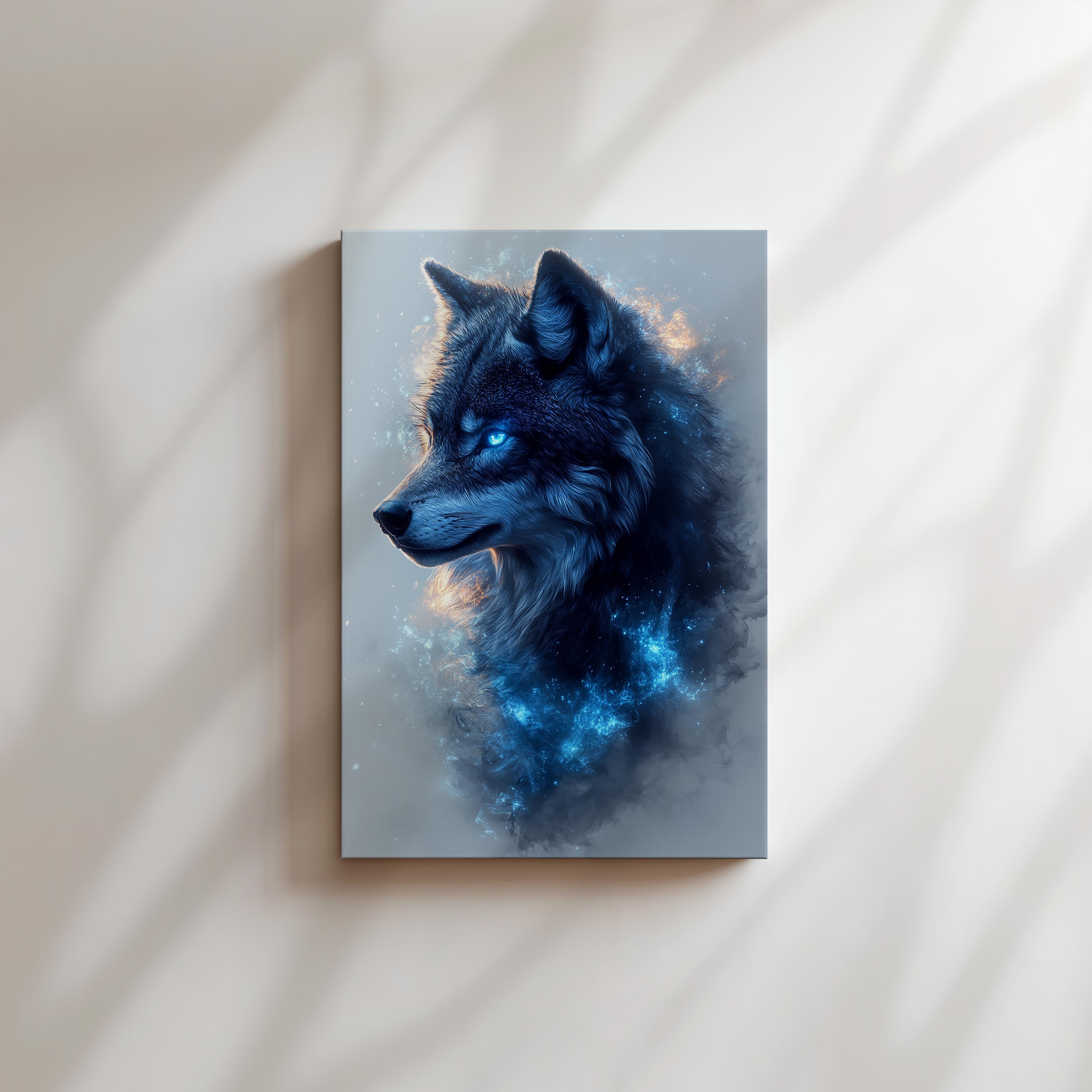 A mesmerizing portrait of a wolf with glowing blue eyes and an ethereal, celestial aura. The mix of deep blues and scattered light effects give it a cosmic, almost supernatural quality. The energy emanating from this piece makes it ideal for those who admire wolves, spirituality, or fantasy-inspired artwork. Whether displayed in a gaming room, meditation space, or modern living area, this piece brings an intense, mysterious presence that captivates the viewer. A perfect choice for lovers of wildlife art with a futuristic or mystical twist.