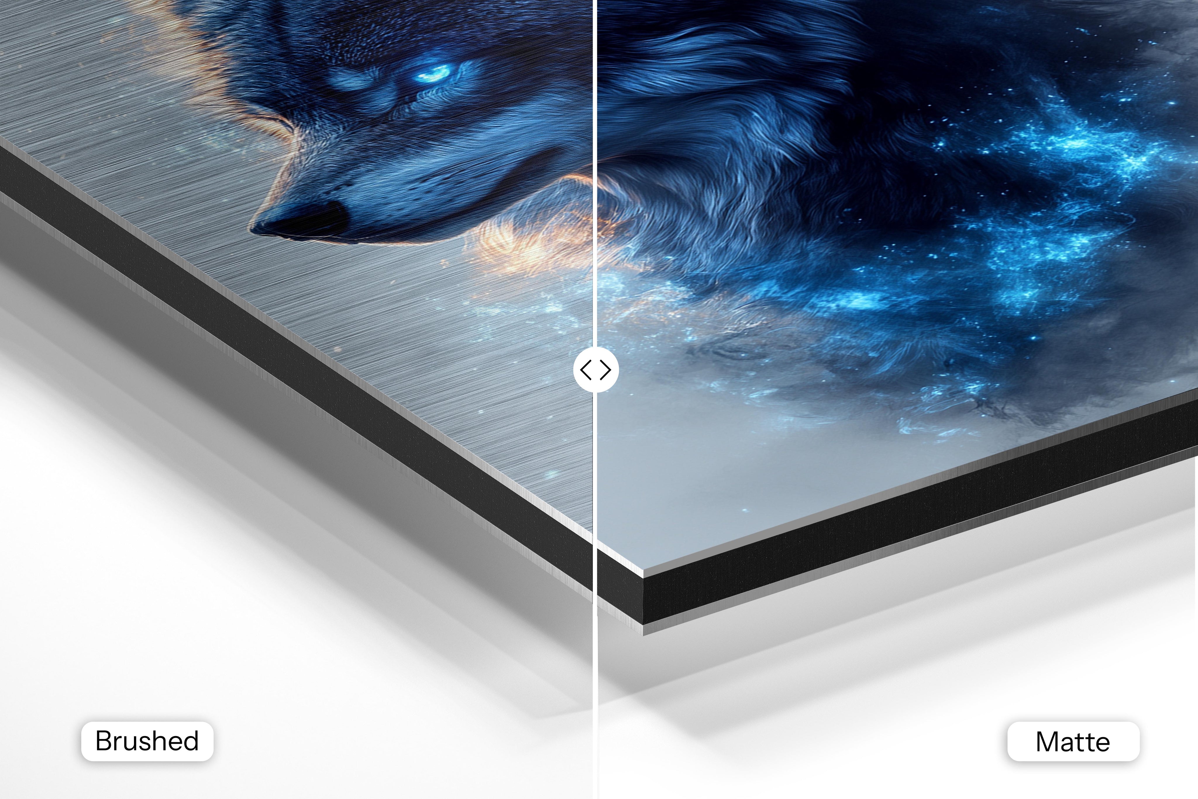 - Brushed Aluminum, on the other hand, features a raw metallic texture with visible brush strokes. Whites and highlights in your image let the silver surface show through, adding a dramatic, shimmering effect. Ideal for black-and-white images, minimalist designs, or abstract art, it creates a bold, industrial vibe with a modern edge.