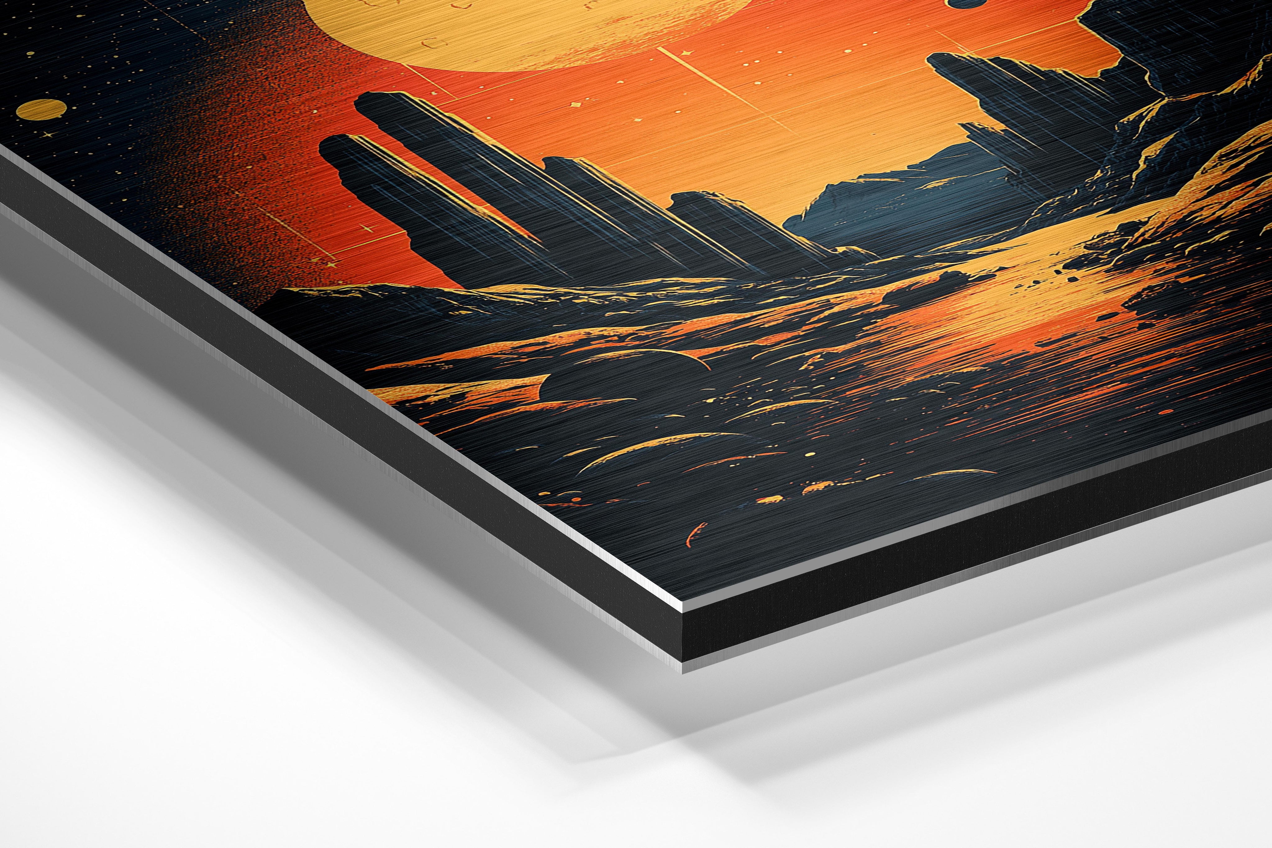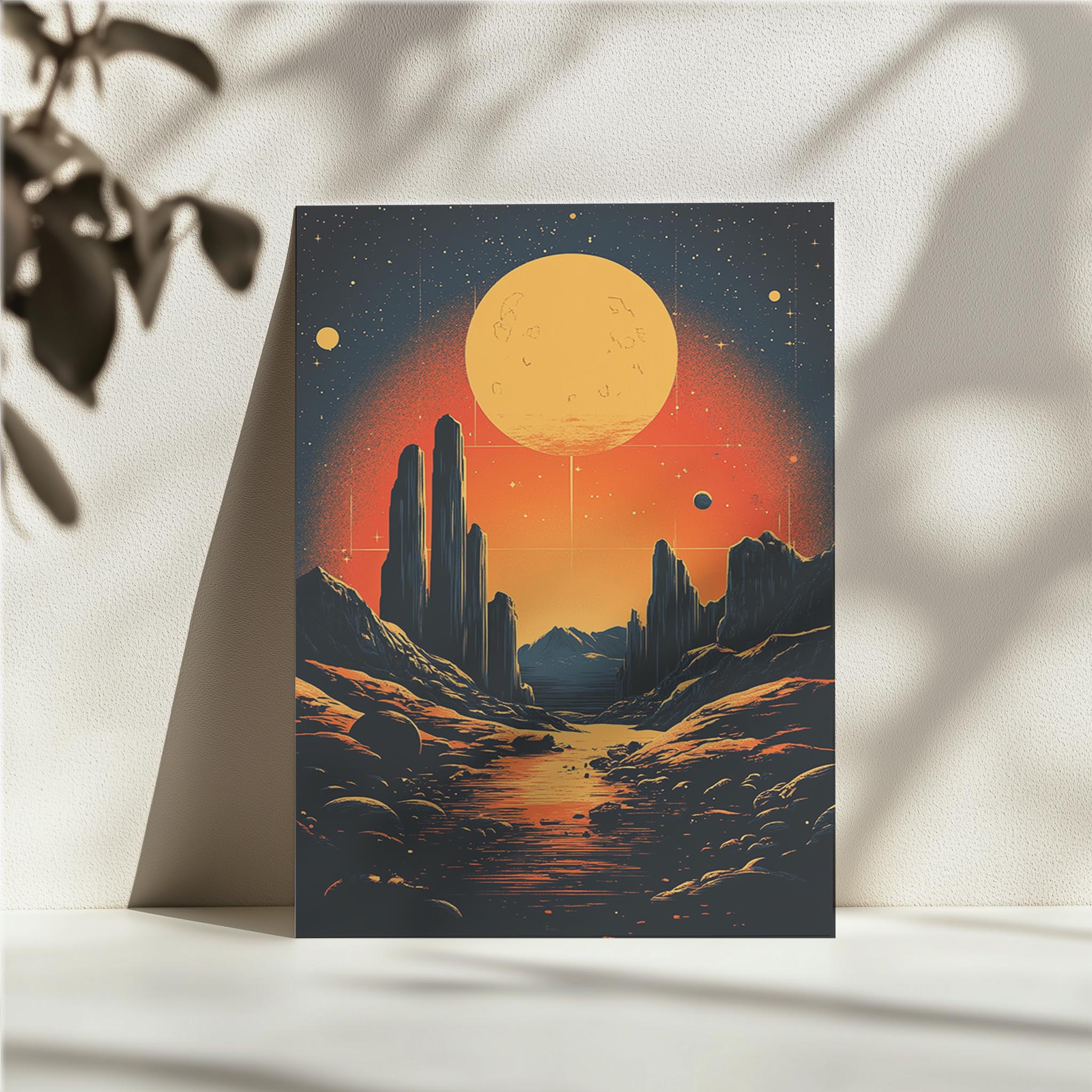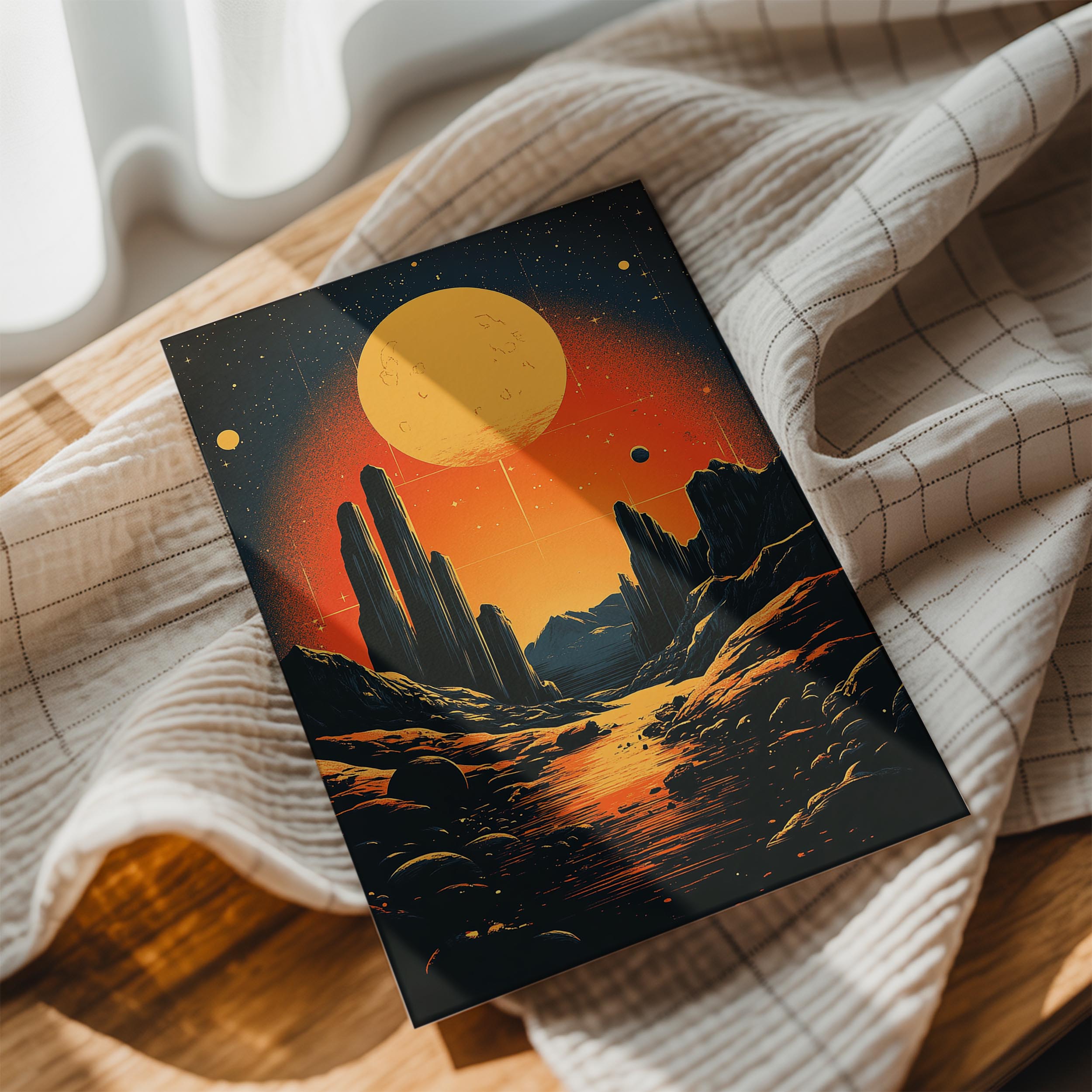 This breathtaking artwork blends the cosmic with the earthly, featuring a surreal canyon illuminated by a colossal golden moon. Stars twinkle in the deep navy sky, while the rugged canyon glows in orange and red hues. The reflective river running through the canyon adds a dreamlike quality, inviting viewers to imagine interstellar journeys. Perfect for sci-fi fans or nature enthusiasts, this piece would shine in living rooms, creative studios, or themed spaces. It evokes wonder and curiosity, combining the mystique of the universe with the beauty of rugged terrestrial landscapes.