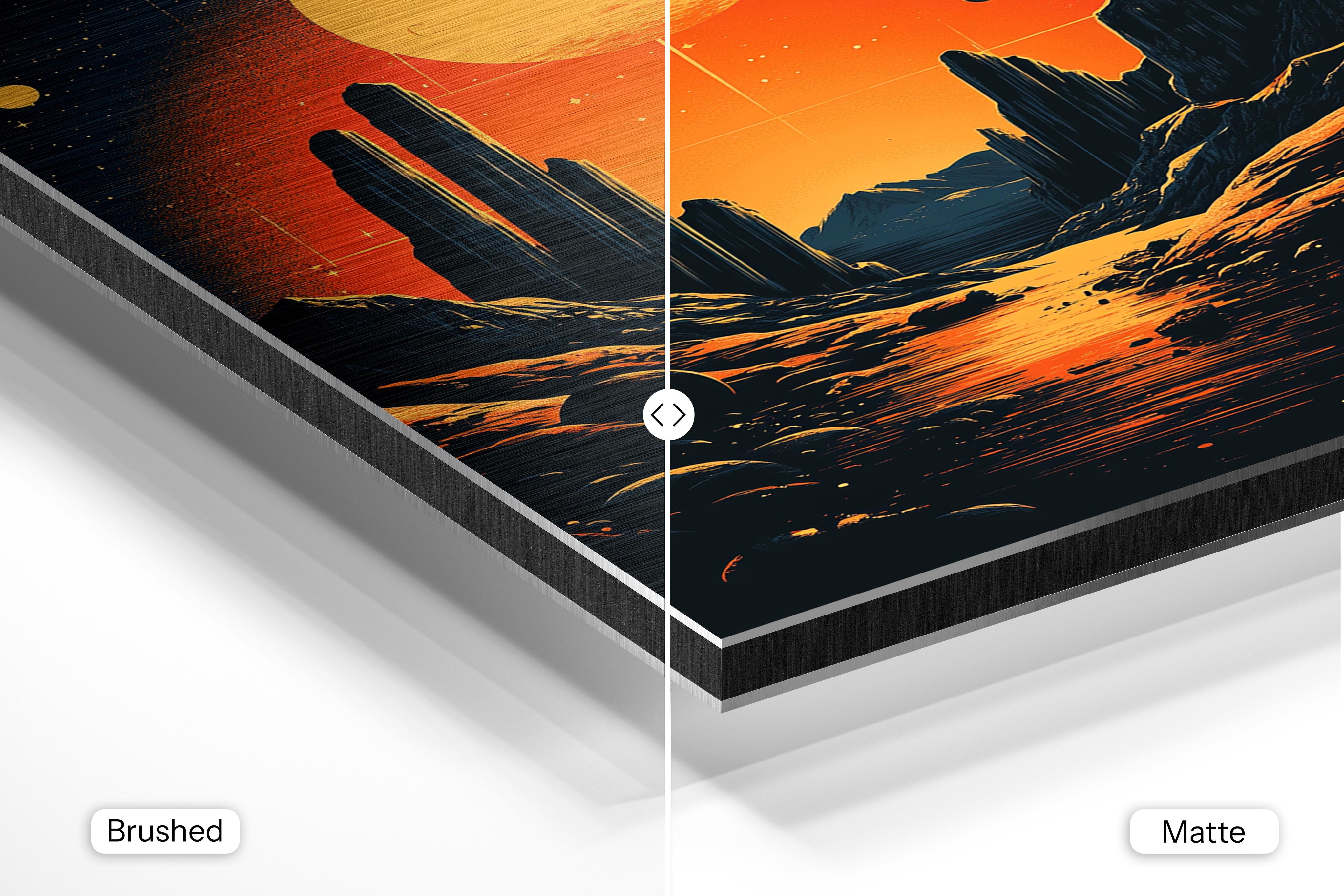 - Brushed Aluminum, on the other hand, features a raw metallic texture with visible brush strokes. Whites and highlights in your image let the silver surface show through, adding a dramatic, shimmering effect. Ideal for black-and-white images, minimalist designs, or abstract art, it creates a bold, industrial vibe with a modern edge.
