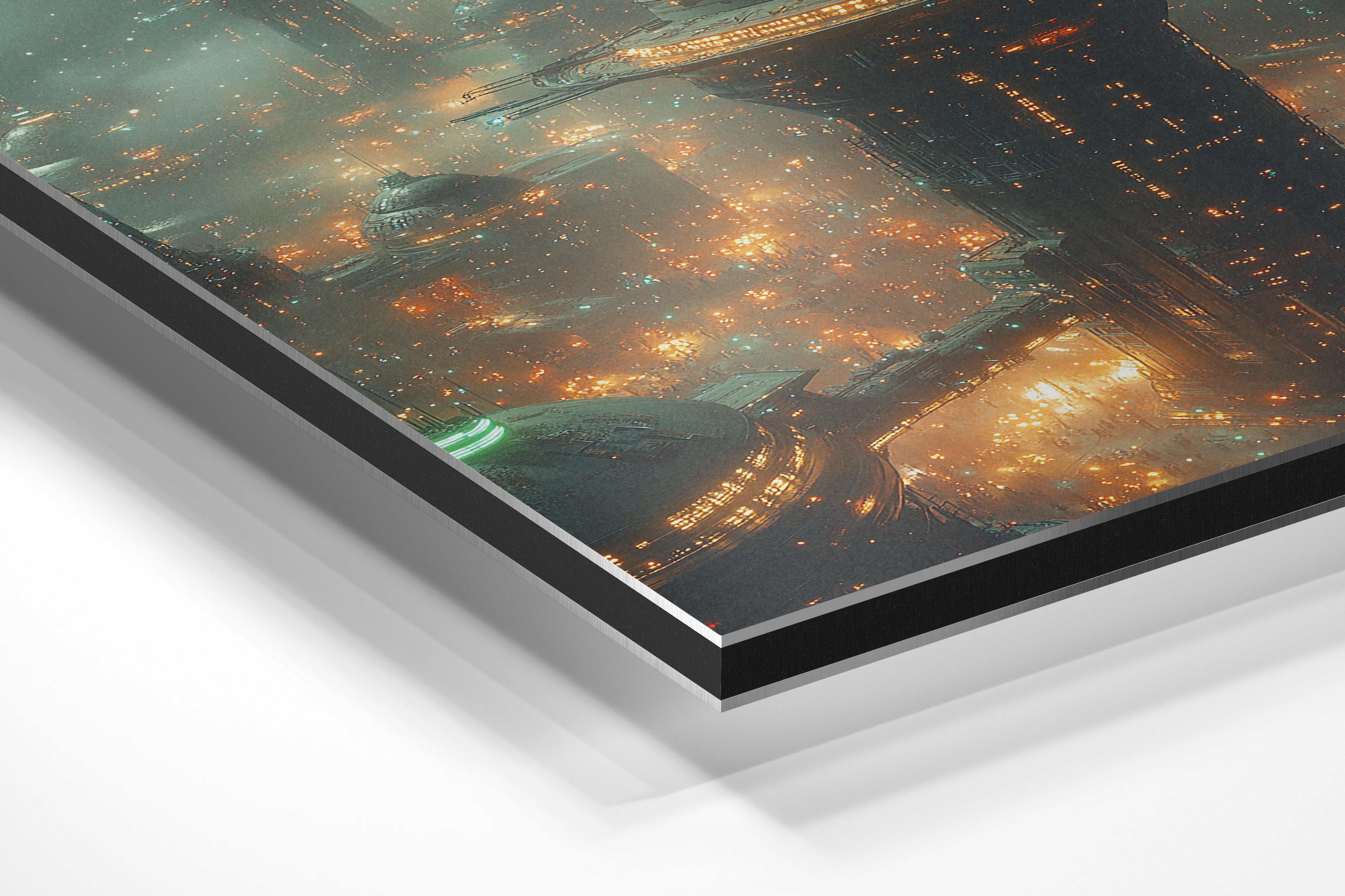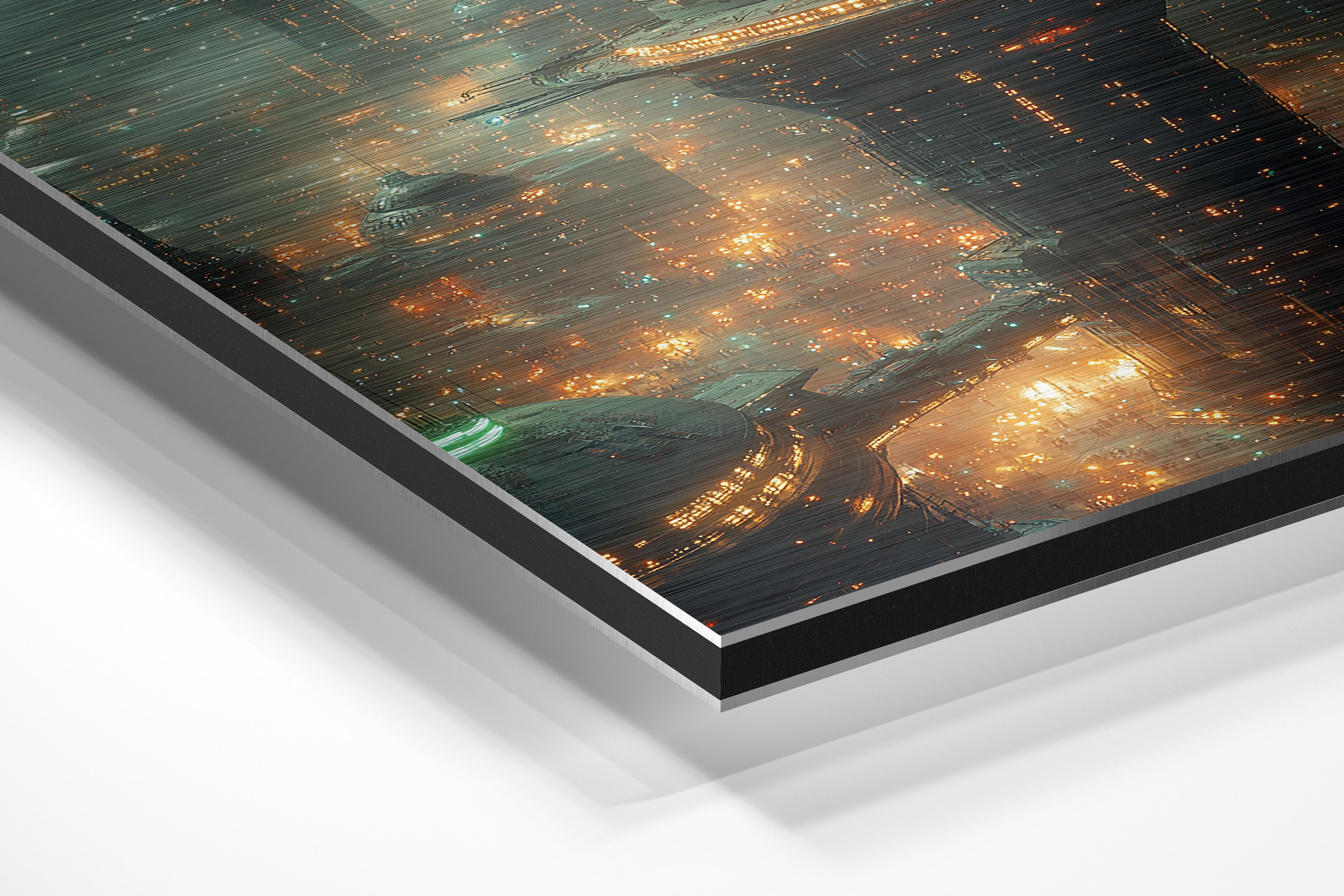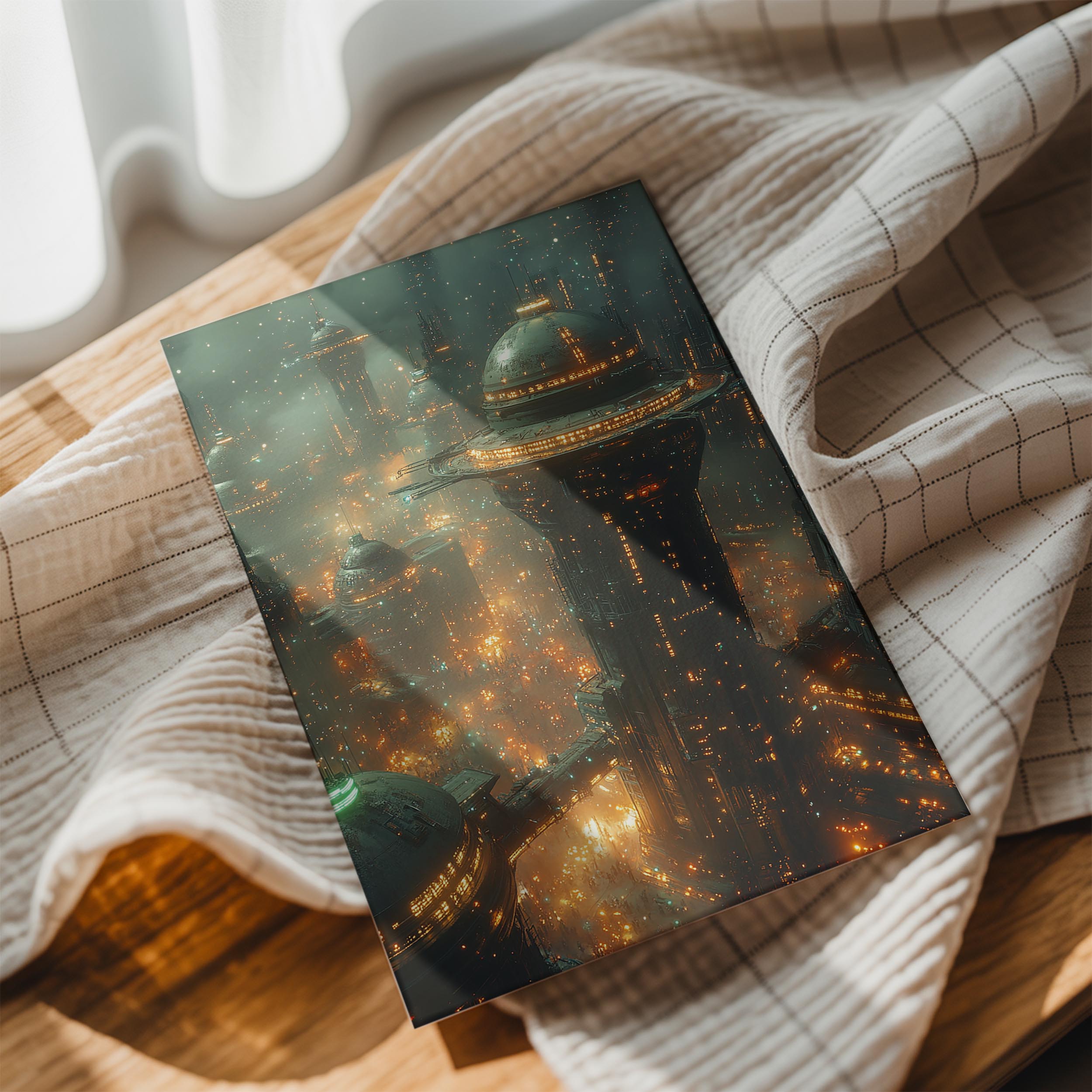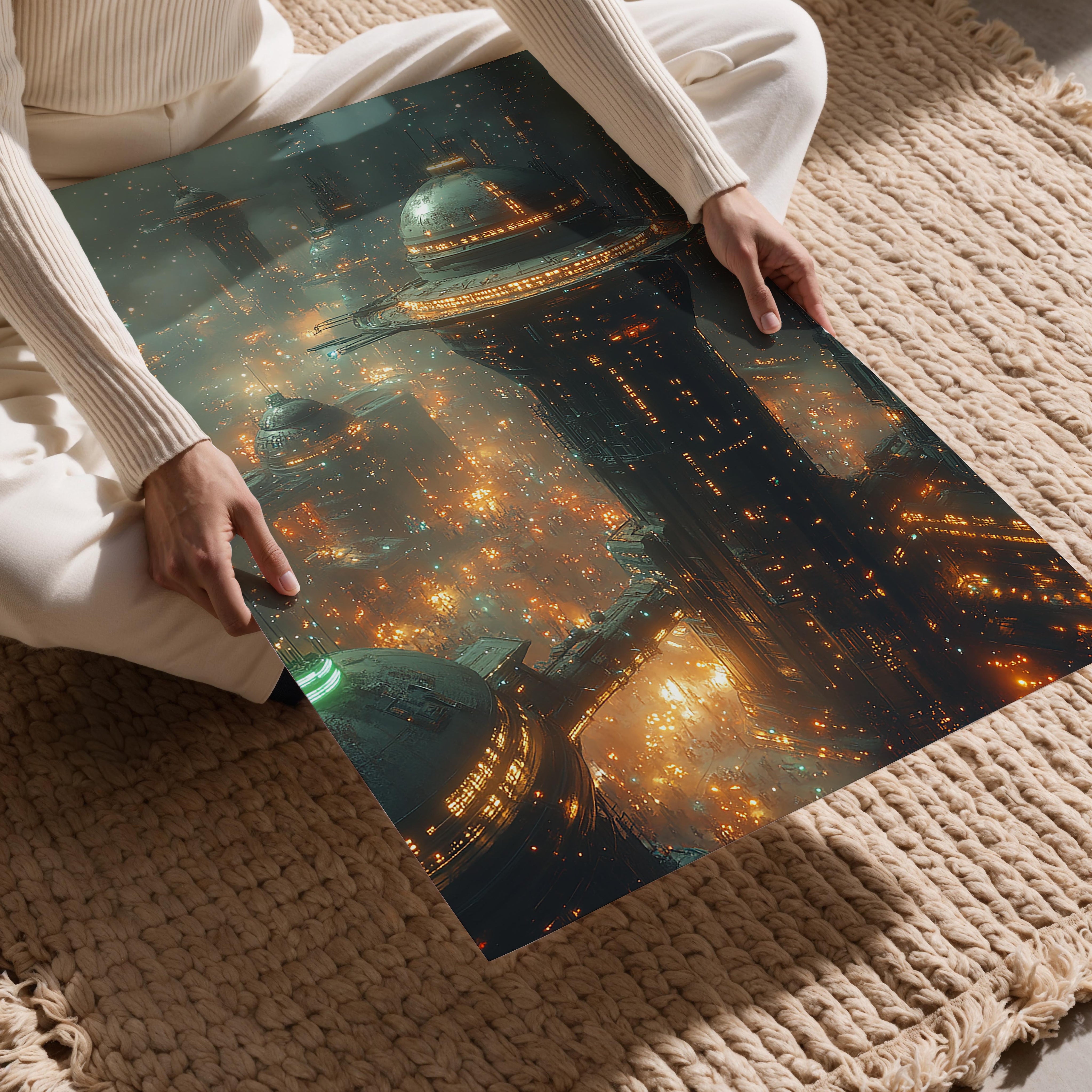 This atmospheric artwork captures a bustling cosmic city at night, with glowing lights and futuristic architecture. The misty ambiance and detailed structures create a sense of awe and wonder. Perfect for urban or futuristic-themed interiors, this piece brings a sense of grandeur and imagination to any space.