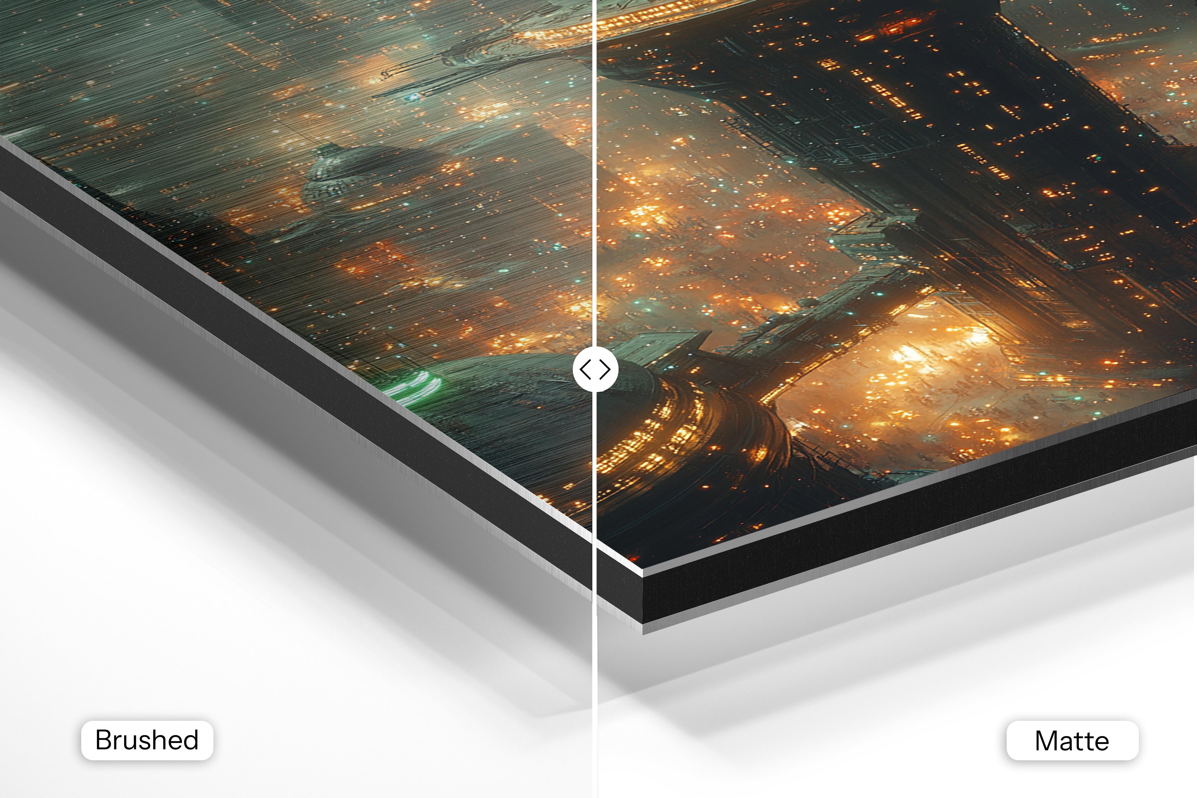 - Brushed Aluminum, on the other hand, features a raw metallic texture with visible brush strokes. Whites and highlights in your image let the silver surface show through, adding a dramatic, shimmering effect. Ideal for black-and-white images, minimalist designs, or abstract art, it creates a bold, industrial vibe with a modern edge.