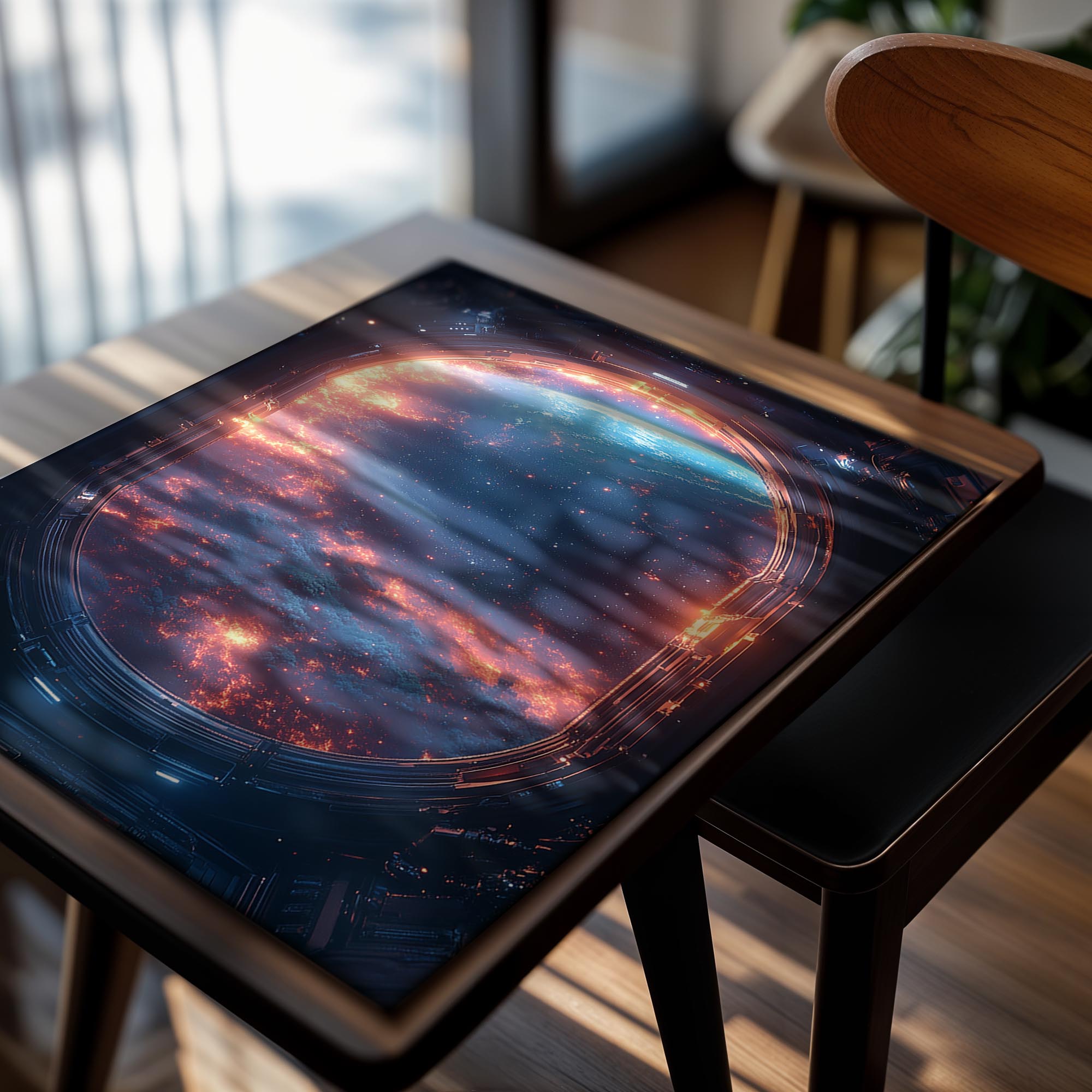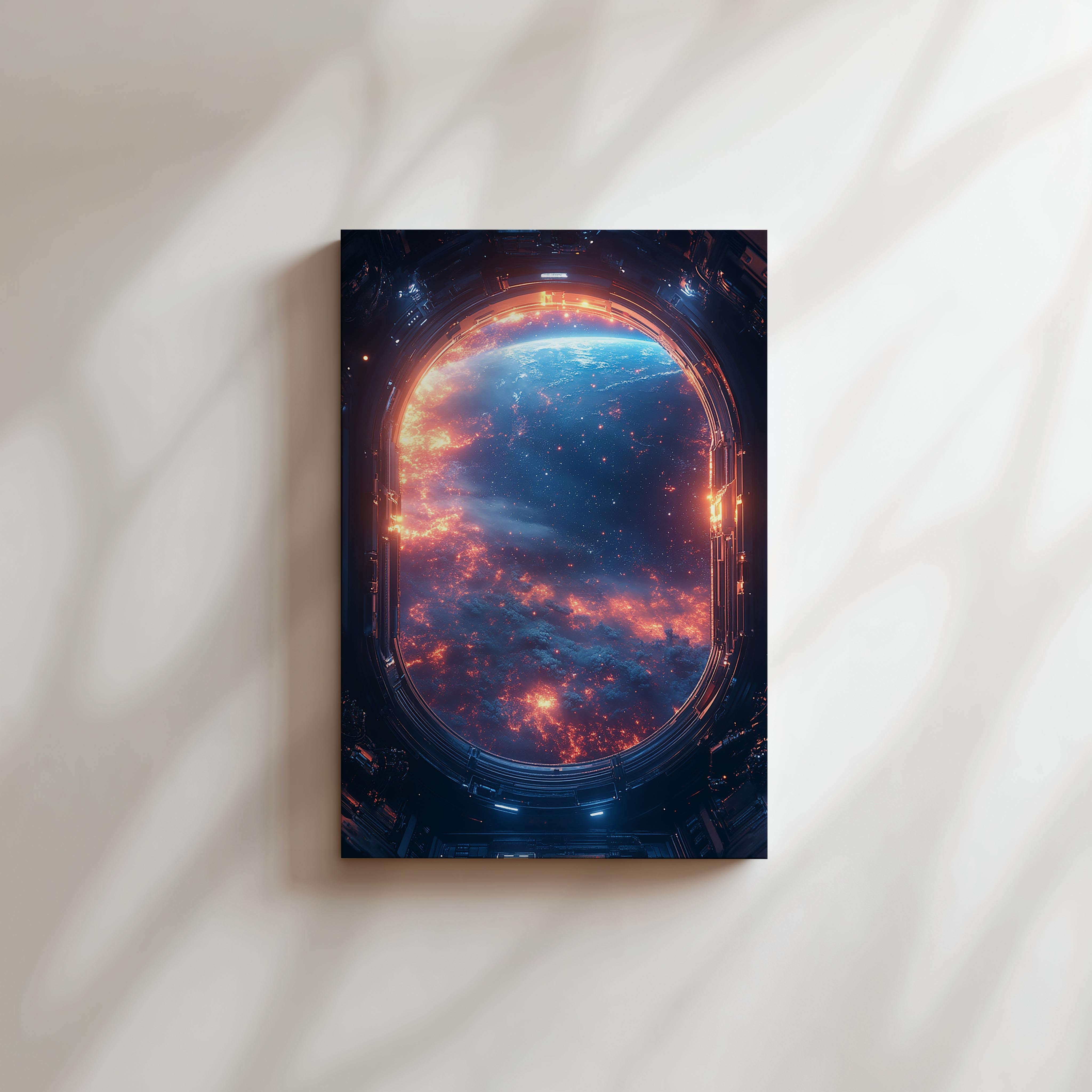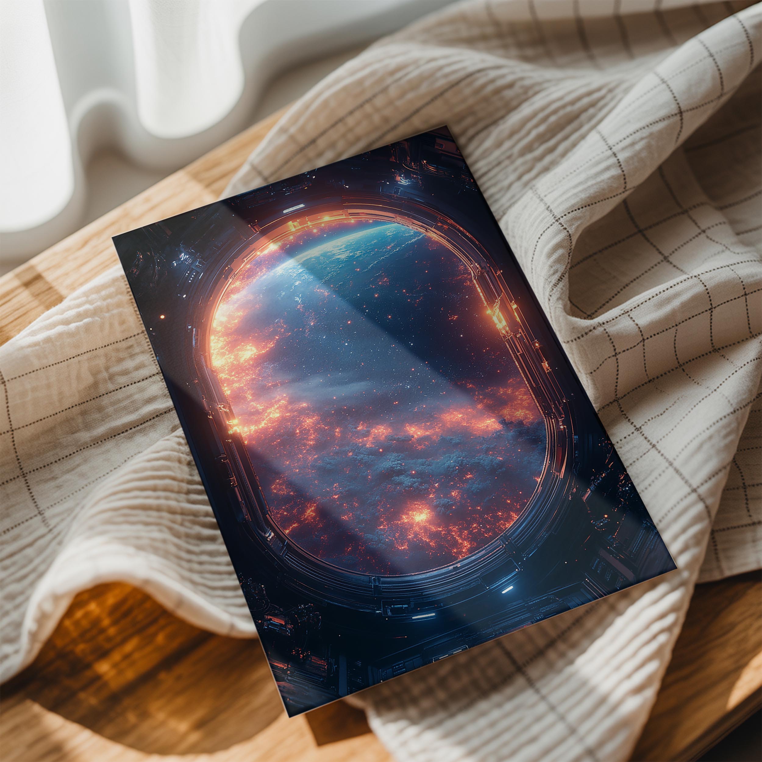 This breathtaking image offers a stunning perspective of Earth as seen from a spacecraft window. The fiery orange and red hues along the planet's edge contrast beautifully with the cool blues of the atmosphere, creating a striking visual impact. The intricate details of the spacecraft’s frame enhance the immersive quality of the scene, making it feel like a snapshot from a sci-fi movie. Perfect for space-themed designs, educational materials, or inspiring content, this artwork celebrates the beauty and wonder of our planet in the cosmos. It’s a captivating choice for any audience.