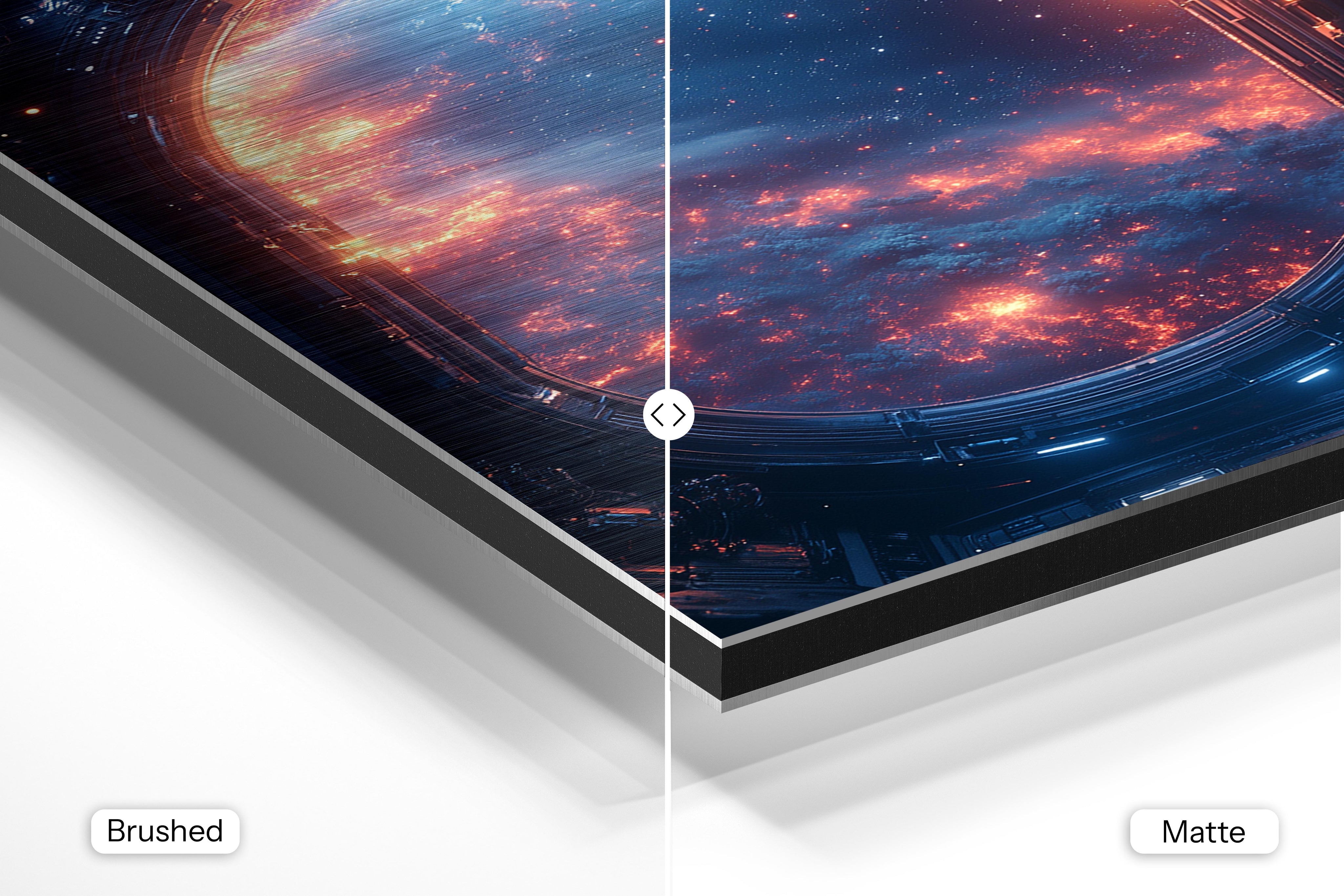 - Brushed Aluminum, on the other hand, features a raw metallic texture with visible brush strokes. Whites and highlights in your image let the silver surface show through, adding a dramatic, shimmering effect. Ideal for black-and-white images, minimalist designs, or abstract art, it creates a bold, industrial vibe with a modern edge.