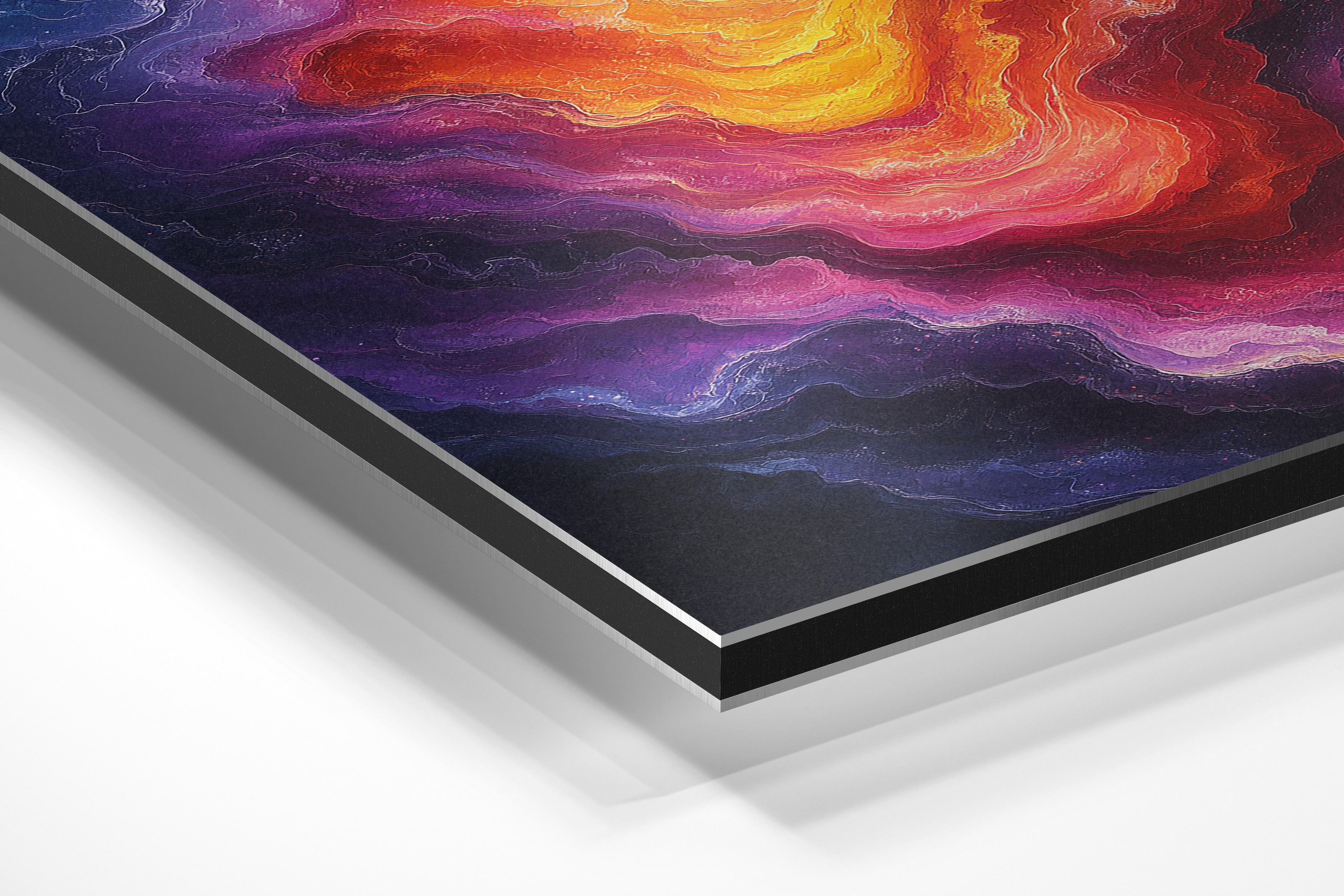 This vibrant abstract artwork portrays a cosmic phenomenon with swirling waves of fiery orange, yellow, and hints of deep violet. The blending colors and energetic strokes create the illusion of a galactic storm, teeming with motion and intensity. The painting's dramatic interplay of light and dark makes it a captivating centerpiece for a creative space or living room. Perfect for those who enjoy celestial themes and bold, immersive visuals.