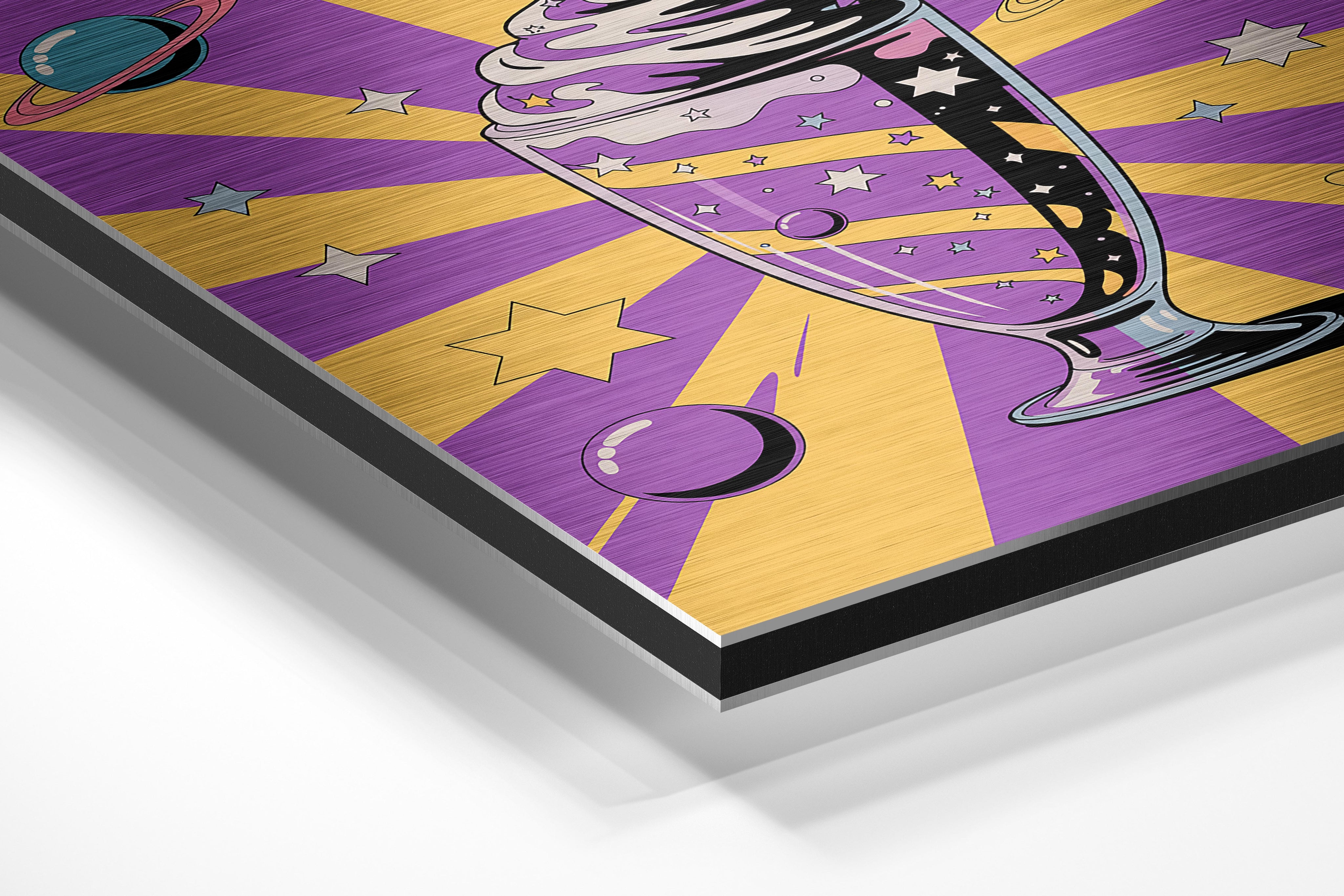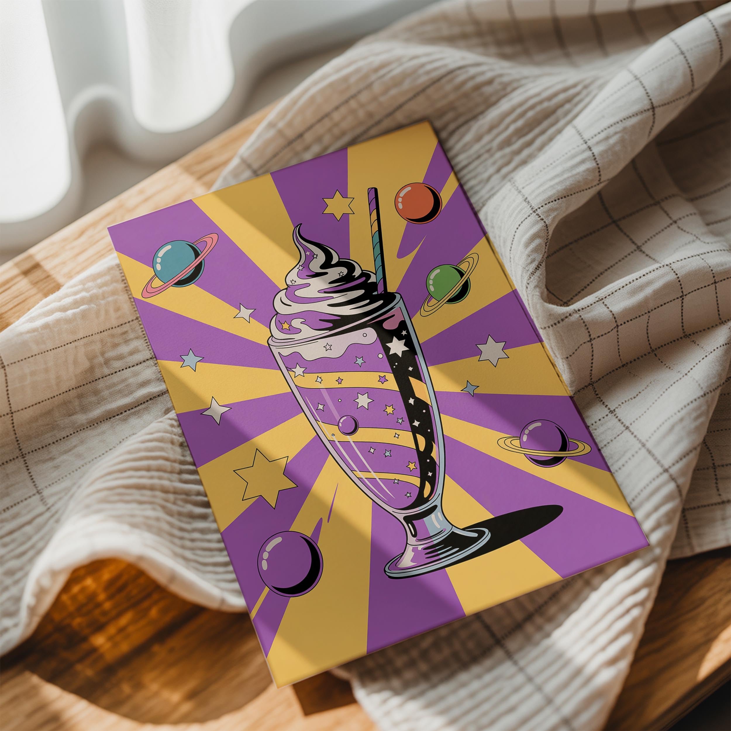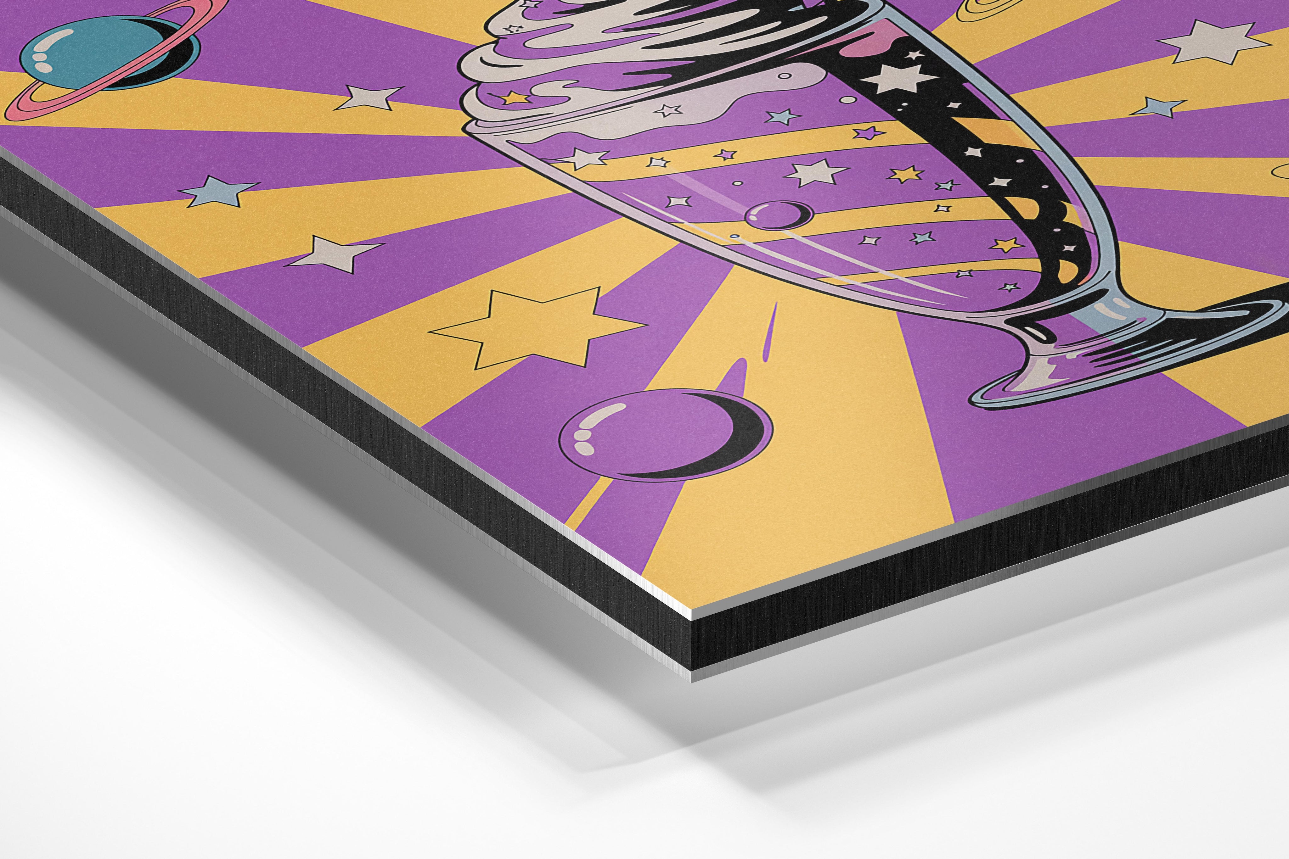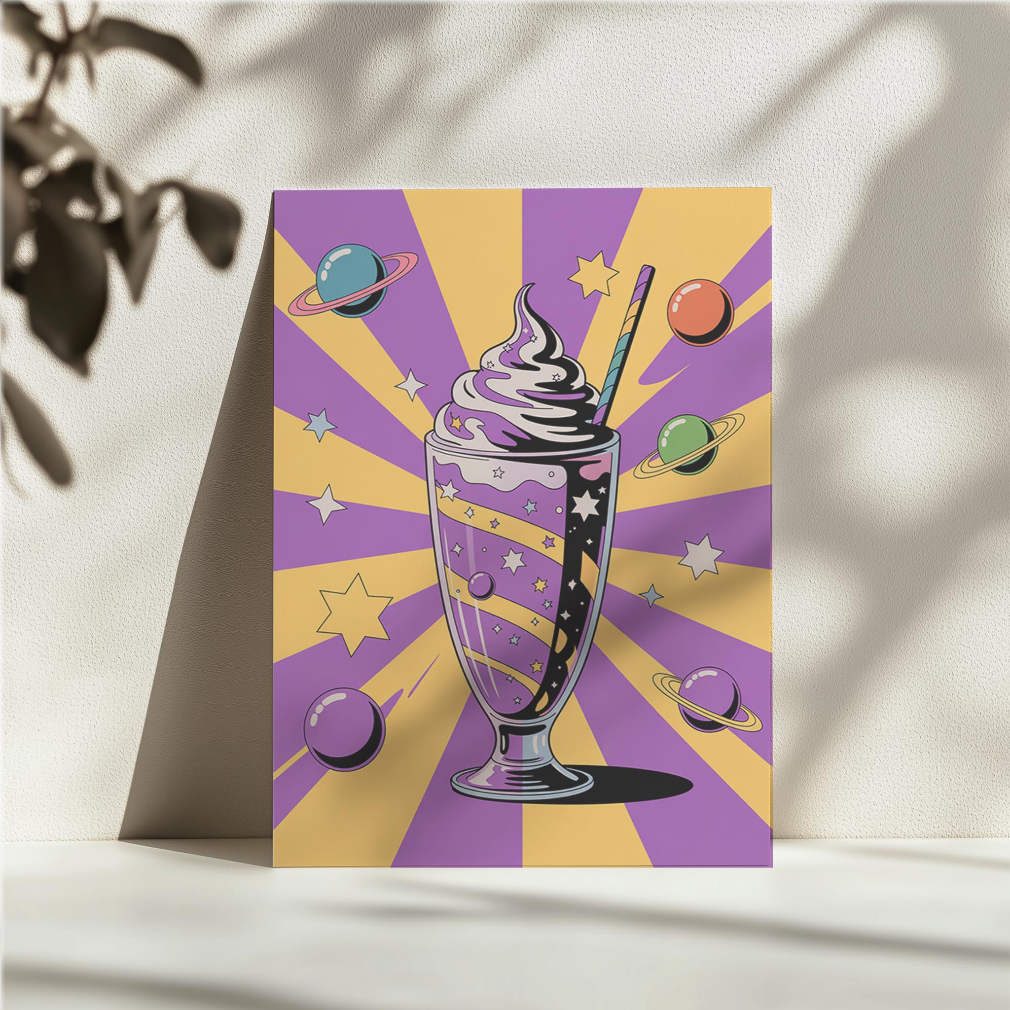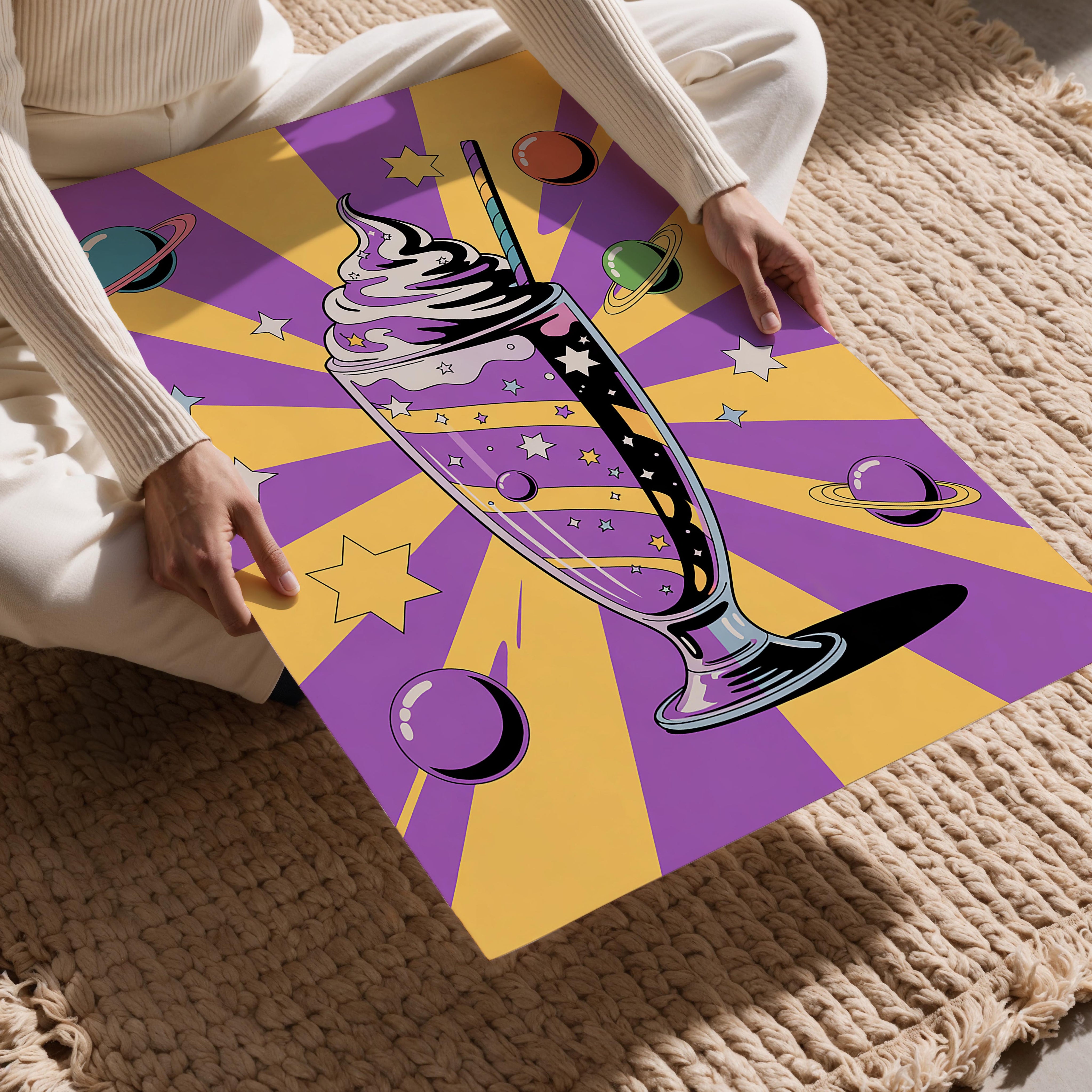 A tall milkshake glass filled with swirling galaxies and topped with whipped cream floats against a starburst purple and yellow backdrop. Orbiting planets and stars surround the drink, blending dessert with astronomy. Ideal for kitchens, cafés, ice cream parlors, or children's spaces, this piece appeals to sweet tooths and dreamers alike. The cosmic elements give it an otherworldly flair while keeping the mood playful and imaginative. It’s a fantastic mix of pop-art, sci-fi, and whimsy.