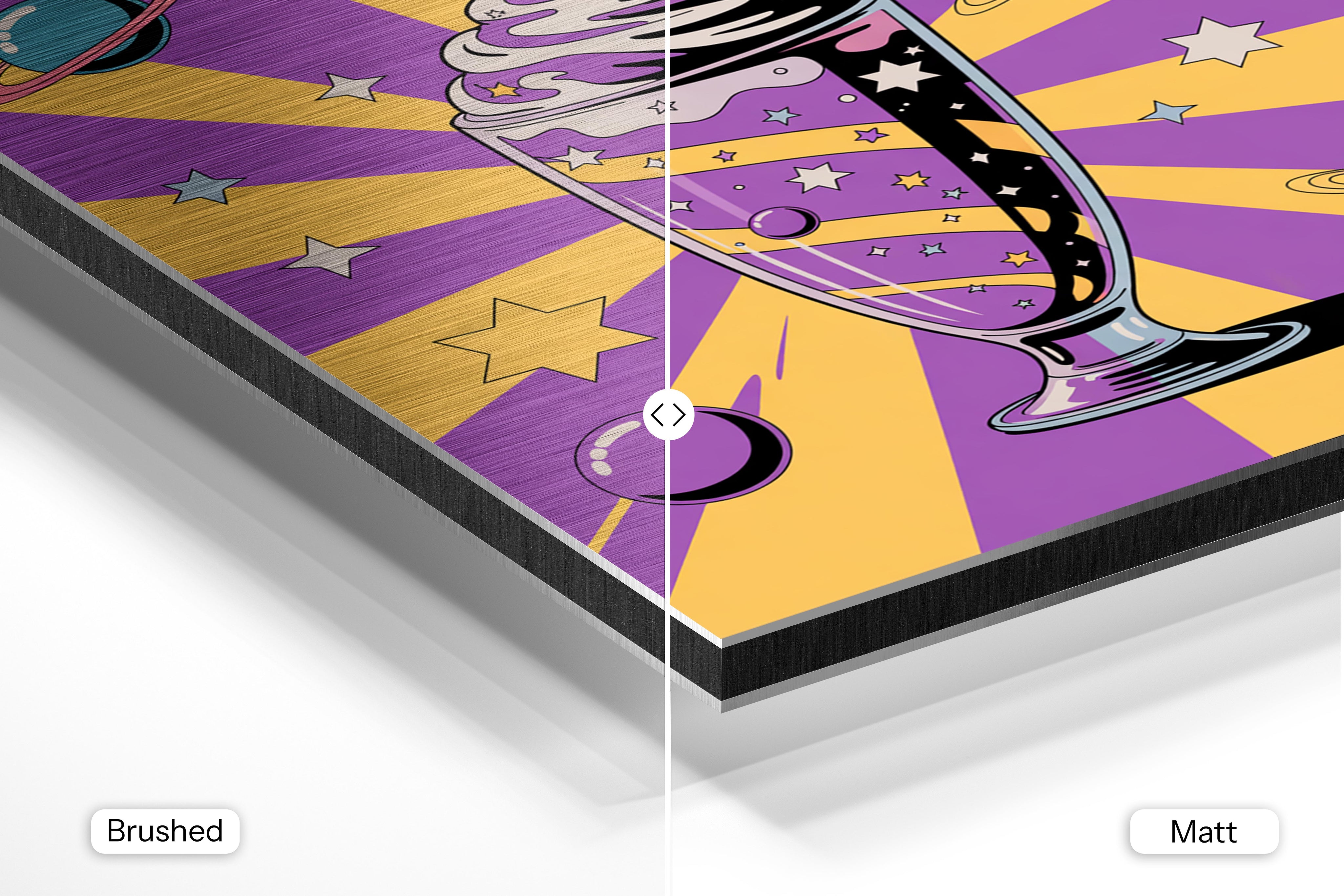 - Brushed Aluminum, on the other hand, features a raw metallic texture with visible brush strokes. Whites and highlights in your image let the silver surface show through, adding a dramatic, shimmering effect. Ideal for black-and-white images, minimalist designs, or abstract art, it creates a bold, industrial vibe with a modern edge.