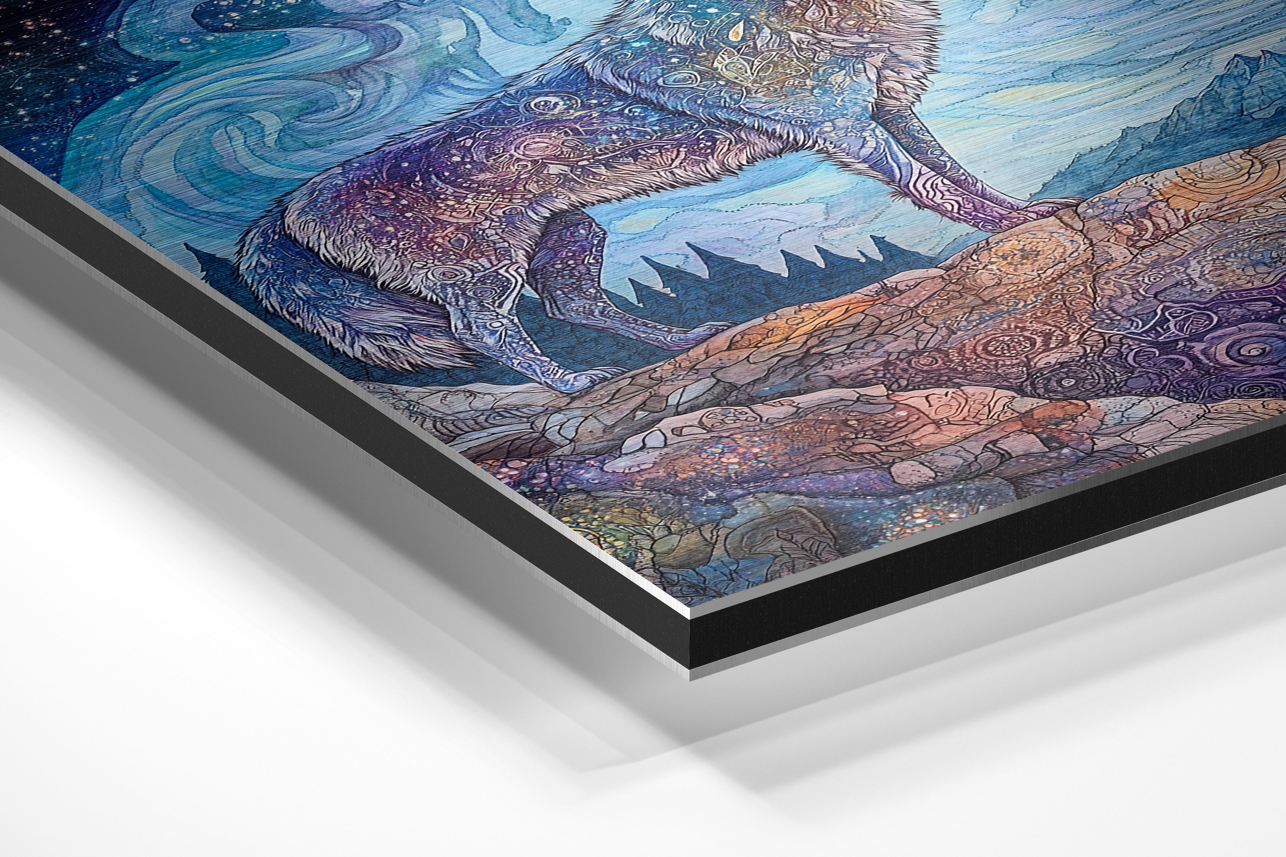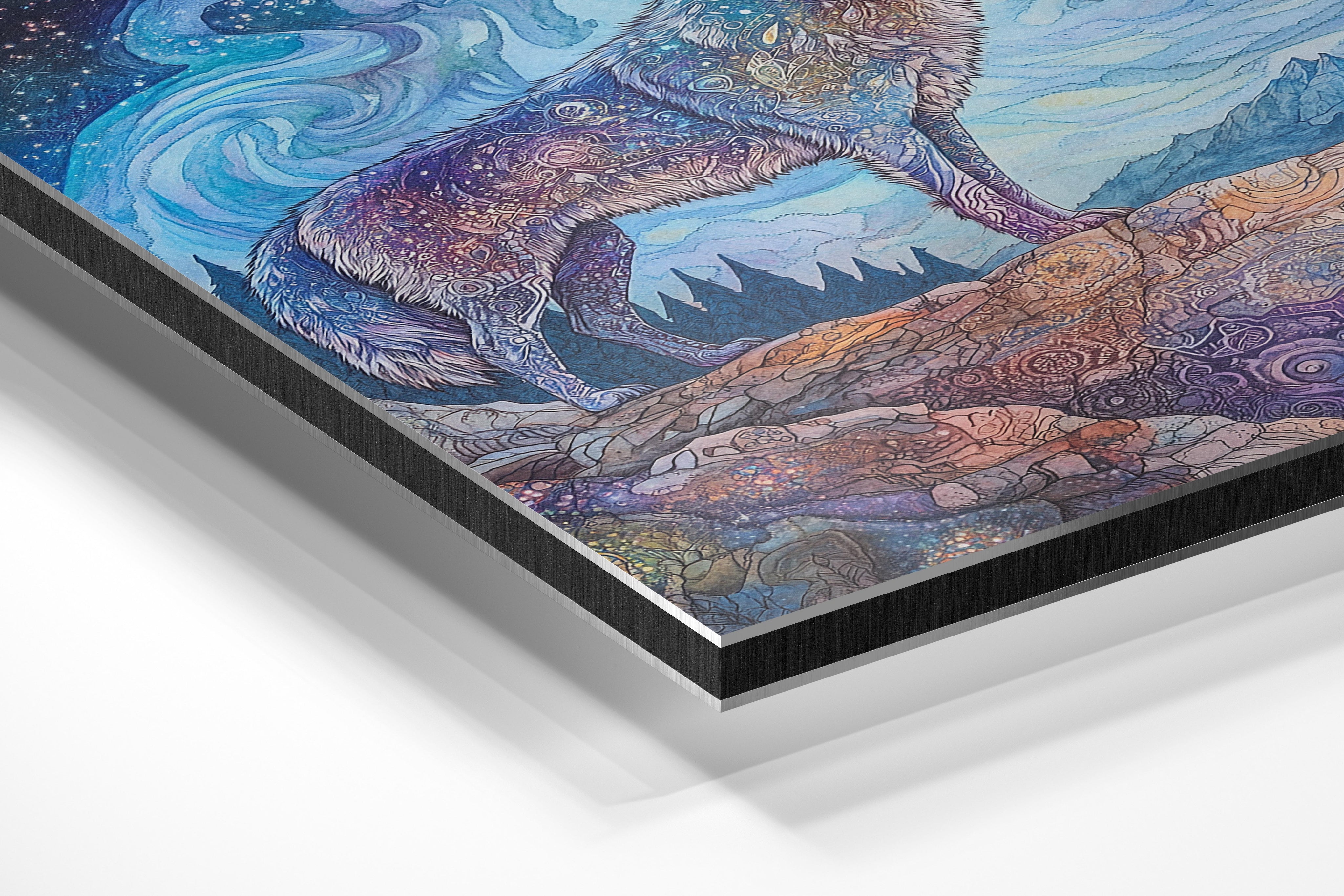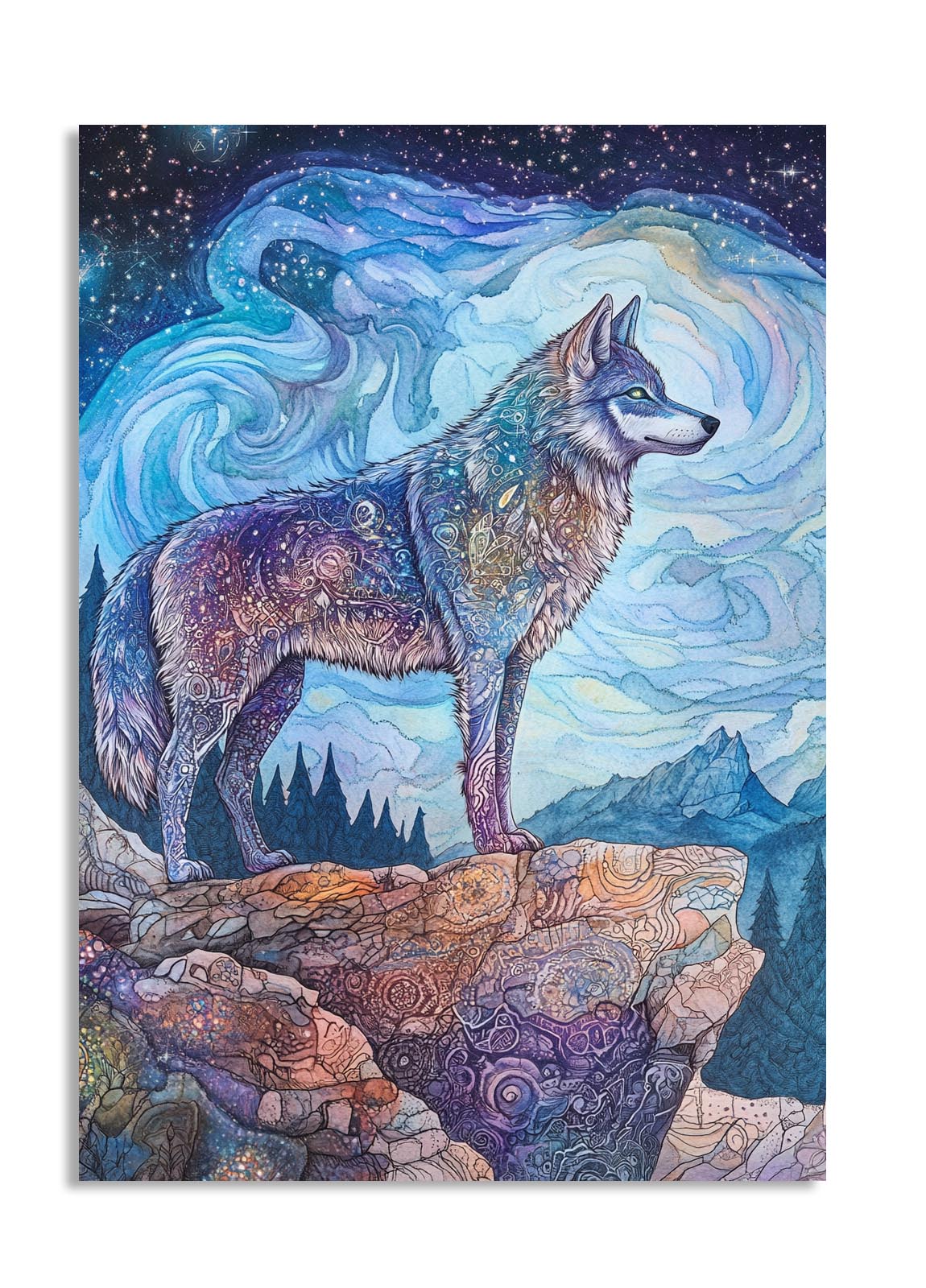 A breathtaking cosmic wolf stands against a swirling celestial sky, embodying strength, wisdom, and the vast mysteries of the universe. The intricate patterns on its fur glow with ethereal blues and purples, blending seamlessly with the galaxy above. This piece radiates spiritual energy, making it perfect for those who appreciate mythology, nature, and space exploration. A stunning addition to meditation spaces, cosmic-themed rooms, or as a focal point in an adventurous interior.