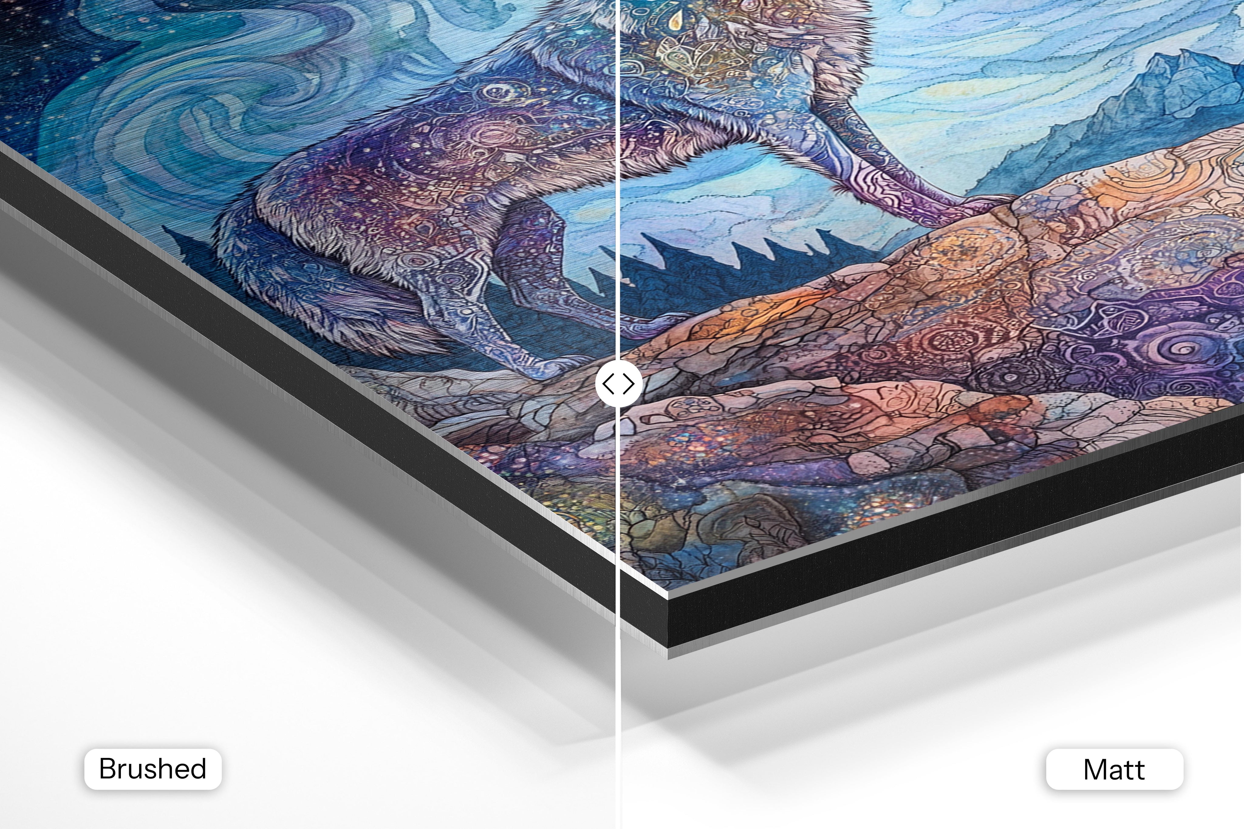 - Brushed Aluminum, on the other hand, features a raw metallic texture with visible brush strokes. Whites and highlights in your image let the silver surface show through, adding a dramatic, shimmering effect. Ideal for black-and-white images, minimalist designs, or abstract art, it creates a bold, industrial vibe with a modern edge.