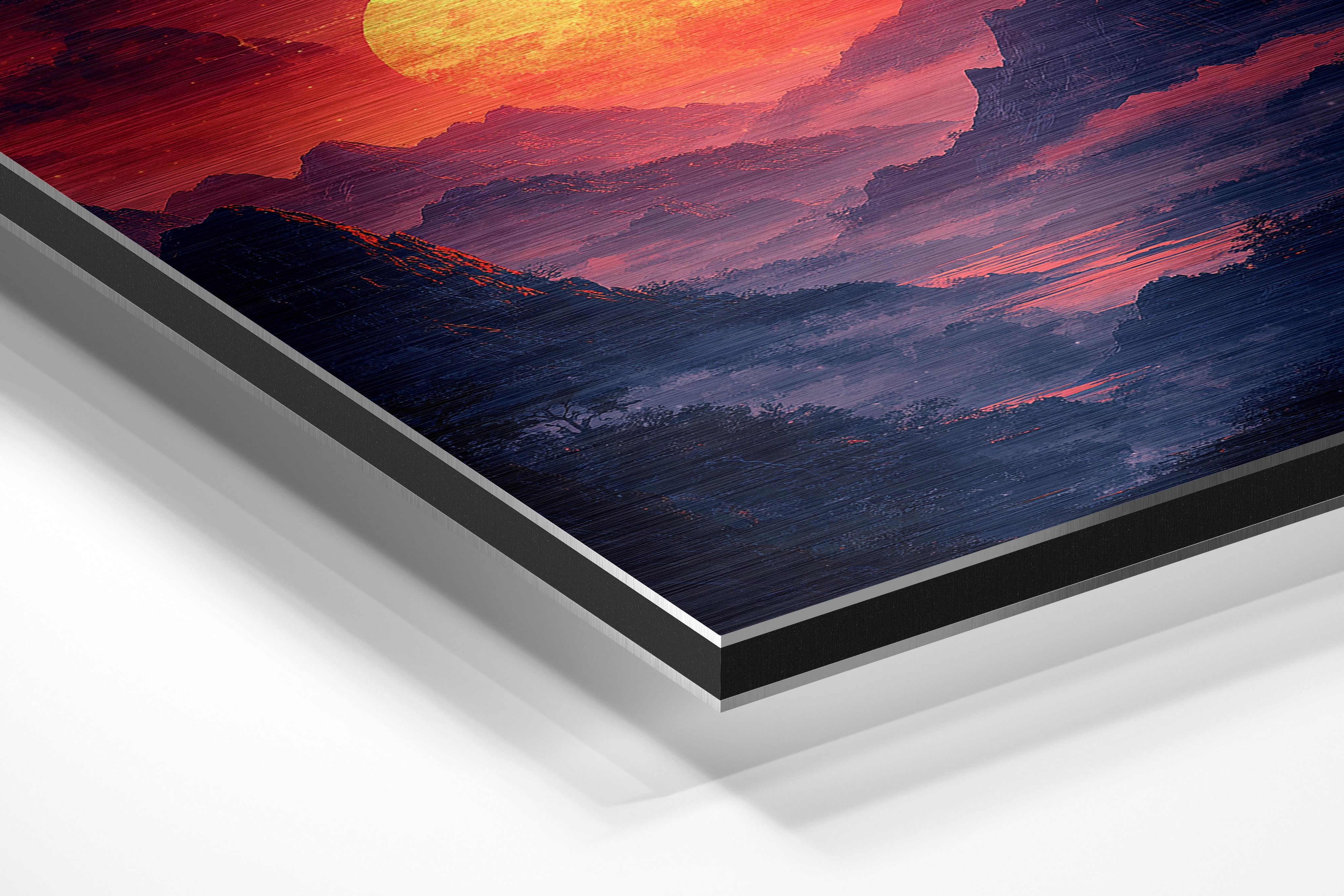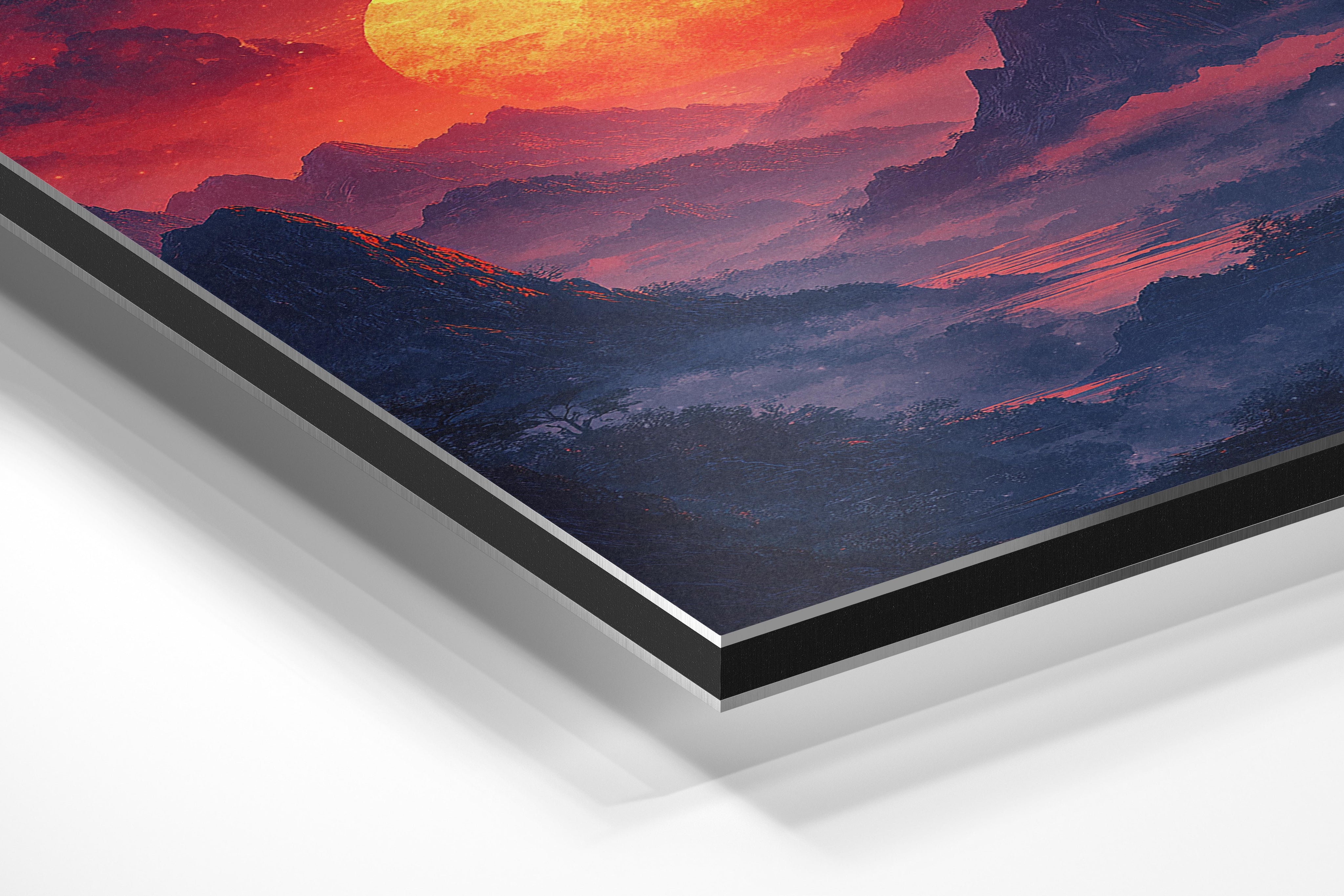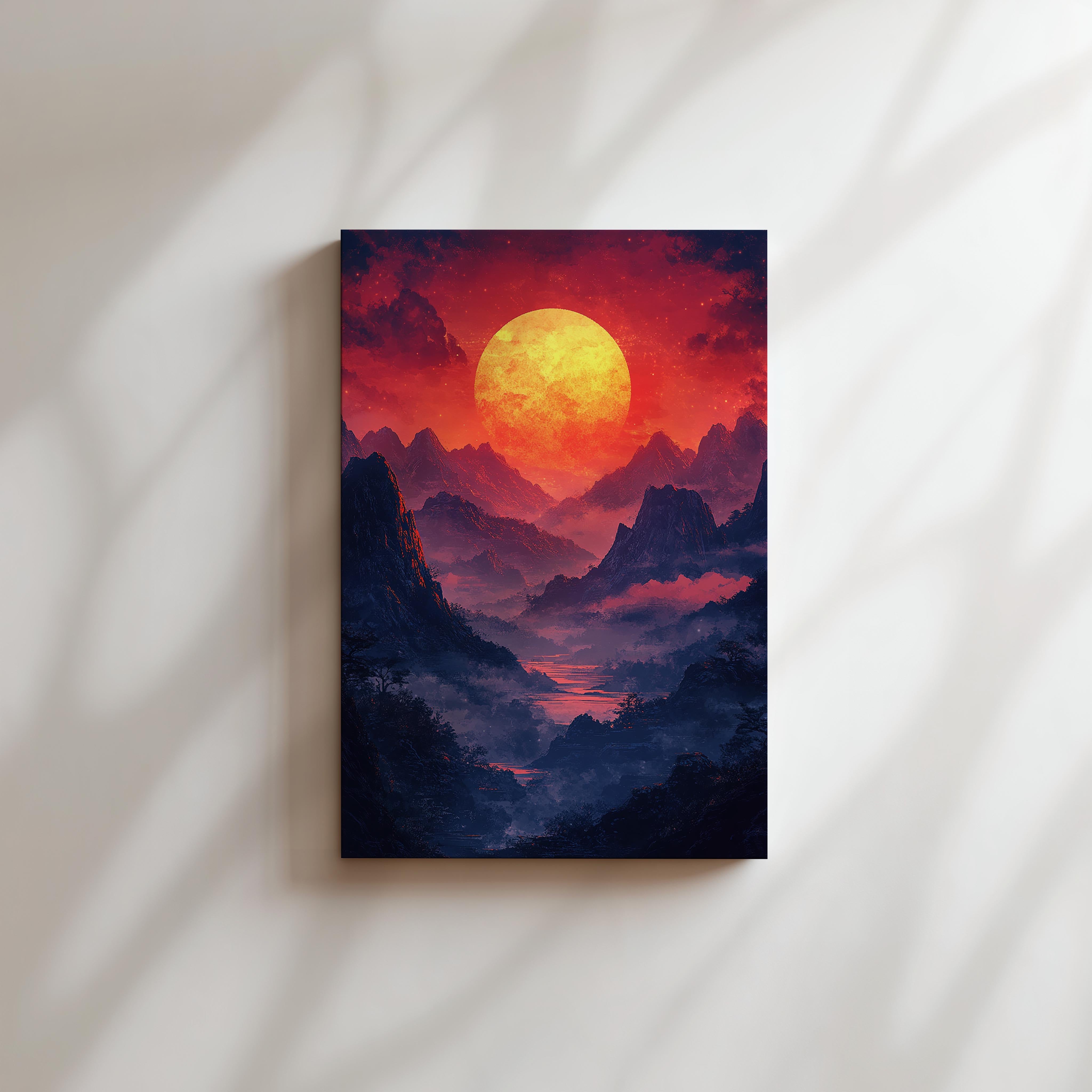 A majestic crimson sunset bathes a series of rugged mountain peaks in a warm, golden light. The vibrant red and orange tones create an otherworldly ambiance, making it perfect for lovers of dramatic landscapes and atmospheric decor. A standout piece for rustic or adventure-themed spaces.