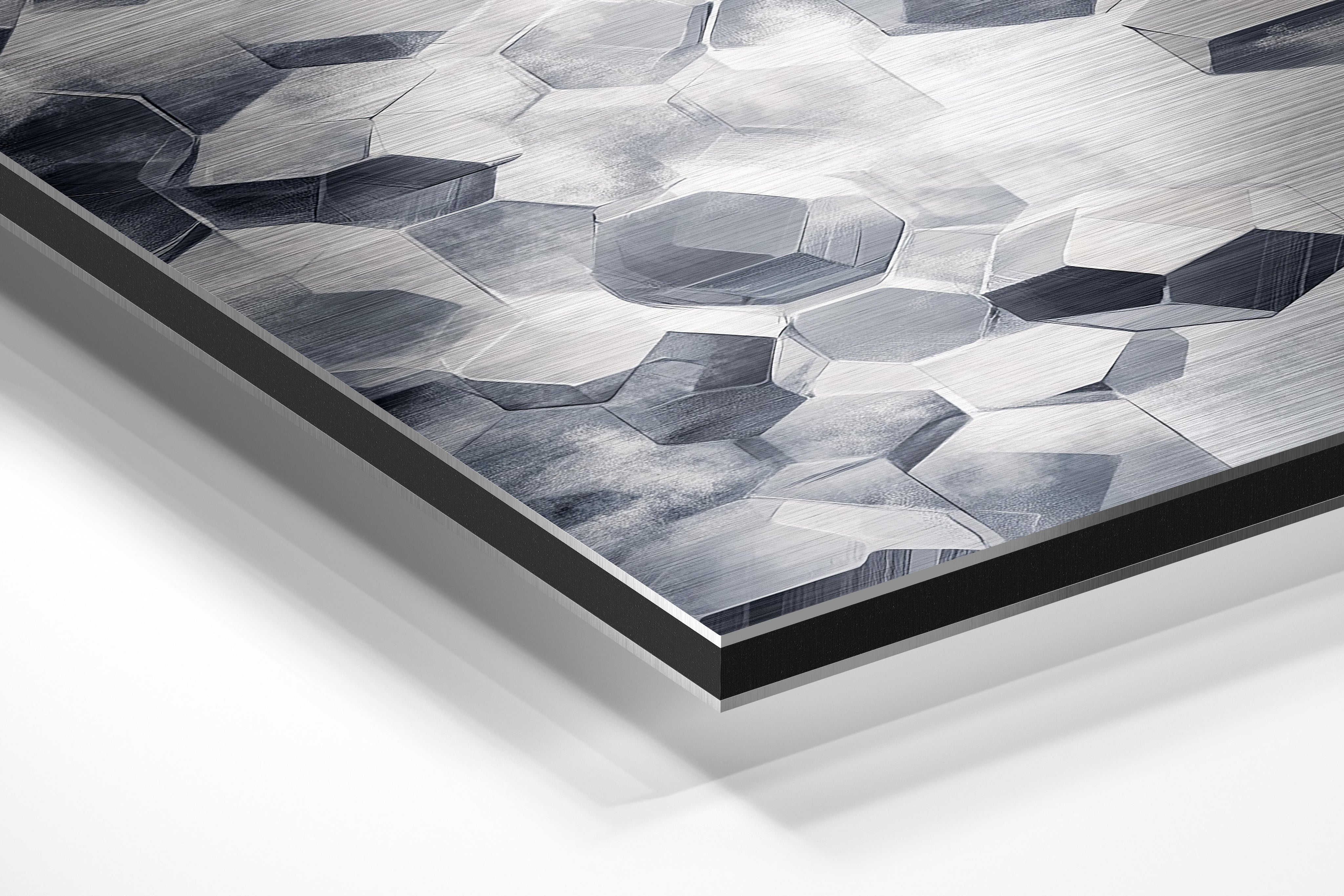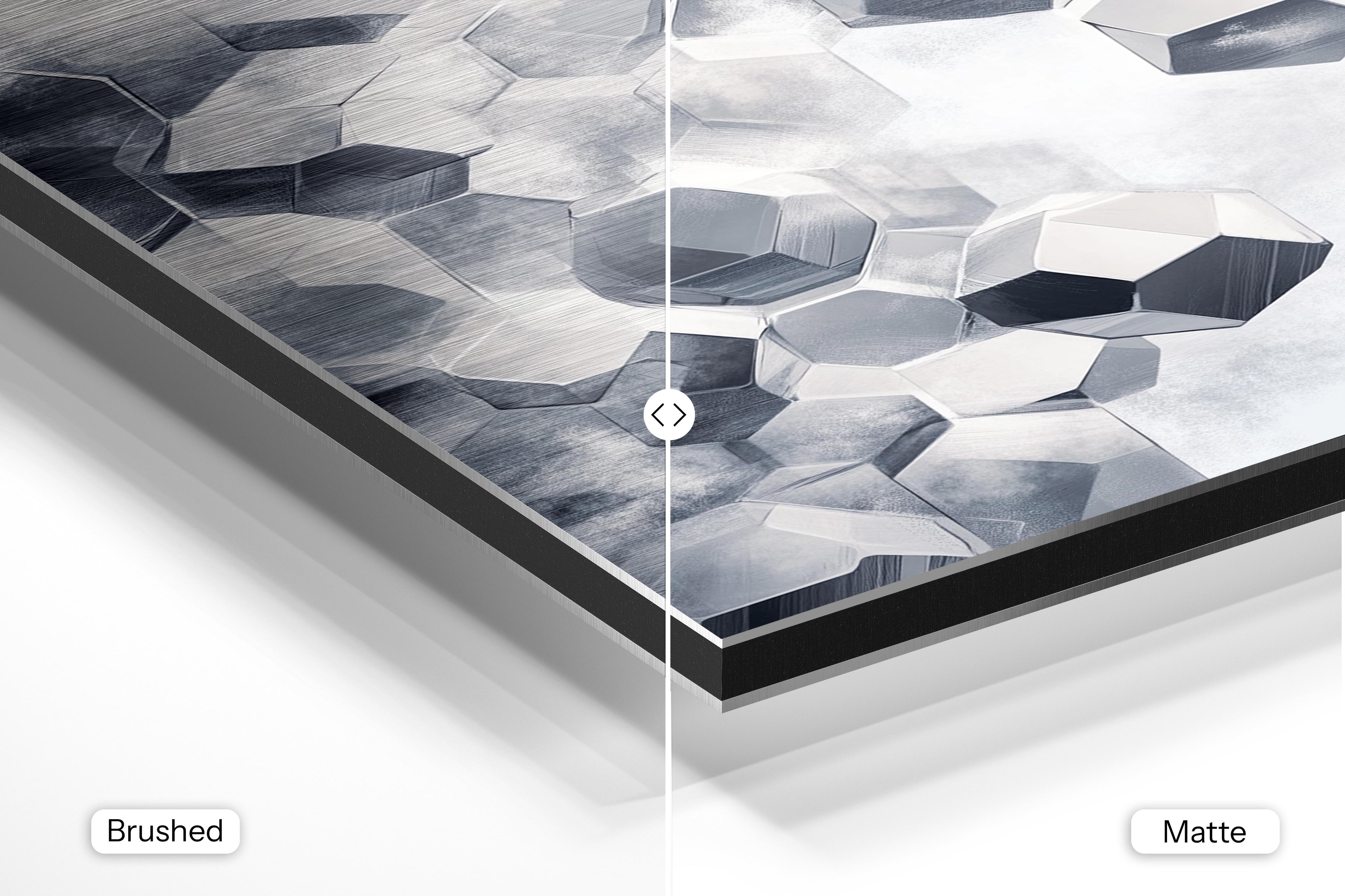 - Brushed Aluminum, on the other hand, features a raw metallic texture with visible brush strokes. Whites and highlights in your image let the silver surface show through, adding a dramatic, shimmering effect. Ideal for black-and-white images, minimalist designs, or abstract art, it creates a bold, industrial vibe with a modern edge.