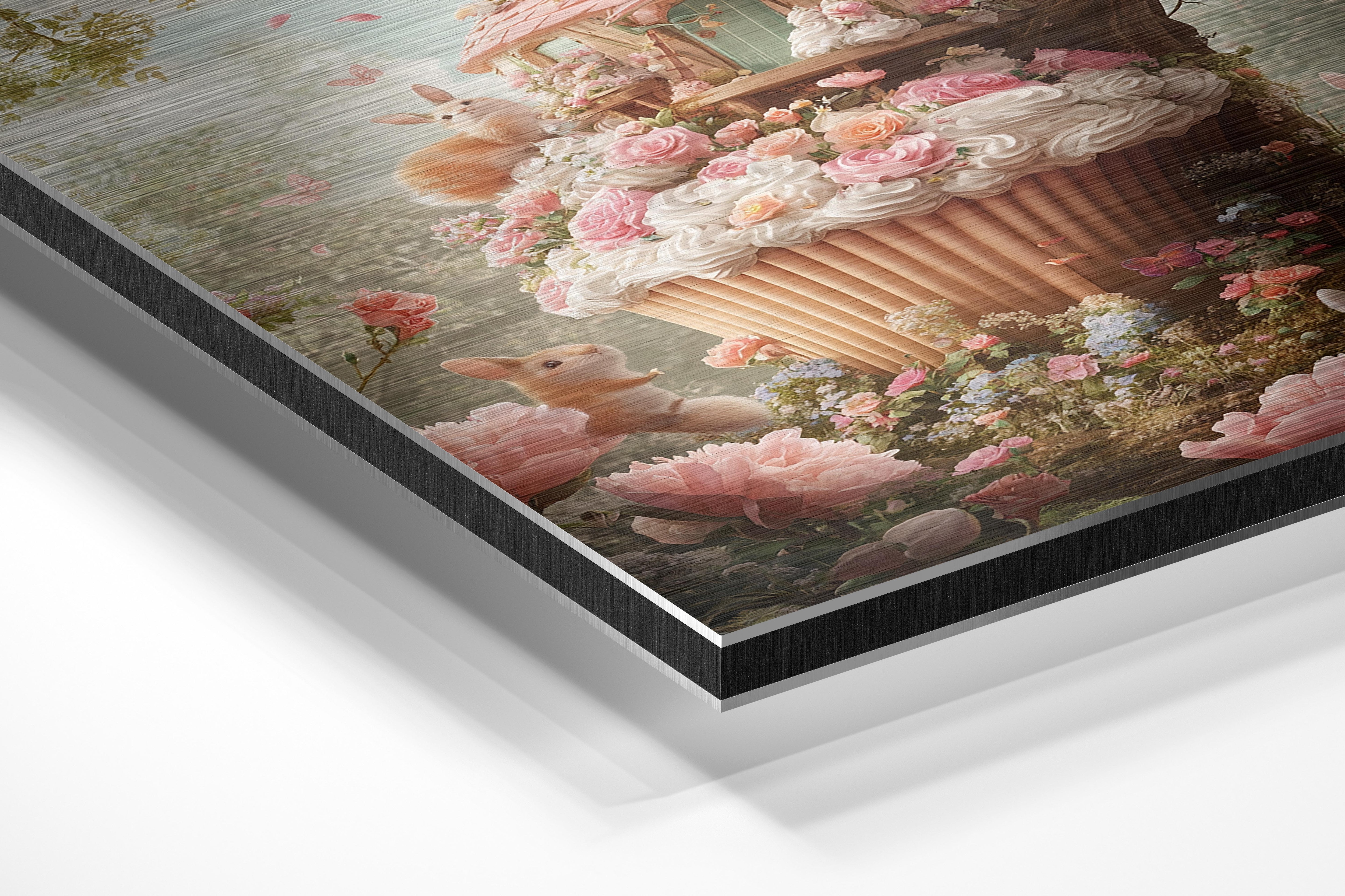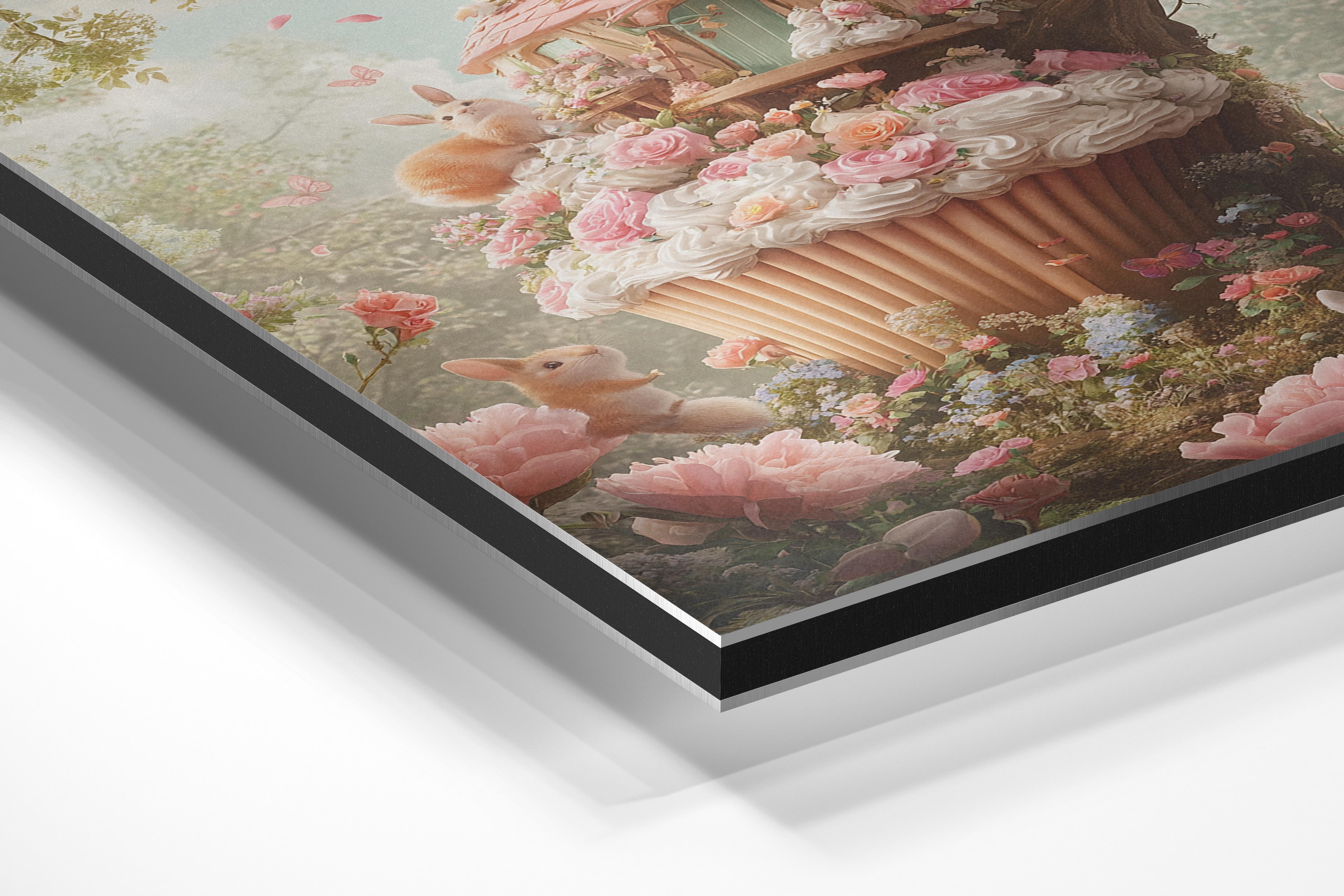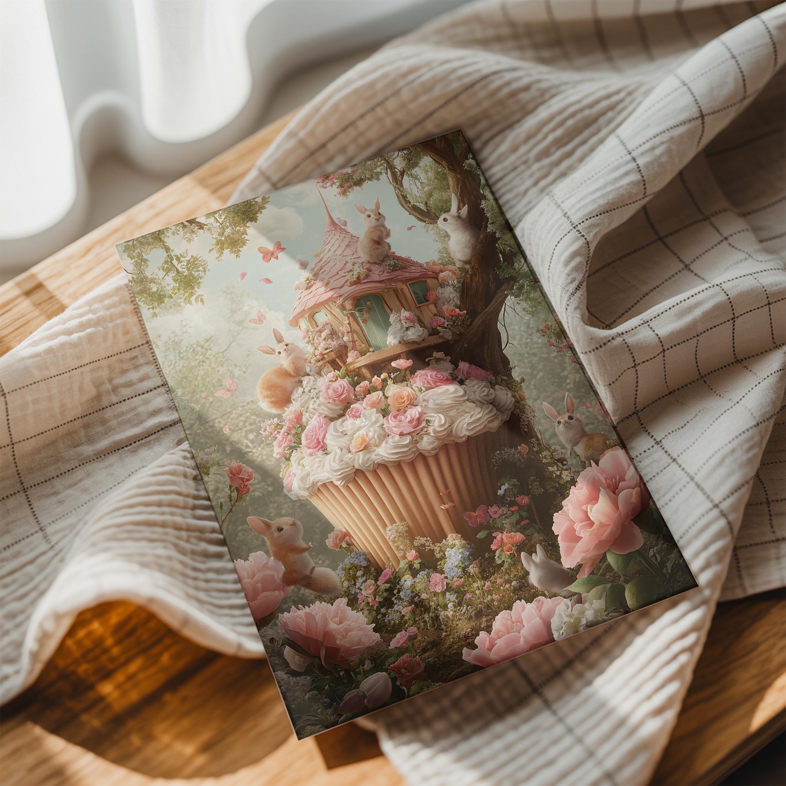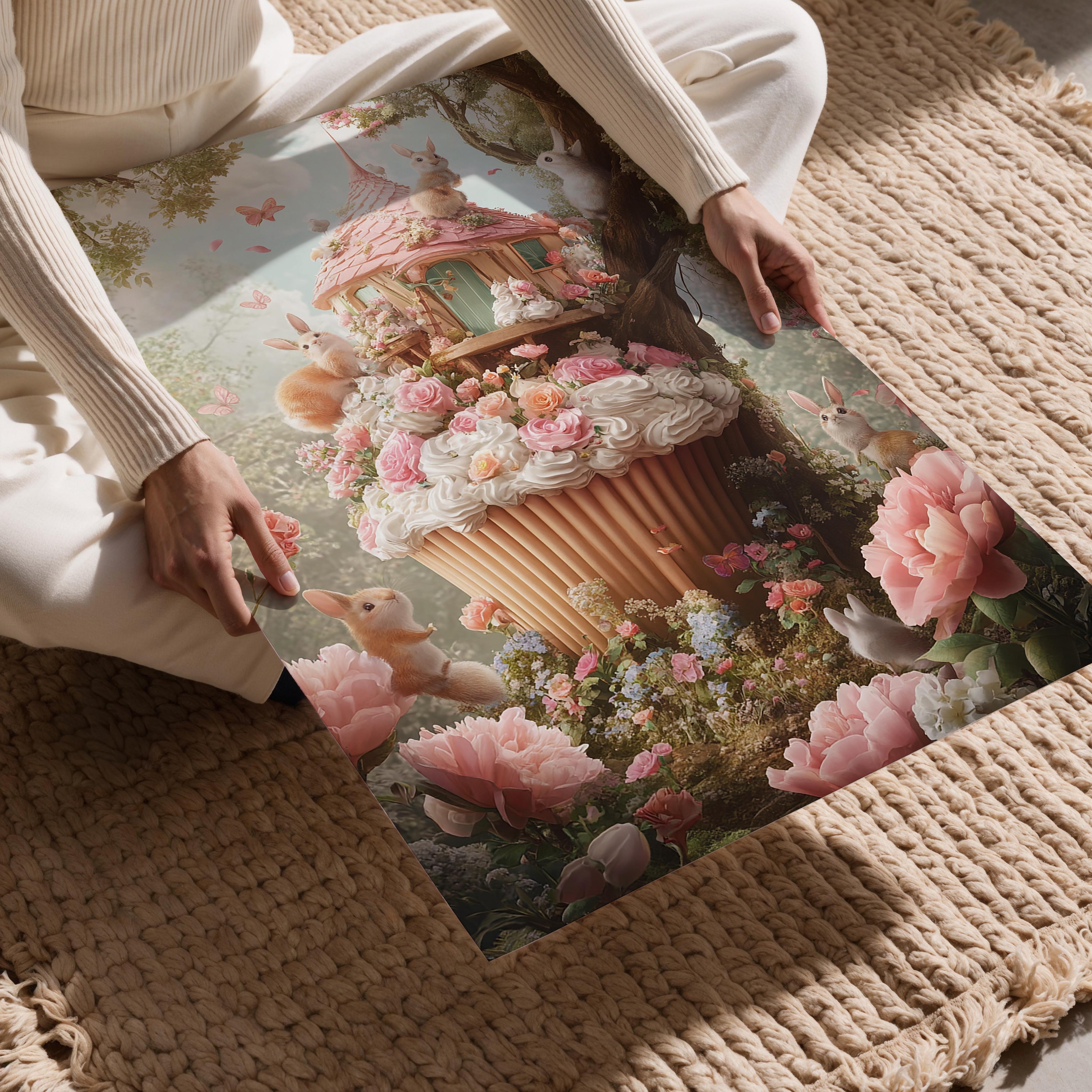 A fantastical cupcake-shaped house surrounded by playful bunnies in a lush, whimsical garden. This pastel-toned artwork captures a fairytale charm that would delight children and adults alike. The intricate detailing in the frosting, flowers, and bunny characters make it a true storytelling piece. Ideal for nursery walls or whimsical-themed rooms, this design brings joy and wonder to any space. It’s perfect for those who love imaginative and cute artwork that evokes happiness and creativity.