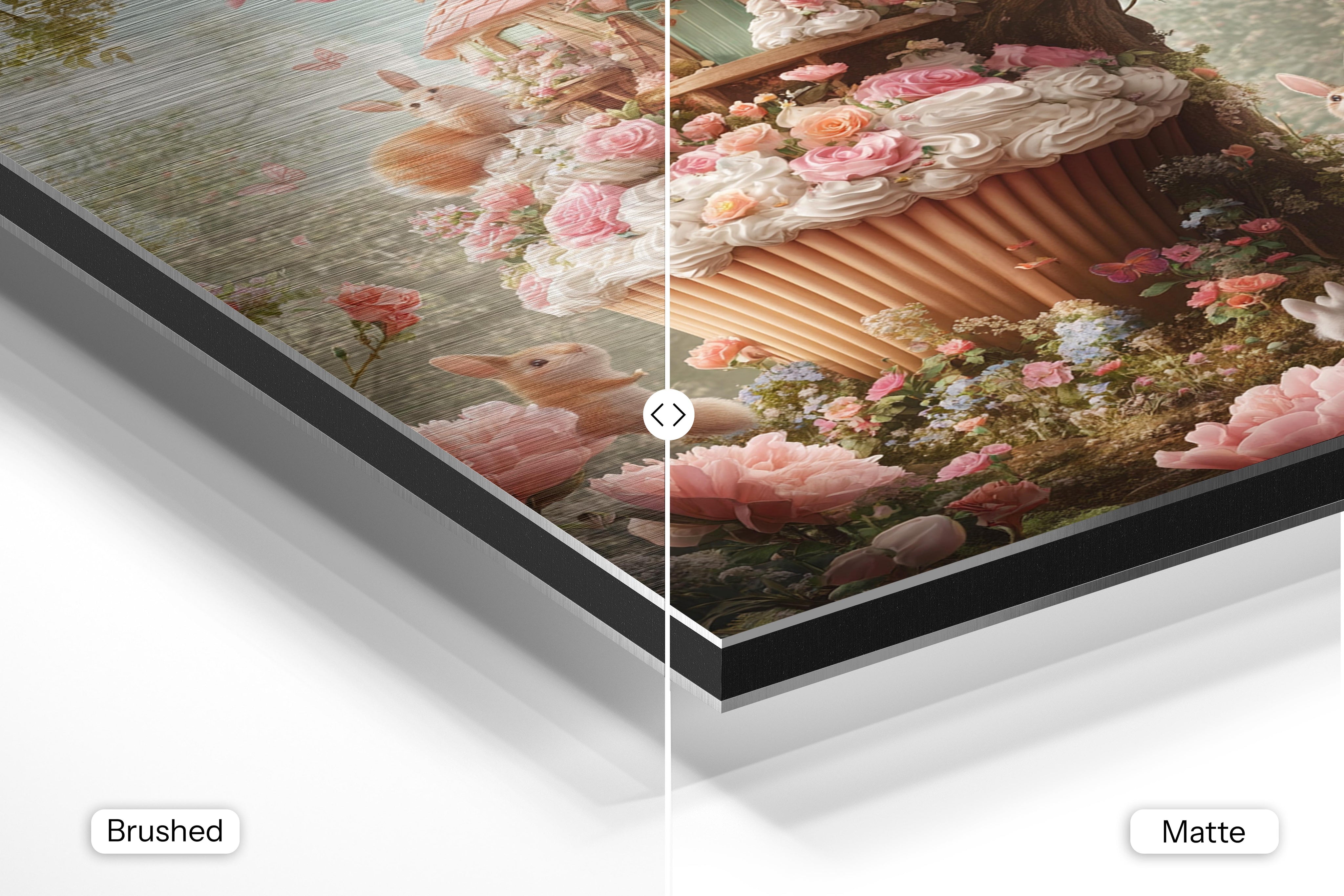 - Matte Aluminum offers a smooth, bright white surface that delivers crisp details and vibrant, true-to-life colors. With its non-reflective finish and subtle silky sheen, it’s perfect for photography, portraits, and colorful artwork—bringing a clean, polished look to any interior.