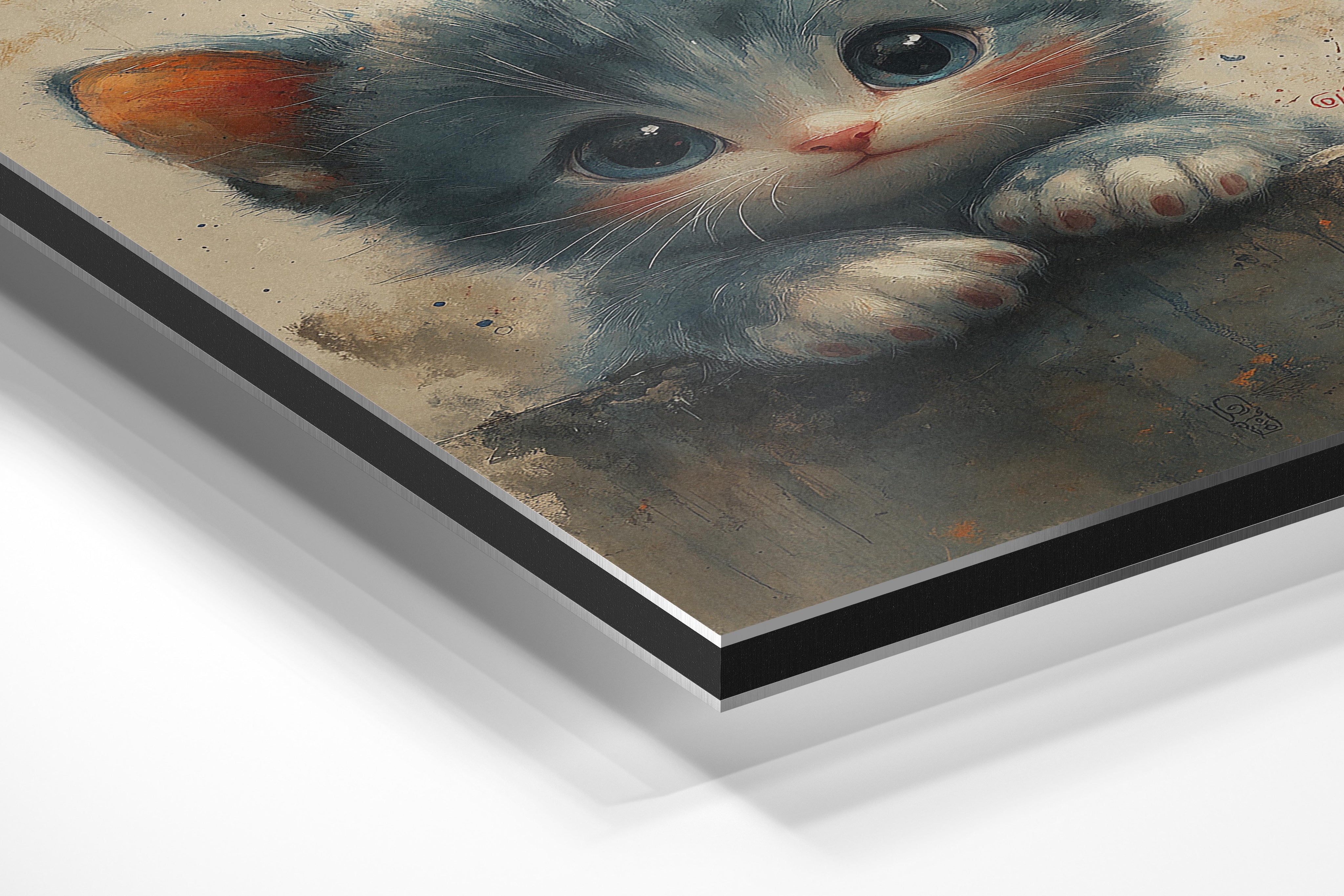 This adorable illustration features a wide-eyed kitten peering over an edge, its fluffy fur giving it an irresistibly soft appearance. The slightly distressed background adds an artistic touch, making the kitten’s gentle expression stand out even more. The painterly textures and subtle color palette enhance its dreamy and whimsical appeal, making it an excellent choice for children’s rooms, pet lovers, or any space that could benefit from a dose of sweetness. Whether displayed in a nursery or an office, this artwork brings a smile and a sense of innocent wonder to any viewer.