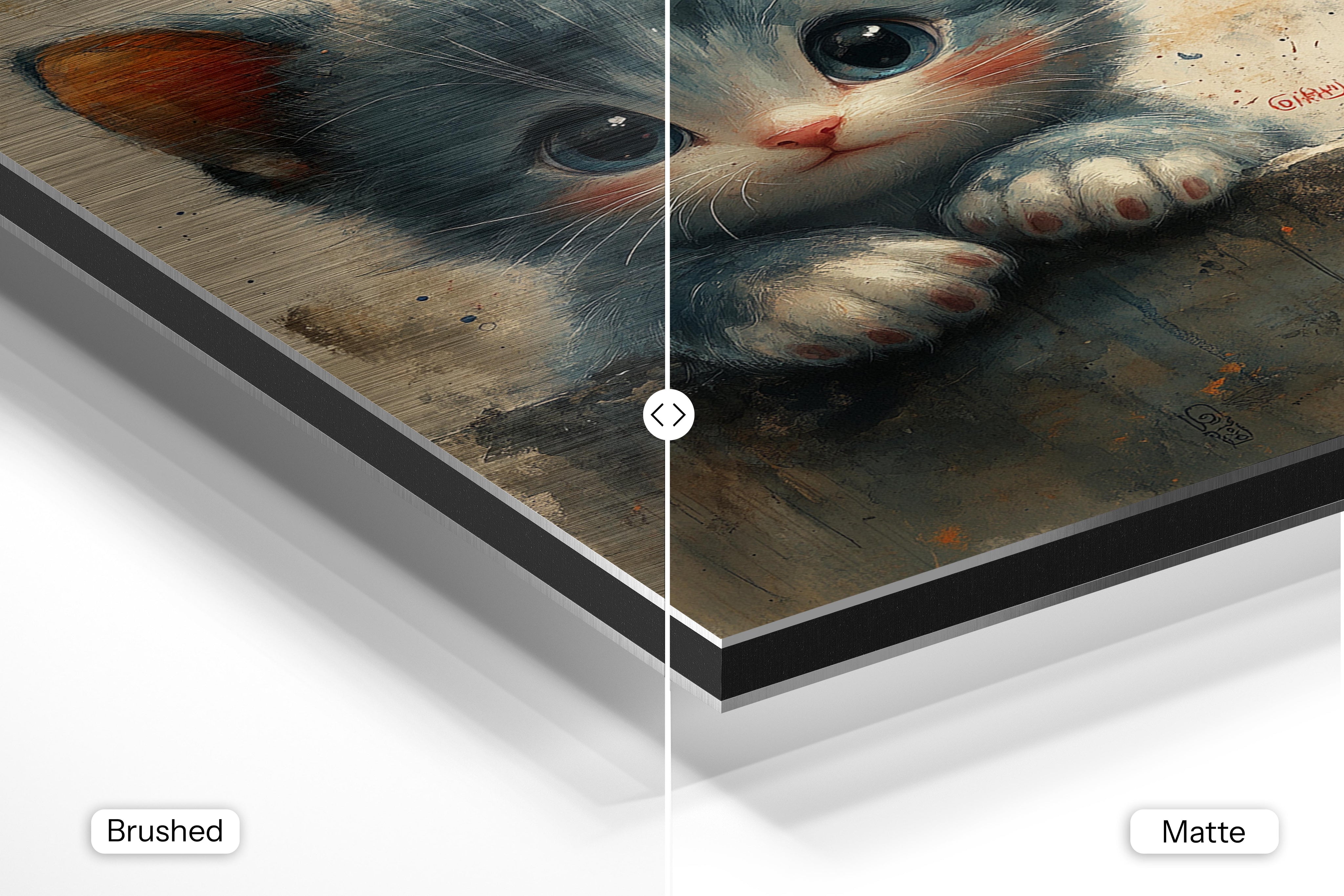 - Brushed Aluminum, on the other hand, features a raw metallic texture with visible brush strokes. Whites and highlights in your image let the silver surface show through, adding a dramatic, shimmering effect. Ideal for black-and-white images, minimalist designs, or abstract art, it creates a bold, industrial vibe with a modern edge.