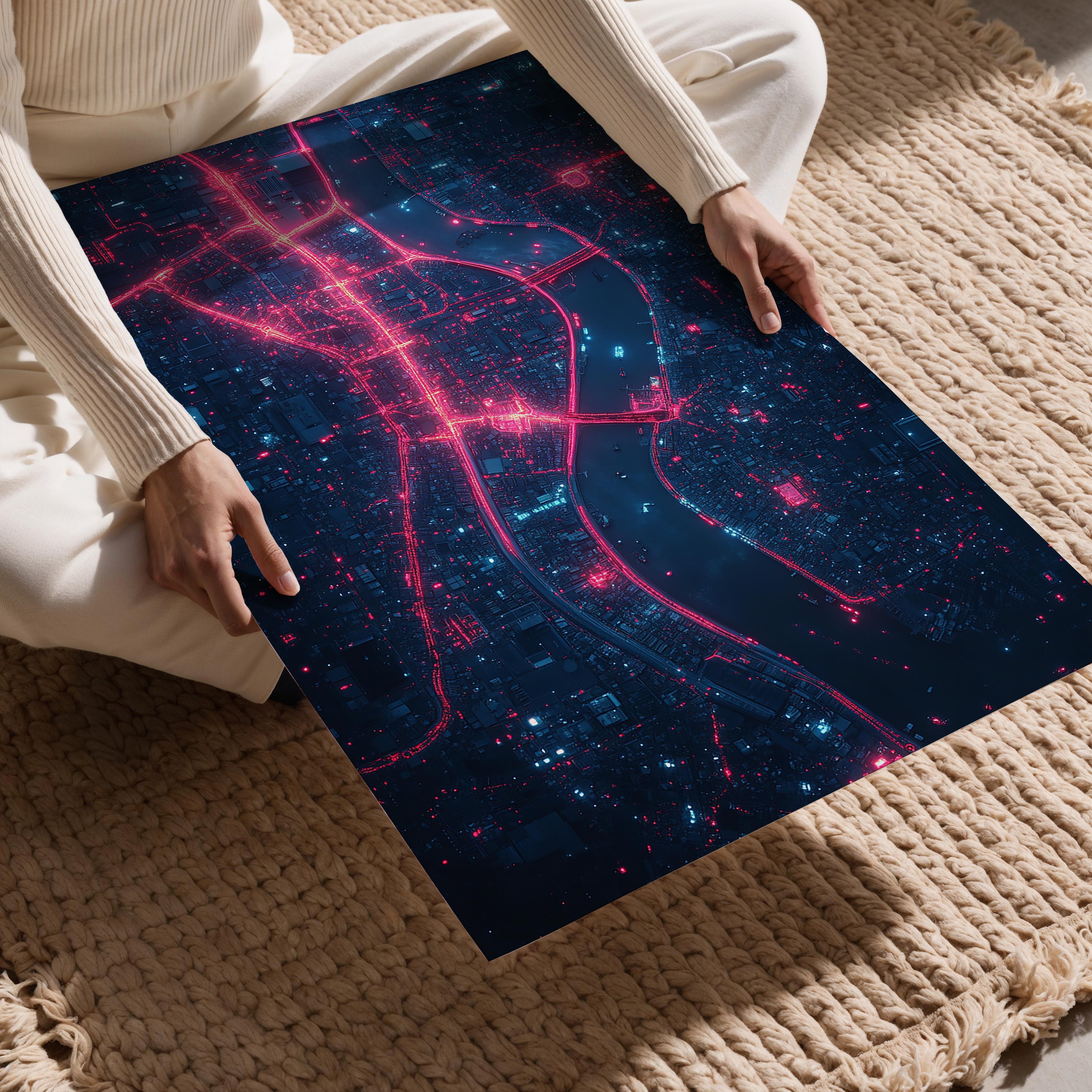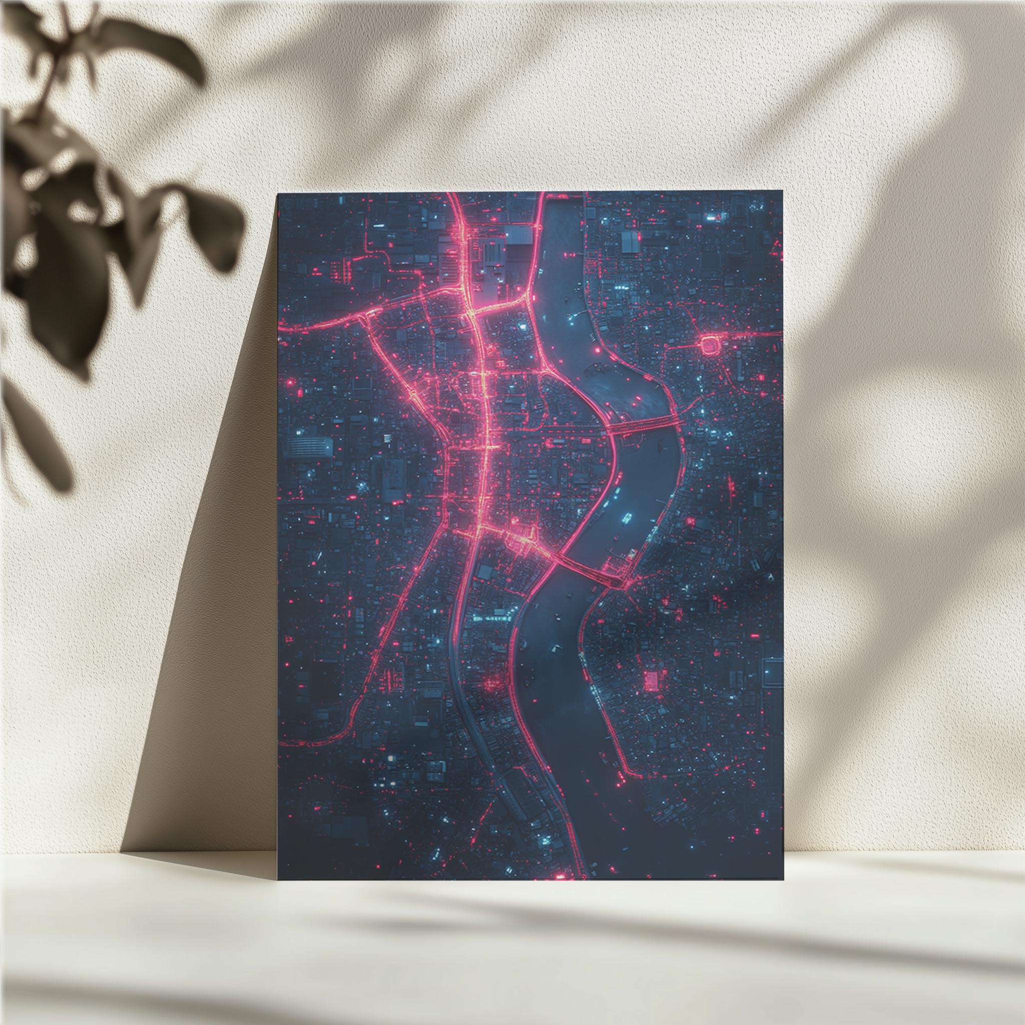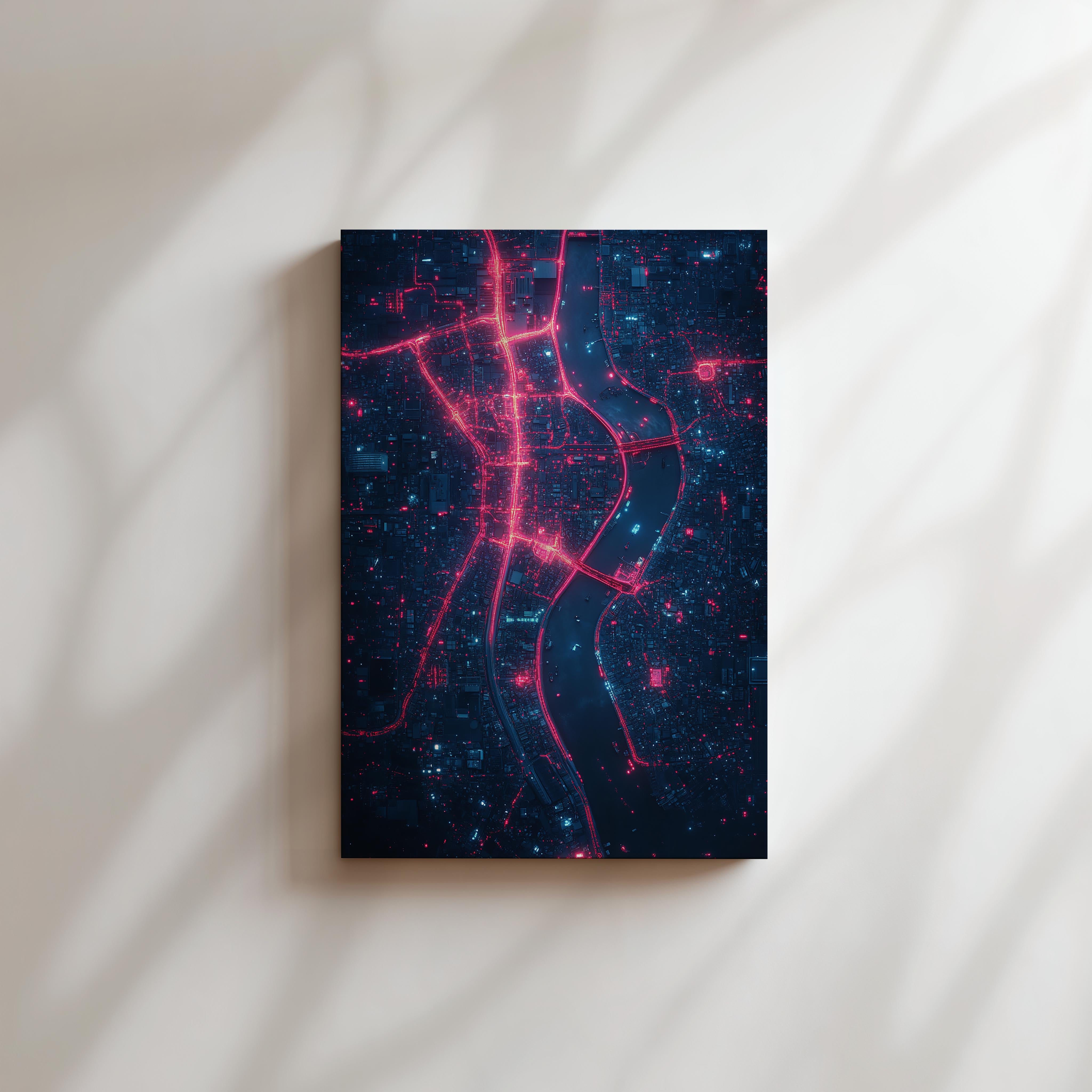 This glowing depiction of a futuristic cityscape captures the vibrancy of a tech-driven urban environment. With radiant pink lights intertwining with darkened buildings, the artwork feels alive with energy. Perfect for tech-themed rooms, gaming setups, or ultramodern office spaces, it exudes an atmosphere of innovation and boldness. The image’s depth and luminous details make it a stunning focal point for those drawn to the cyberpunk aesthetic or modern urban themes. It invites viewers to imagine the future of urban life.