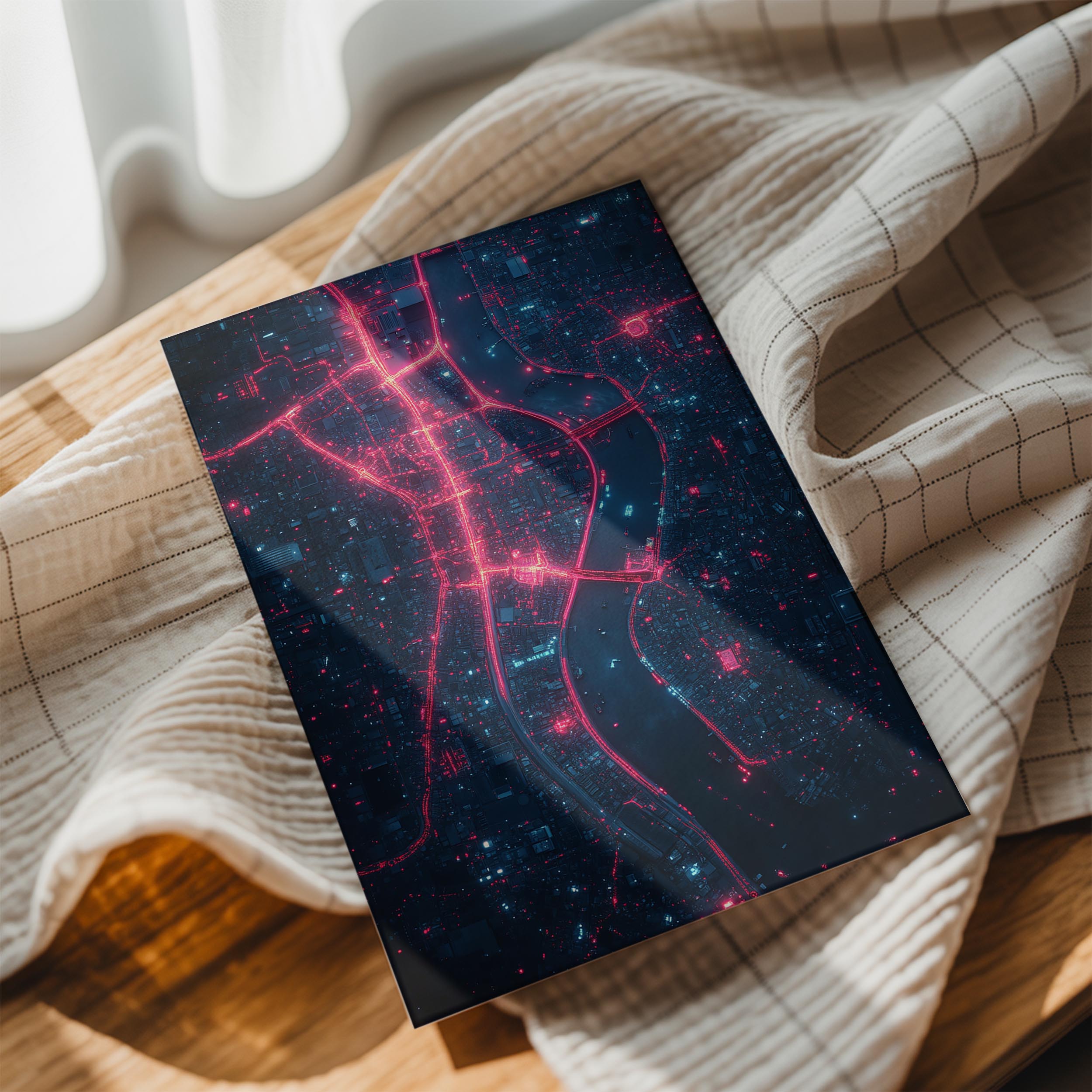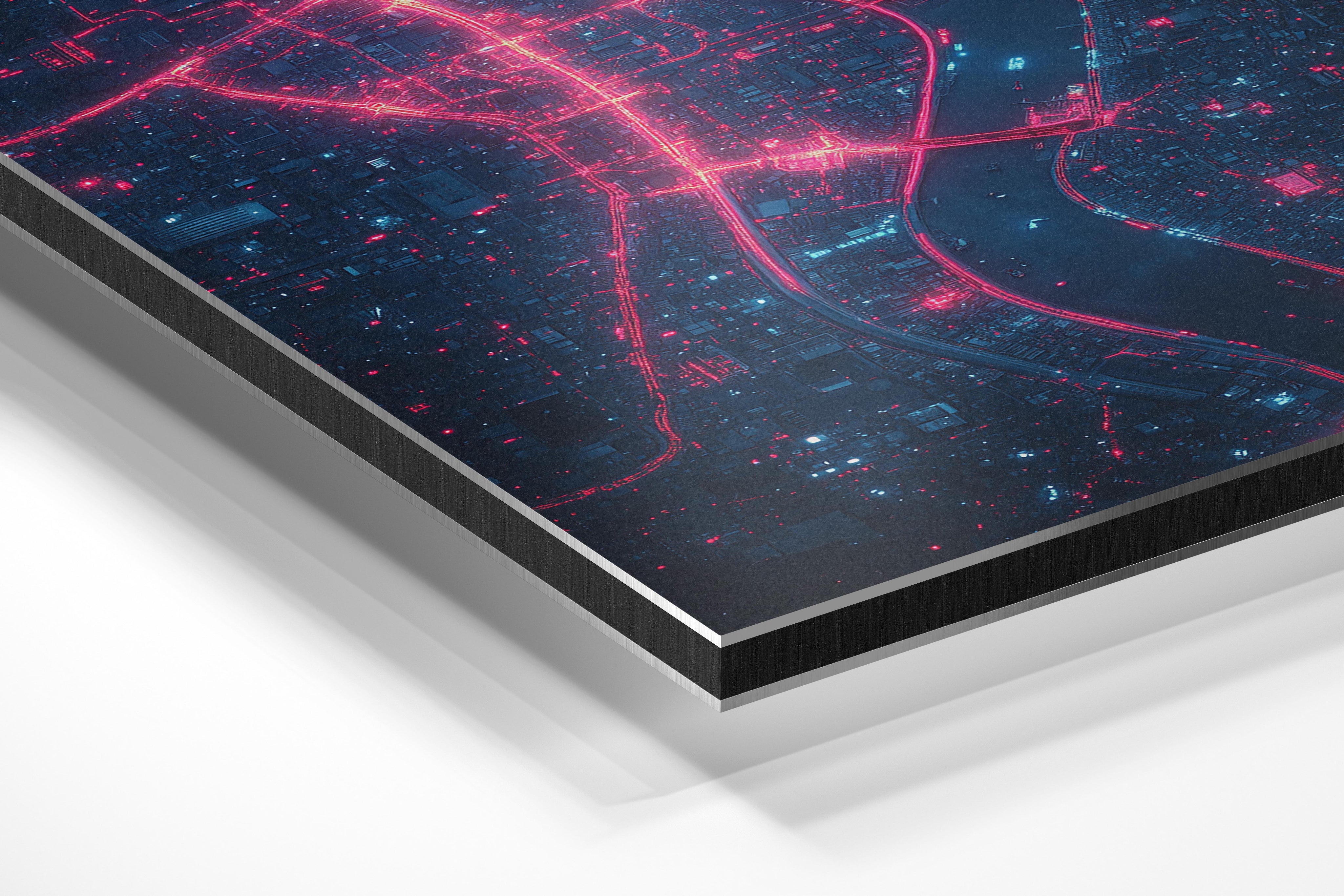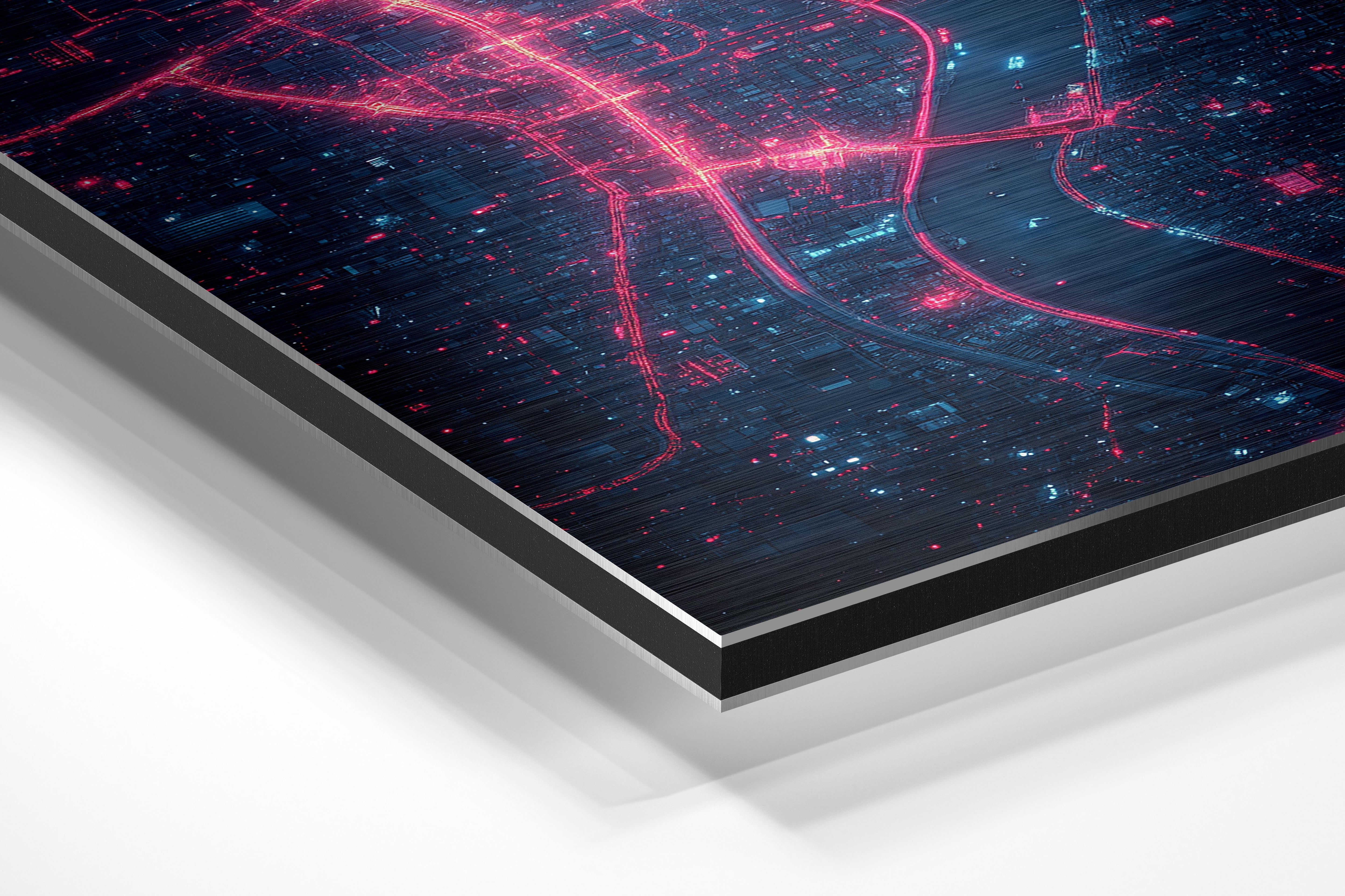 This glowing depiction of a futuristic cityscape captures the vibrancy of a tech-driven urban environment. With radiant pink lights intertwining with darkened buildings, the artwork feels alive with energy. Perfect for tech-themed rooms, gaming setups, or ultramodern office spaces, it exudes an atmosphere of innovation and boldness. The image’s depth and luminous details make it a stunning focal point for those drawn to the cyberpunk aesthetic or modern urban themes. It invites viewers to imagine the future of urban life.