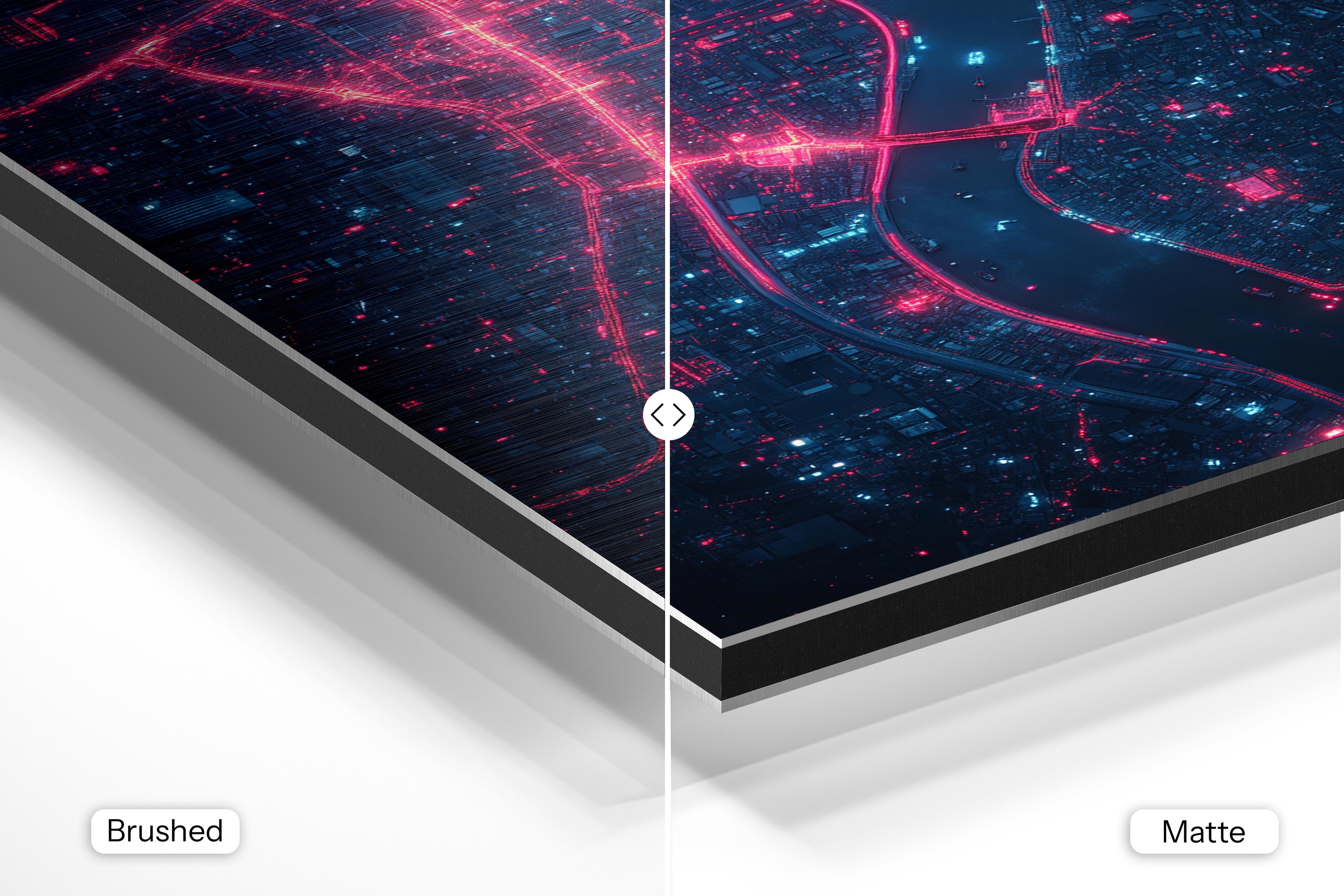 - Brushed Aluminum, on the other hand, features a raw metallic texture with visible brush strokes. Whites and highlights in your image let the silver surface show through, adding a dramatic, shimmering effect. Ideal for black-and-white images, minimalist designs, or abstract art, it creates a bold, industrial vibe with a modern edge.